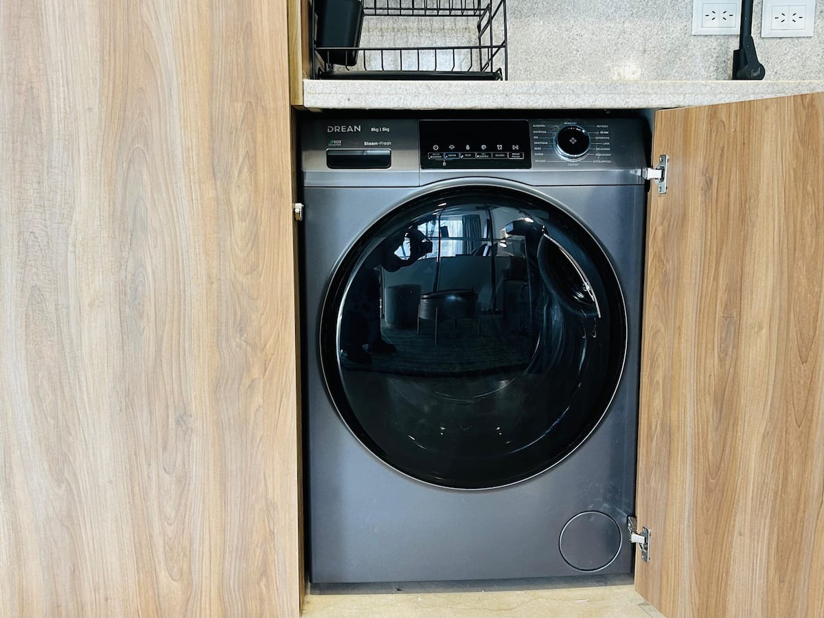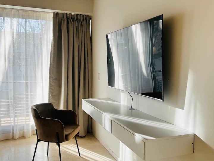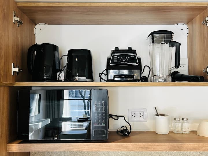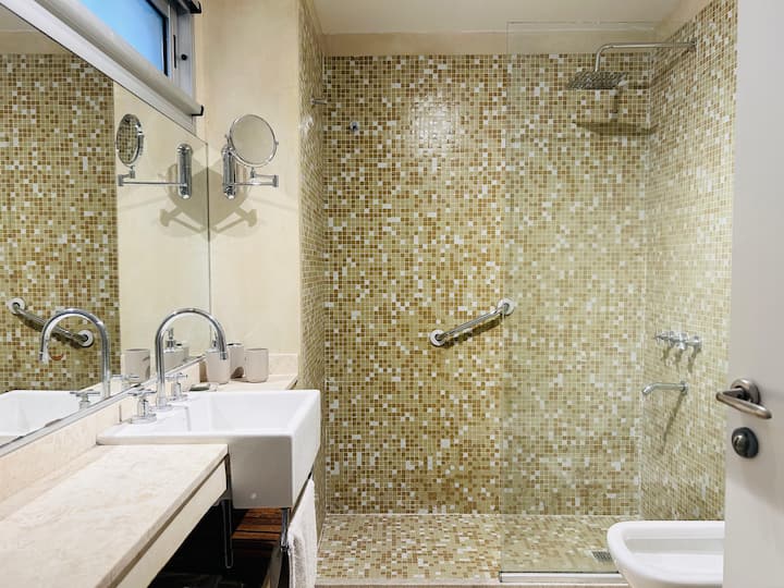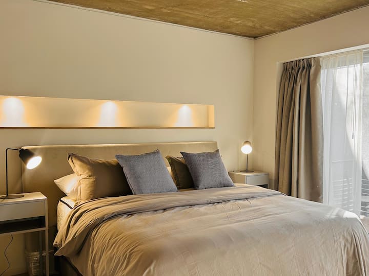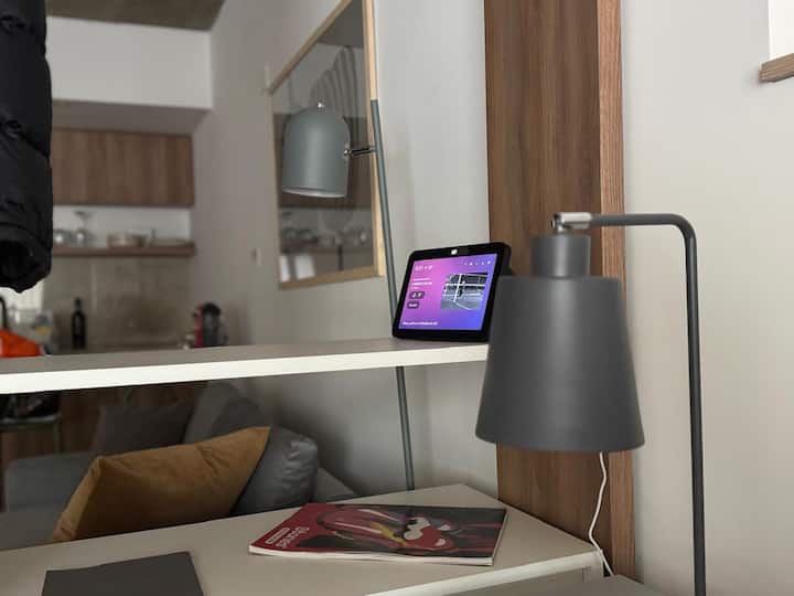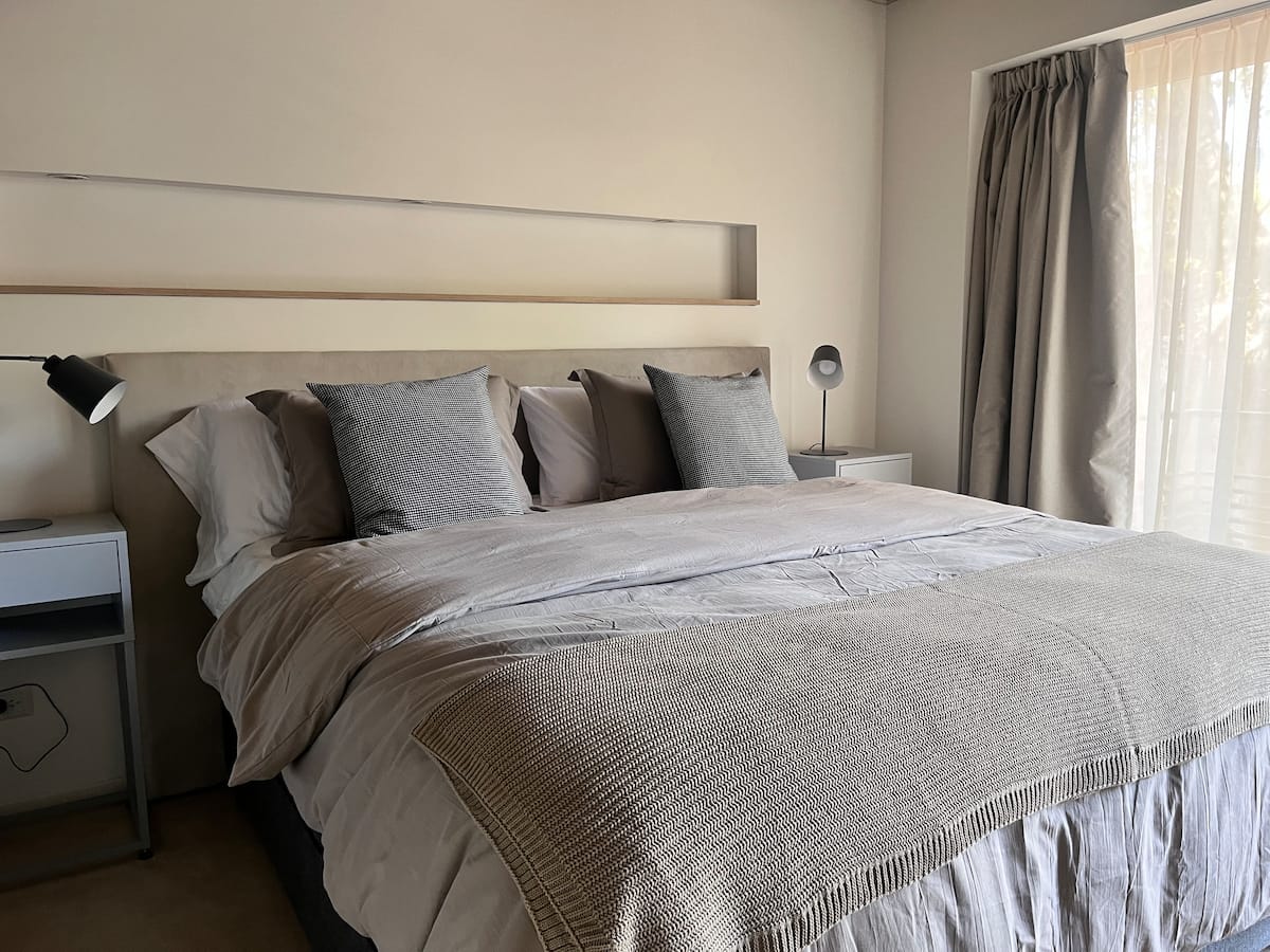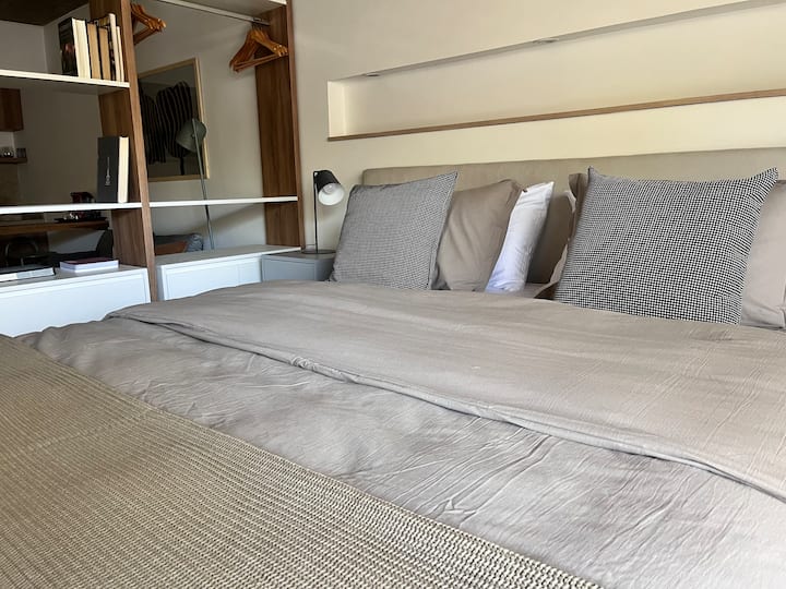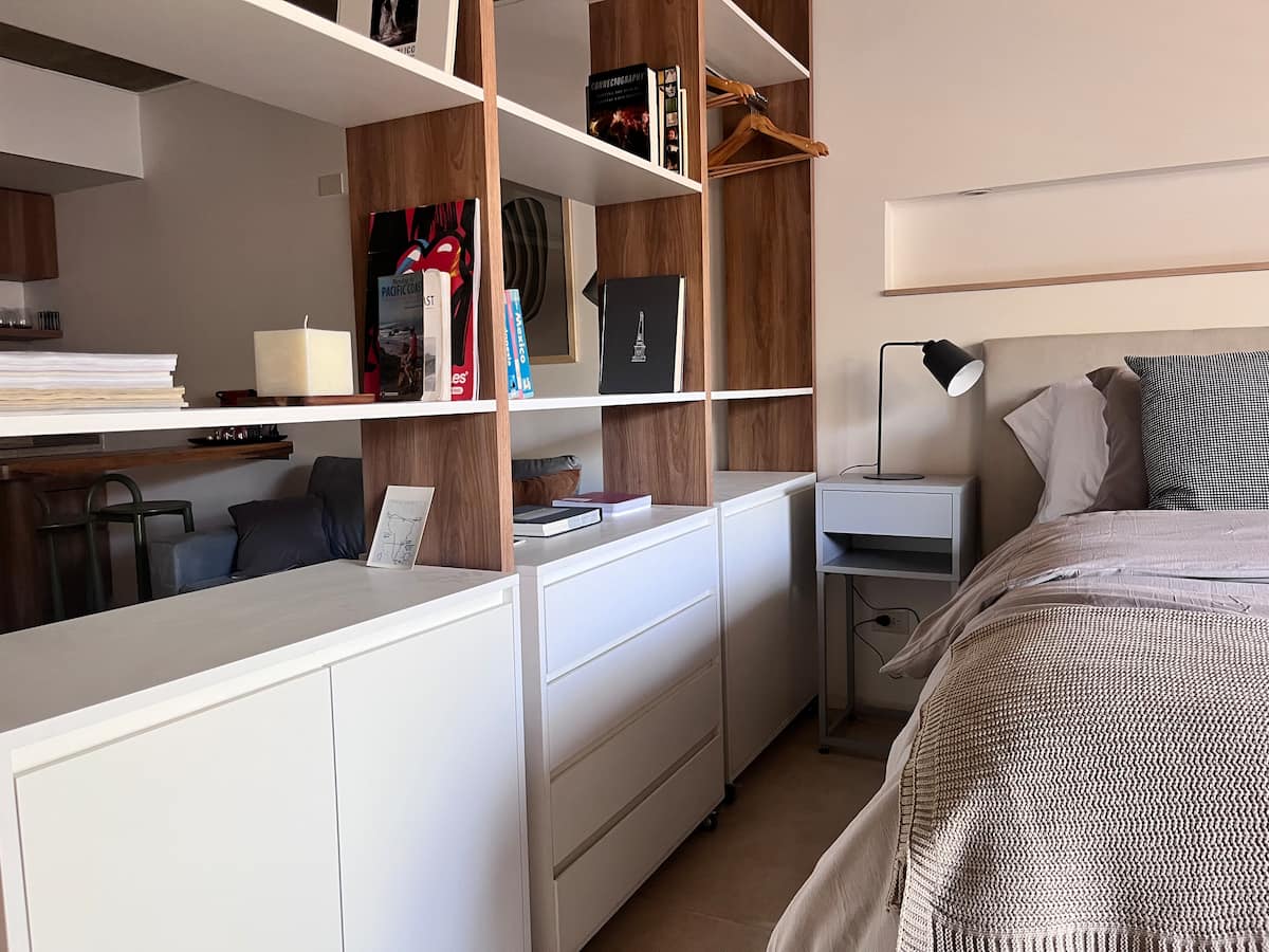 Apartamento em Palermo Hollywood com 1 quarto. Inclui máquina de lavar e secar roupa, cafeteira Nespresso e acesso a uma piscina na temporada de verão. Há cama king-size que pode ser dividida em 2 camas de solteiro, além de área de estar separada do quarto por uma estante e espaço de armazenamento.