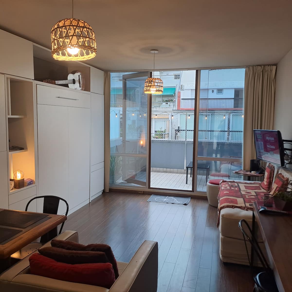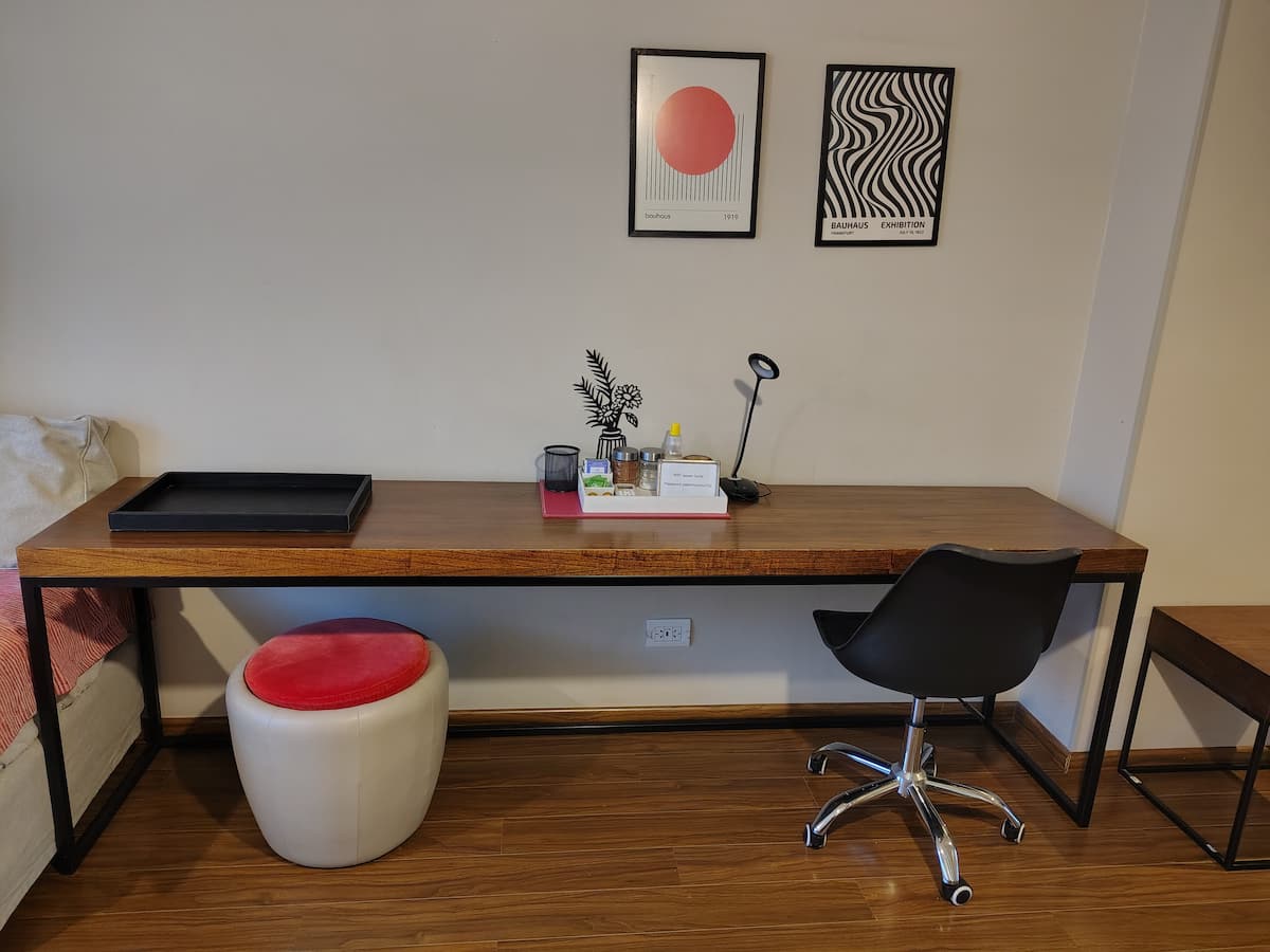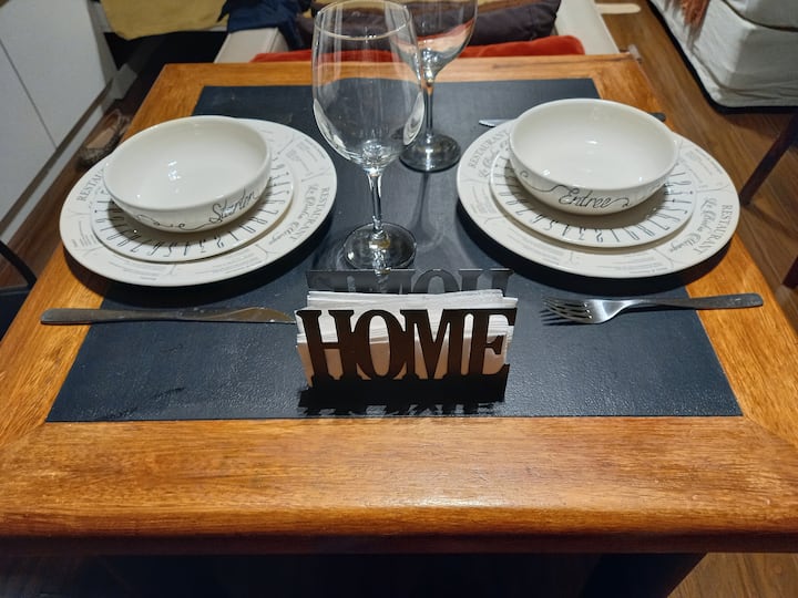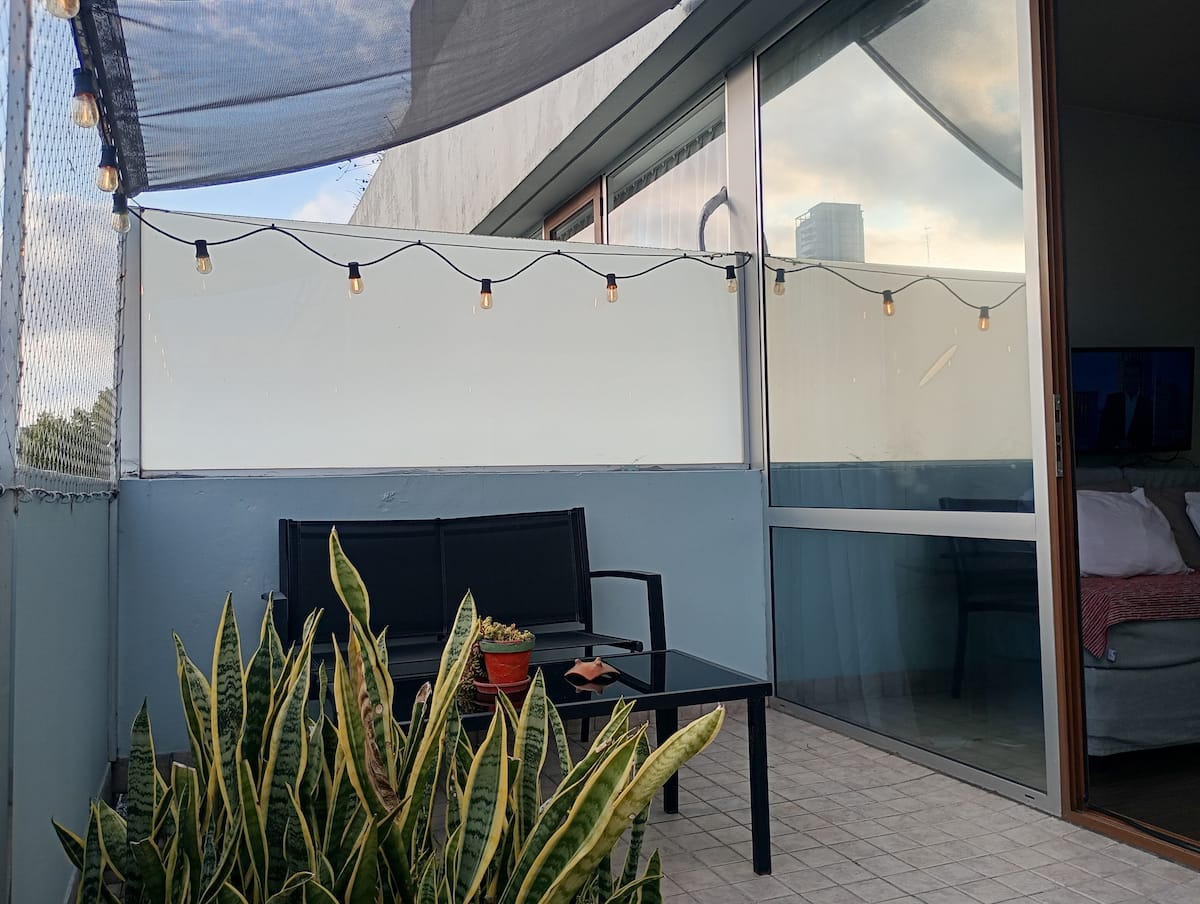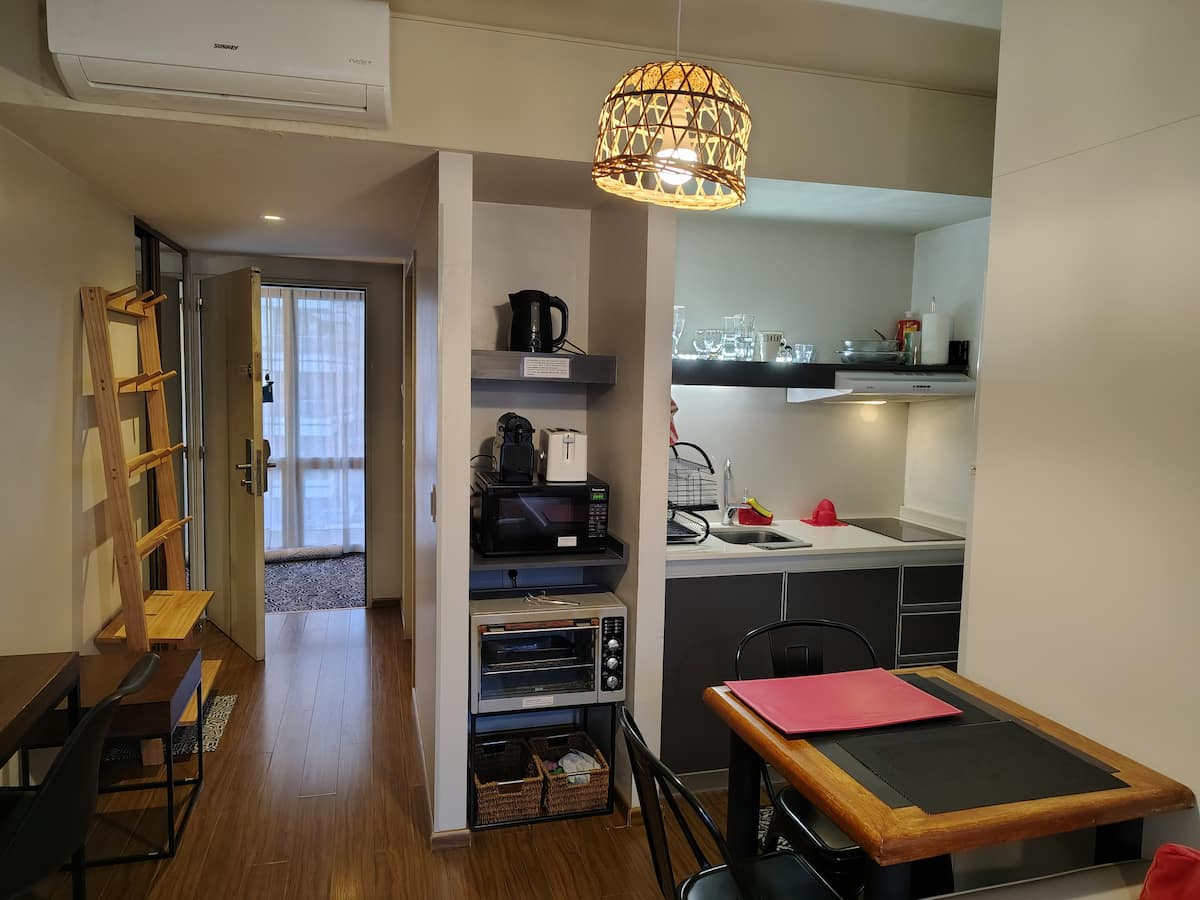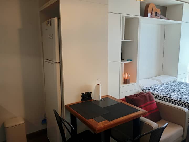 Kitnet mobiliada com área externa aberta e terraço. Cozinha equipada para uso diário e Smart TV de 43 polegadas. Internet de alta velocidade.