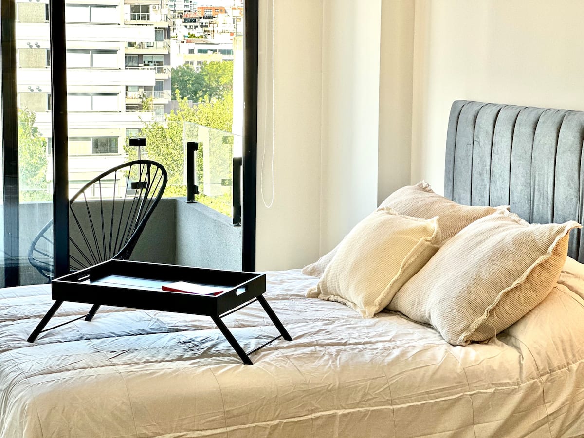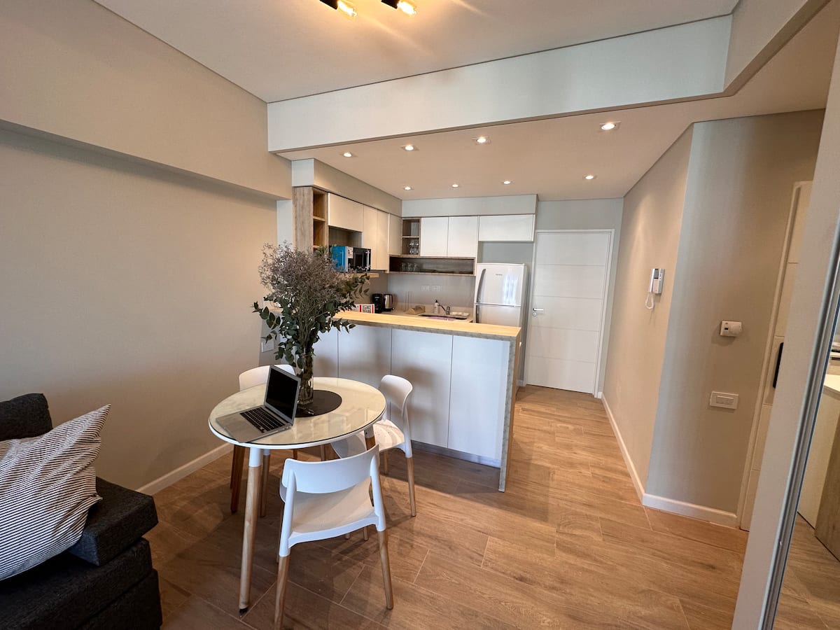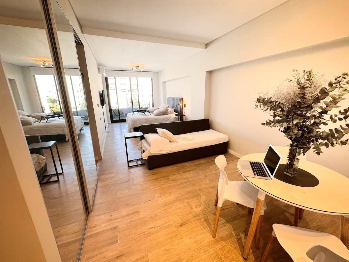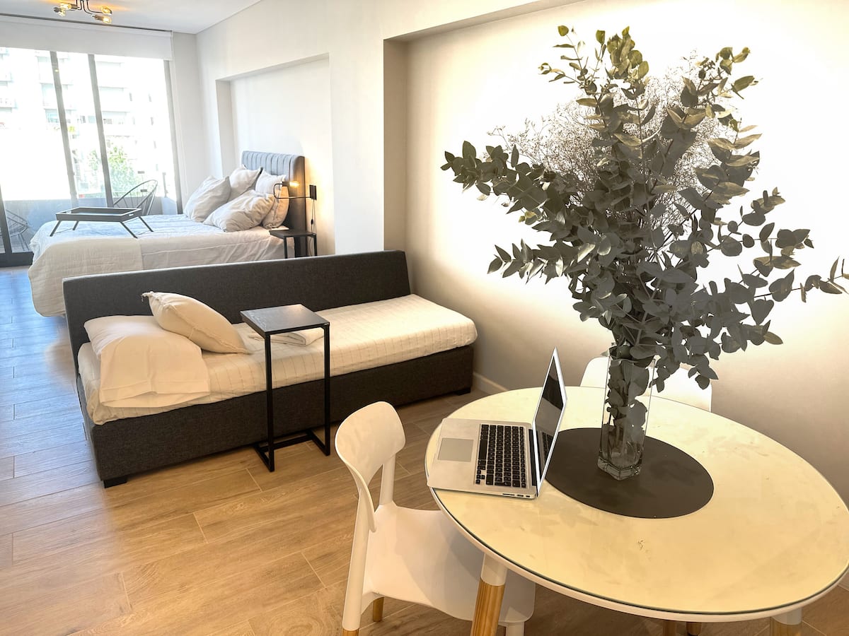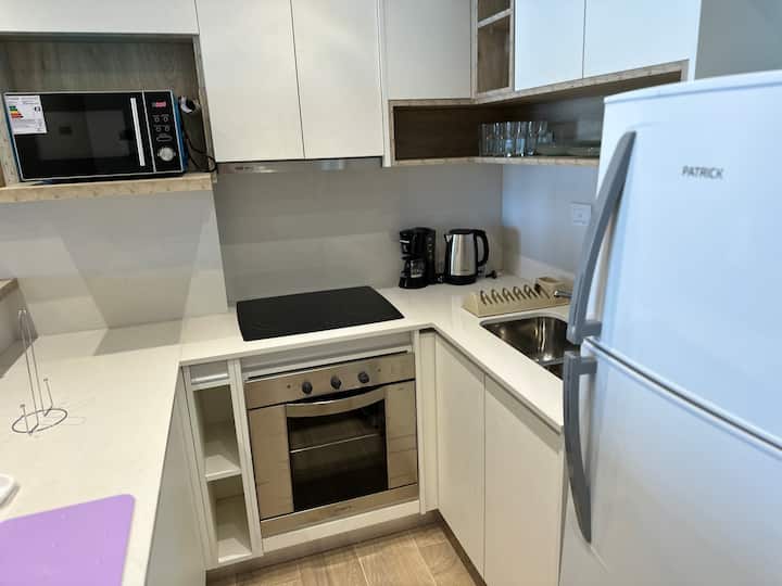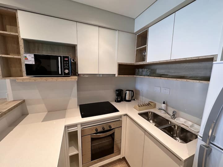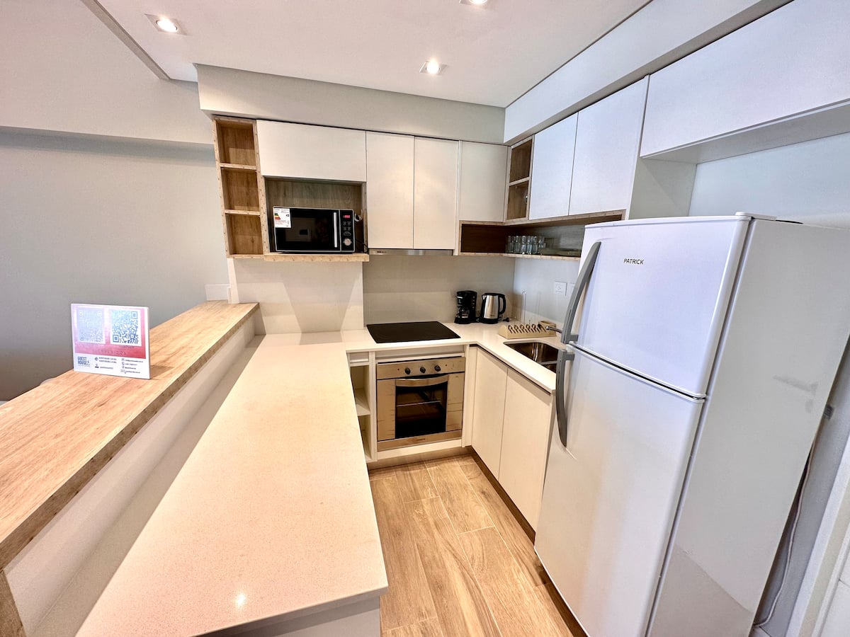 Kitnet mobiliada em Palermo Hollywood, em prédio novo. A unidade tem varanda ampla, cama queen-size, sofá-cama e Smart TV de 43”. A cozinha traz fogão cerâmico de 4 bocas, forno elétrico, micro-ondas digital e geladeira com freezer, além de utensílios. O prédio oferece piscina na cobertura, área de churrasco (grill), lavanderia e SUM, com acesso por fechadura digital e portaria com segurança 24 horas. Internet Wi-Fi de alta velocidade e check-in automático 24 horas estão disponíveis.