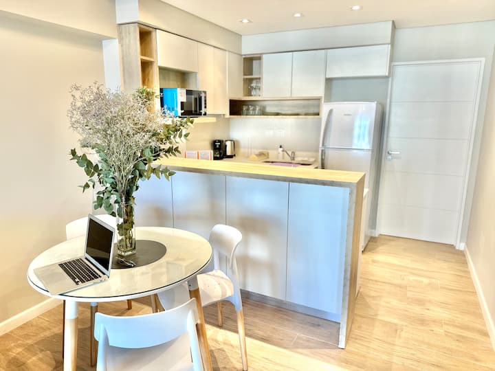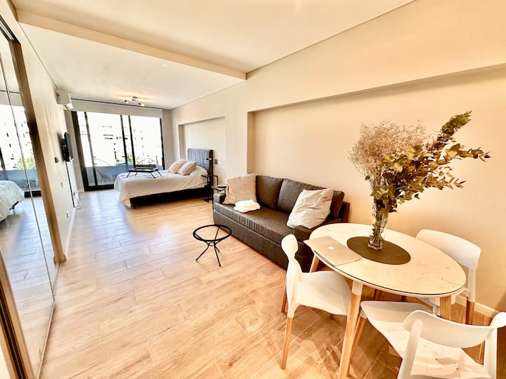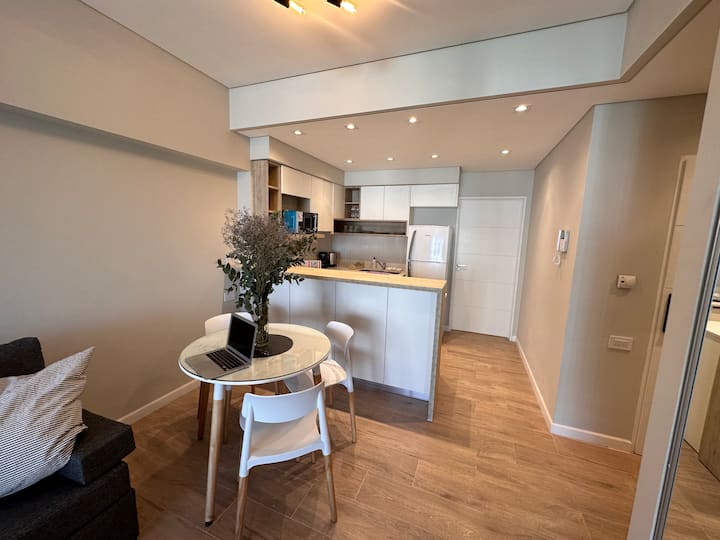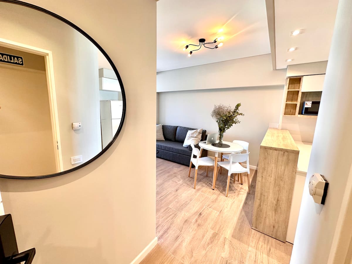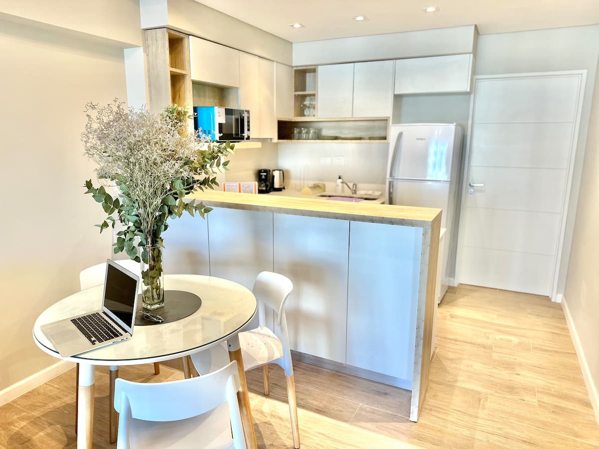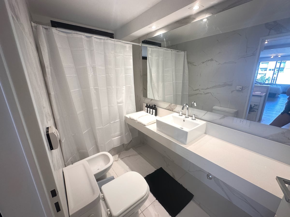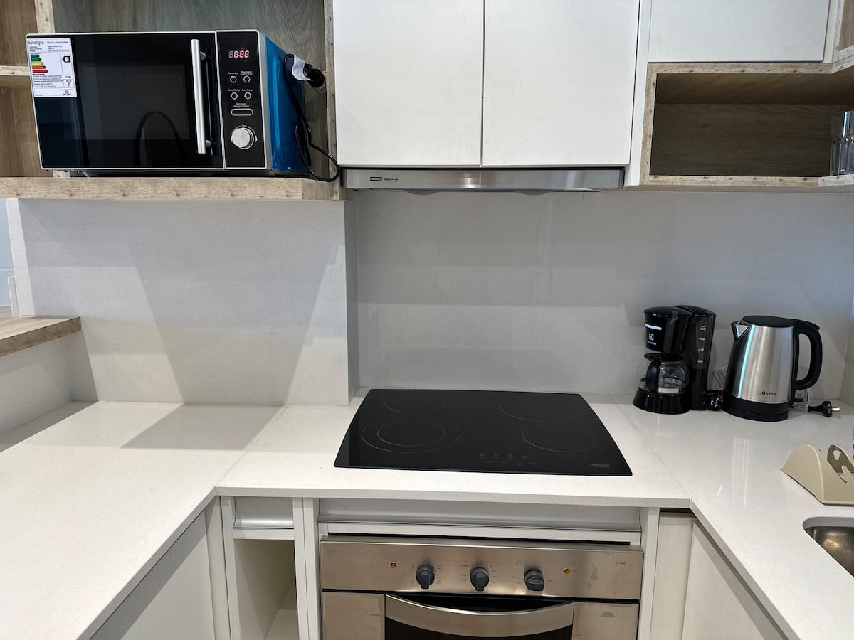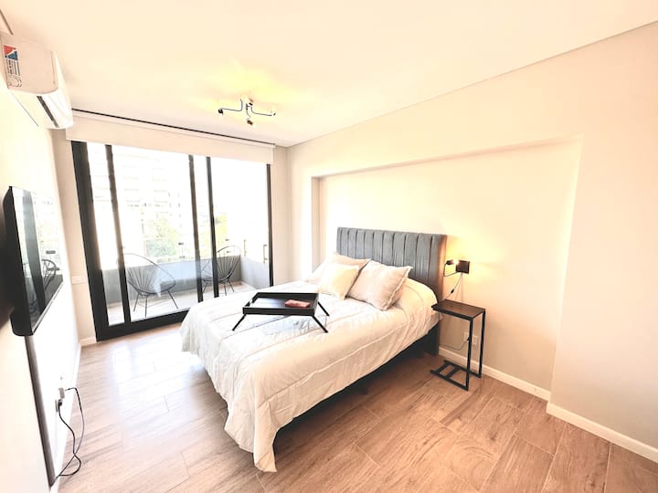 Kitnet mobiliada em Palermo Hollywood, em prédio novo. A unidade tem varanda ampla, cama queen-size, sofá-cama e Smart TV de 43”. A cozinha traz fogão cerâmico de 4 bocas, forno elétrico, micro-ondas digital e geladeira com freezer, além de utensílios. O prédio oferece piscina na cobertura, área de churrasco (grill), lavanderia e SUM, com acesso por fechadura digital e portaria com segurança 24 horas. Internet Wi-Fi de alta velocidade e check-in automático 24 horas estão disponíveis.