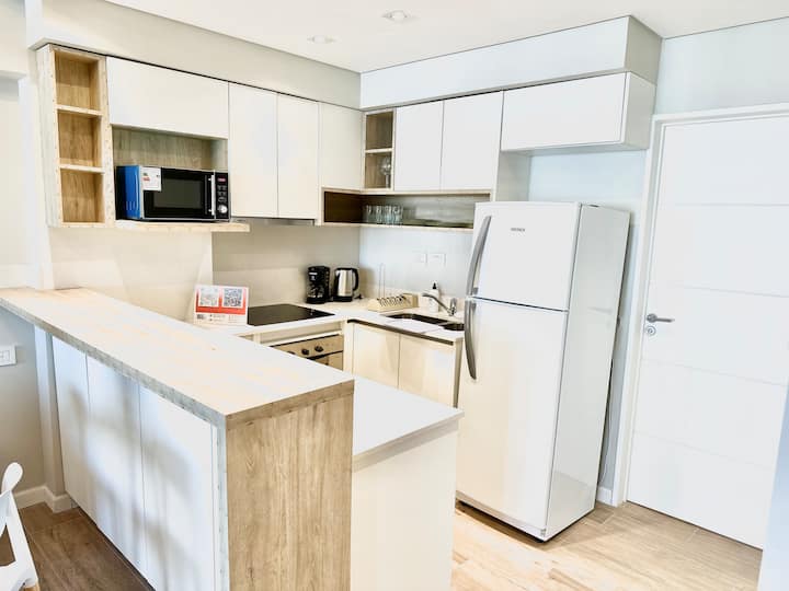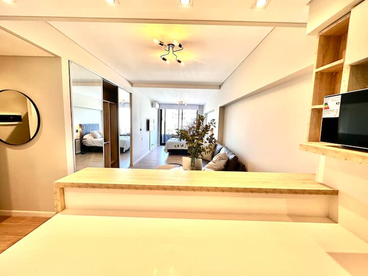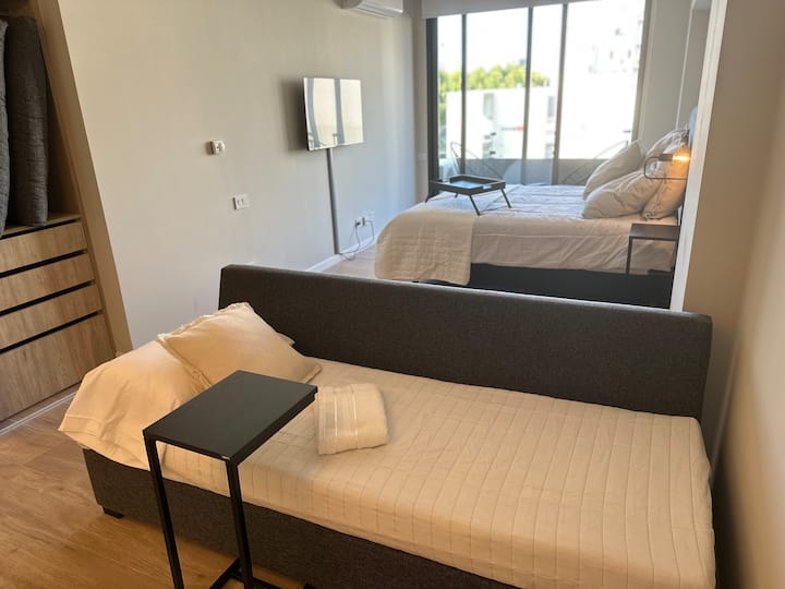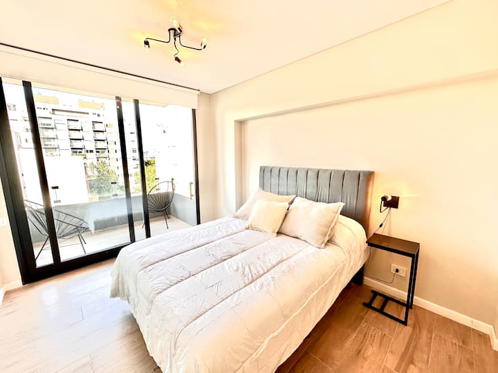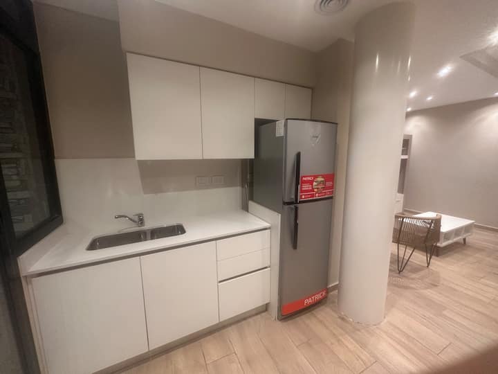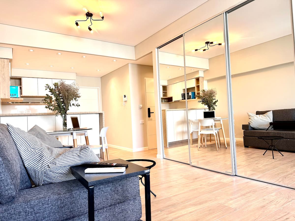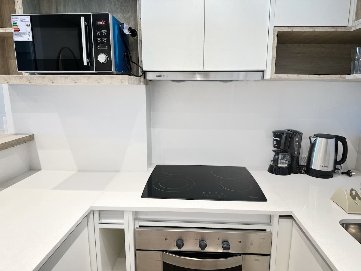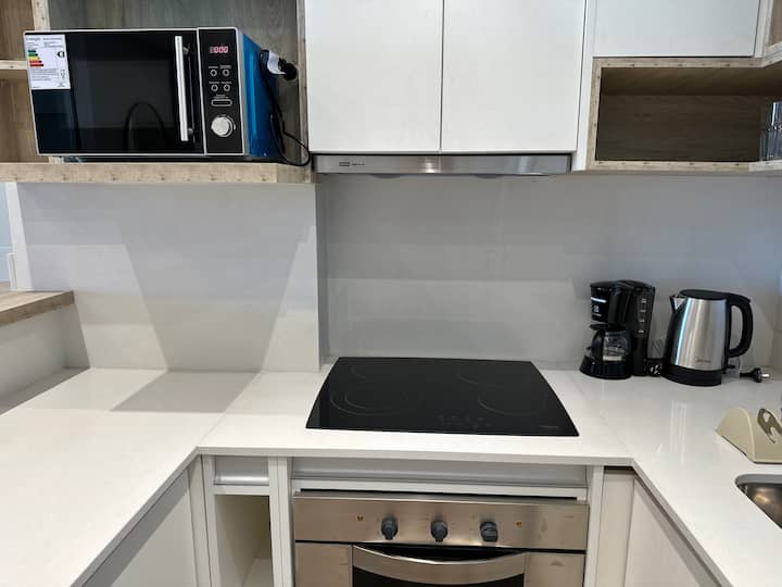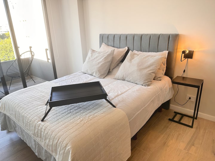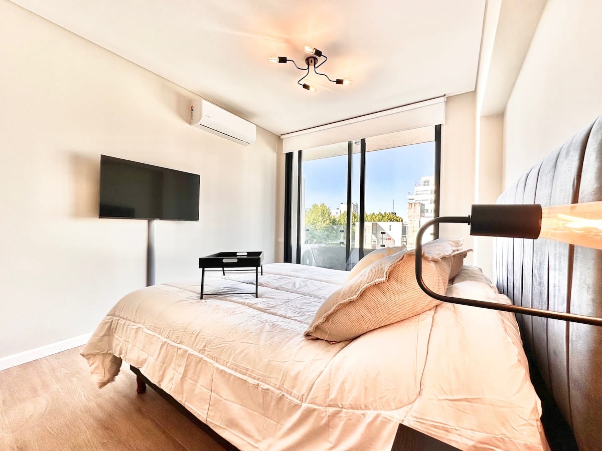 Kitnet mobiliada em Palermo Hollywood, em prédio novo. A unidade tem varanda ampla, cama queen-size, sofá-cama e Smart TV de 43”. A cozinha traz fogão cerâmico de 4 bocas, forno elétrico, micro-ondas digital e geladeira com freezer, além de utensílios. O prédio oferece piscina na cobertura, área de churrasco (grill), lavanderia e SUM, com acesso por fechadura digital e portaria com segurança 24 horas. Internet Wi-Fi de alta velocidade e check-in automático 24 horas estão disponíveis.