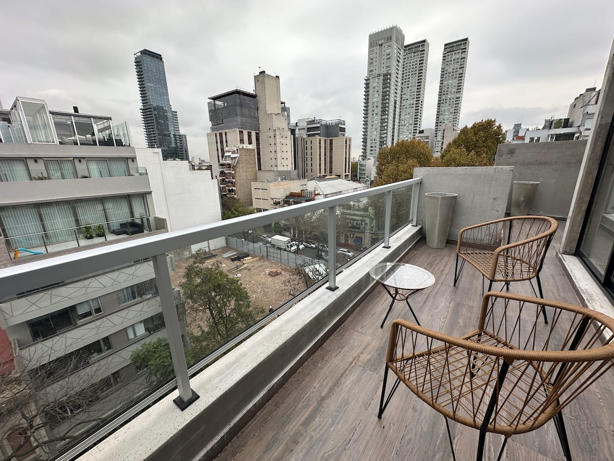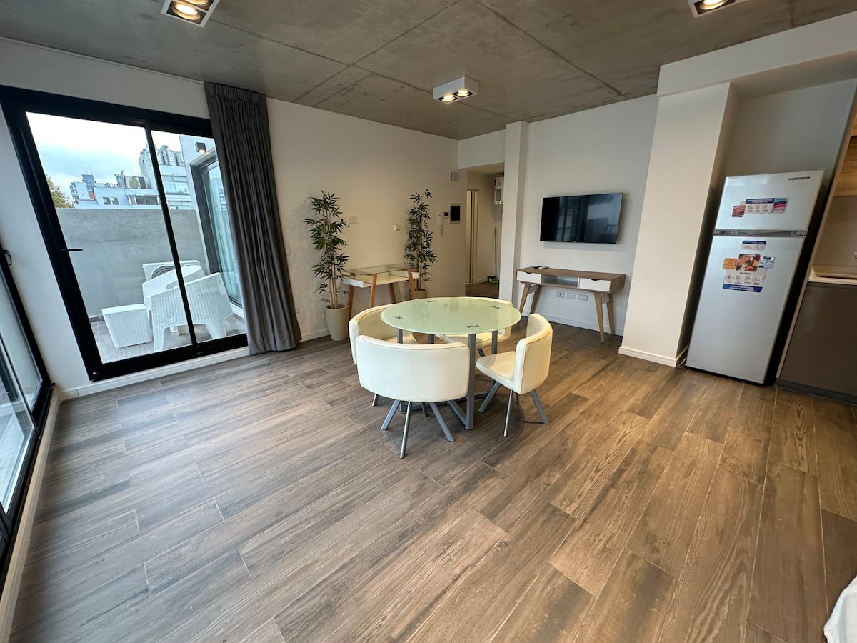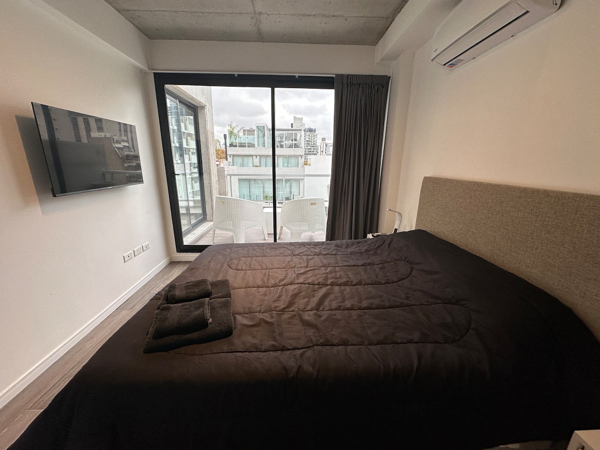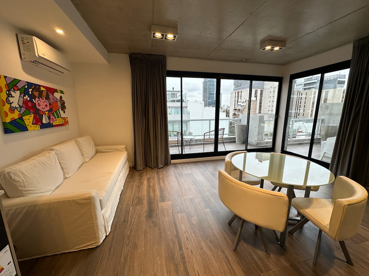 Apartamento de 2 ambientes em Palermo Hollywood. O imóvel tem 1 cama de casal e pode acomodar 2 pessoas; é possível solicitar 1 ou 2 colchões infláveis para hóspedes adicionais e há berços disponíveis gratuitamente. Segundo o anúncio, o apartamento é mobiliado e totalmente equipado, com cozinha e itens para estadia.