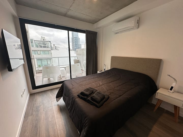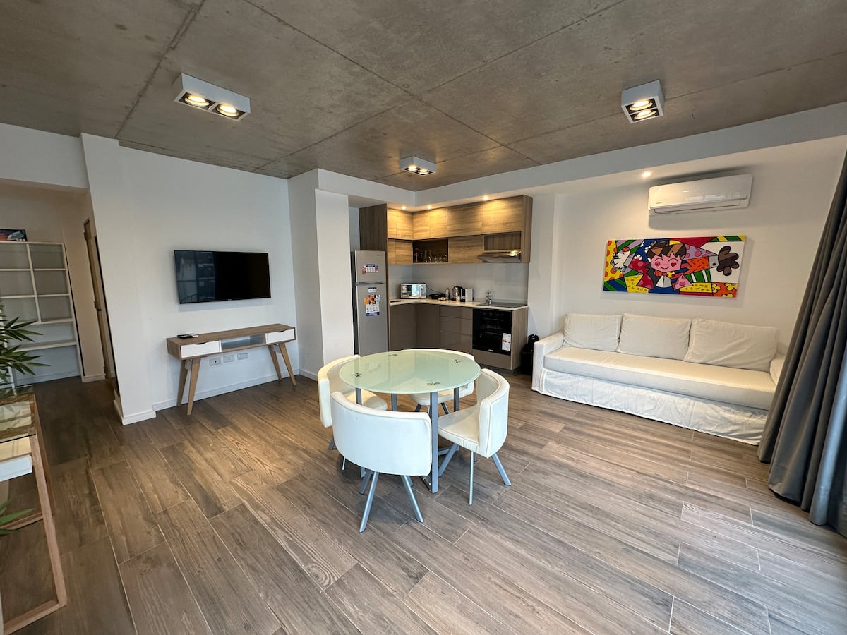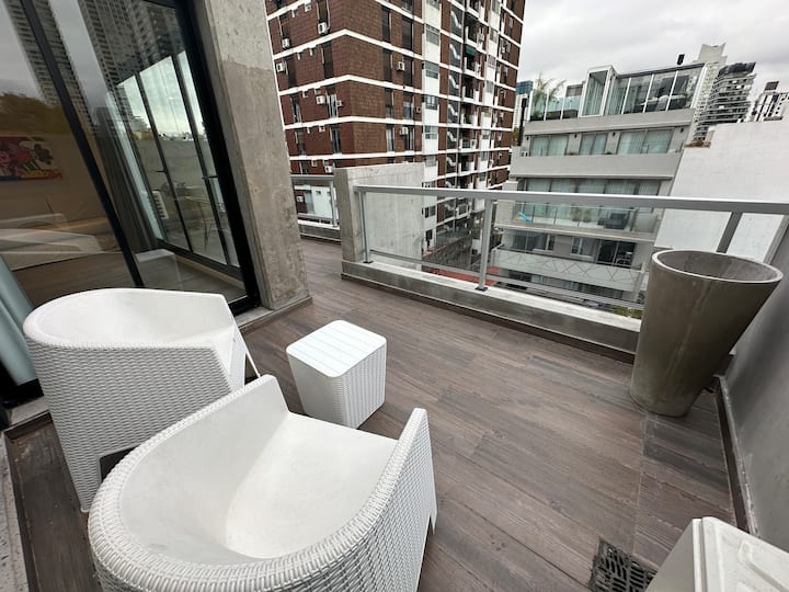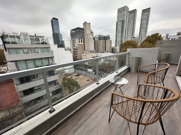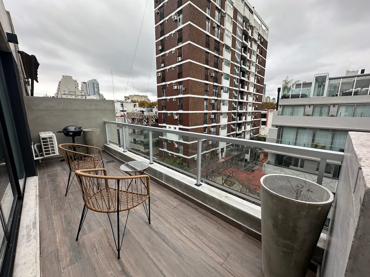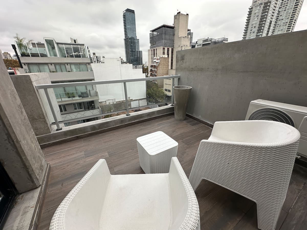 Apartamento de 2 ambientes em Palermo Hollywood. O imóvel tem 1 cama de casal e pode acomodar 2 pessoas; é possível solicitar 1 ou 2 colchões infláveis para hóspedes adicionais e há berços disponíveis gratuitamente. Segundo o anúncio, o apartamento é mobiliado e totalmente equipado, com cozinha e itens para estadia.