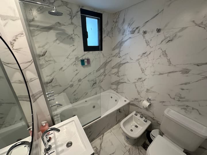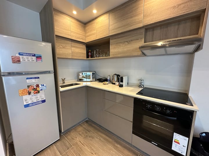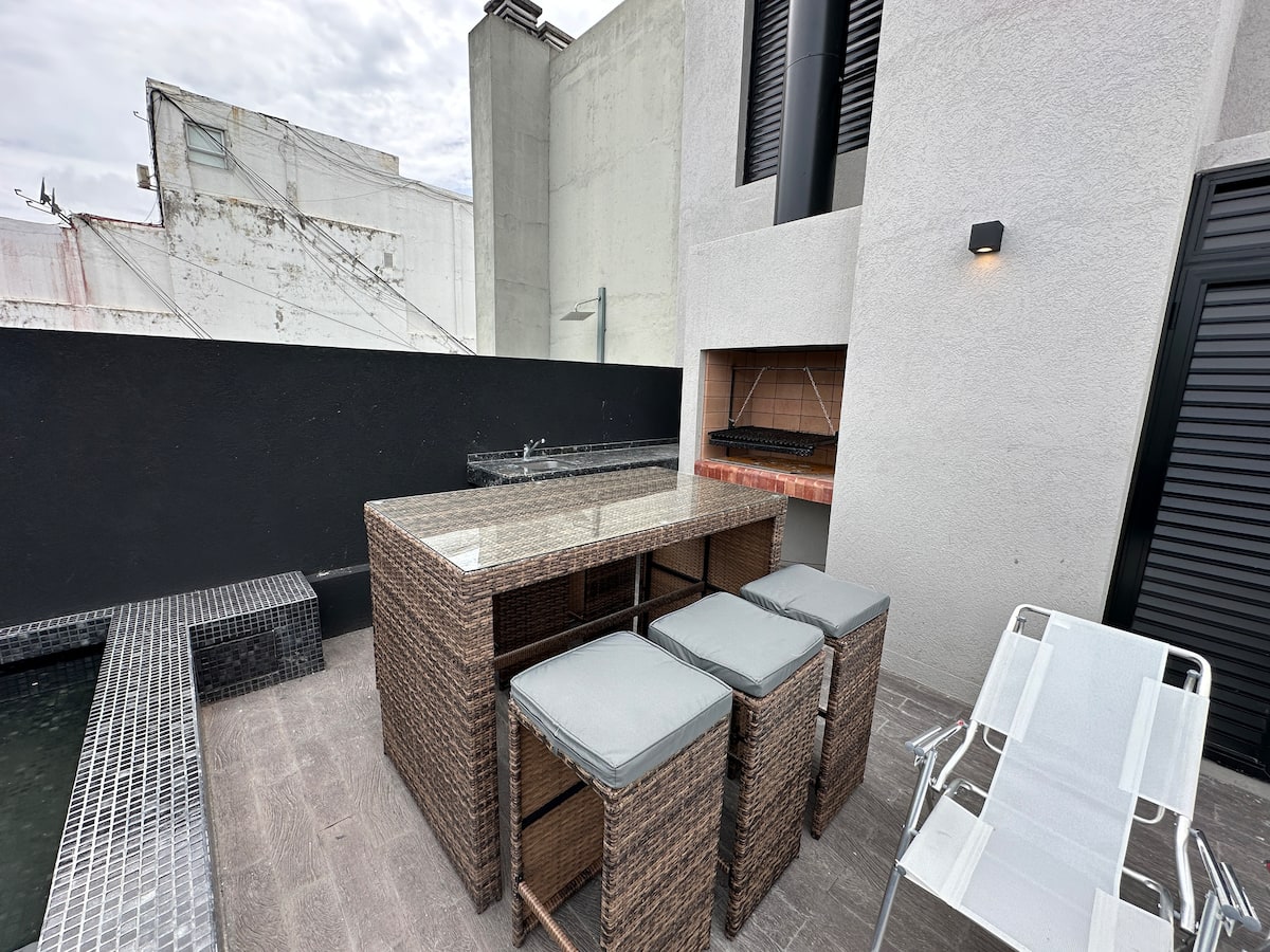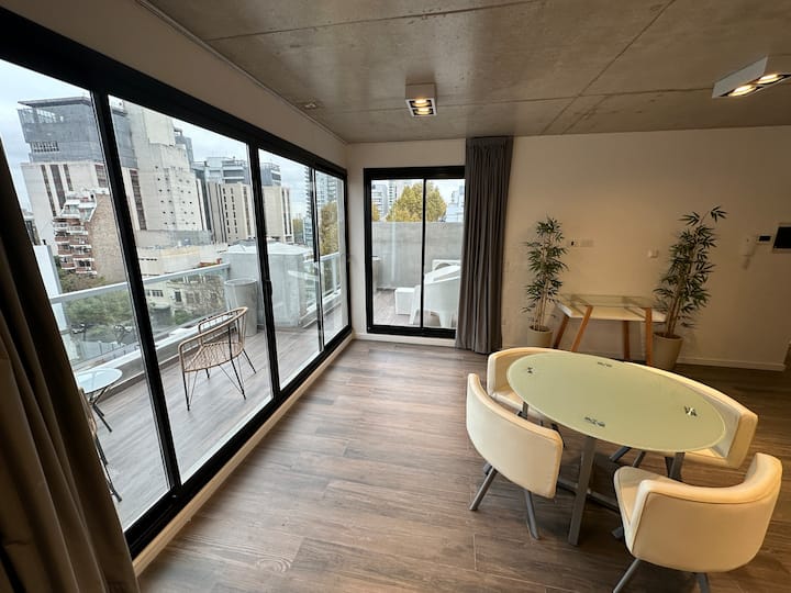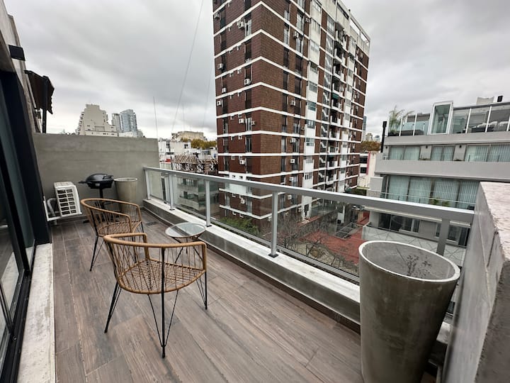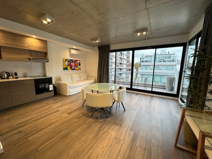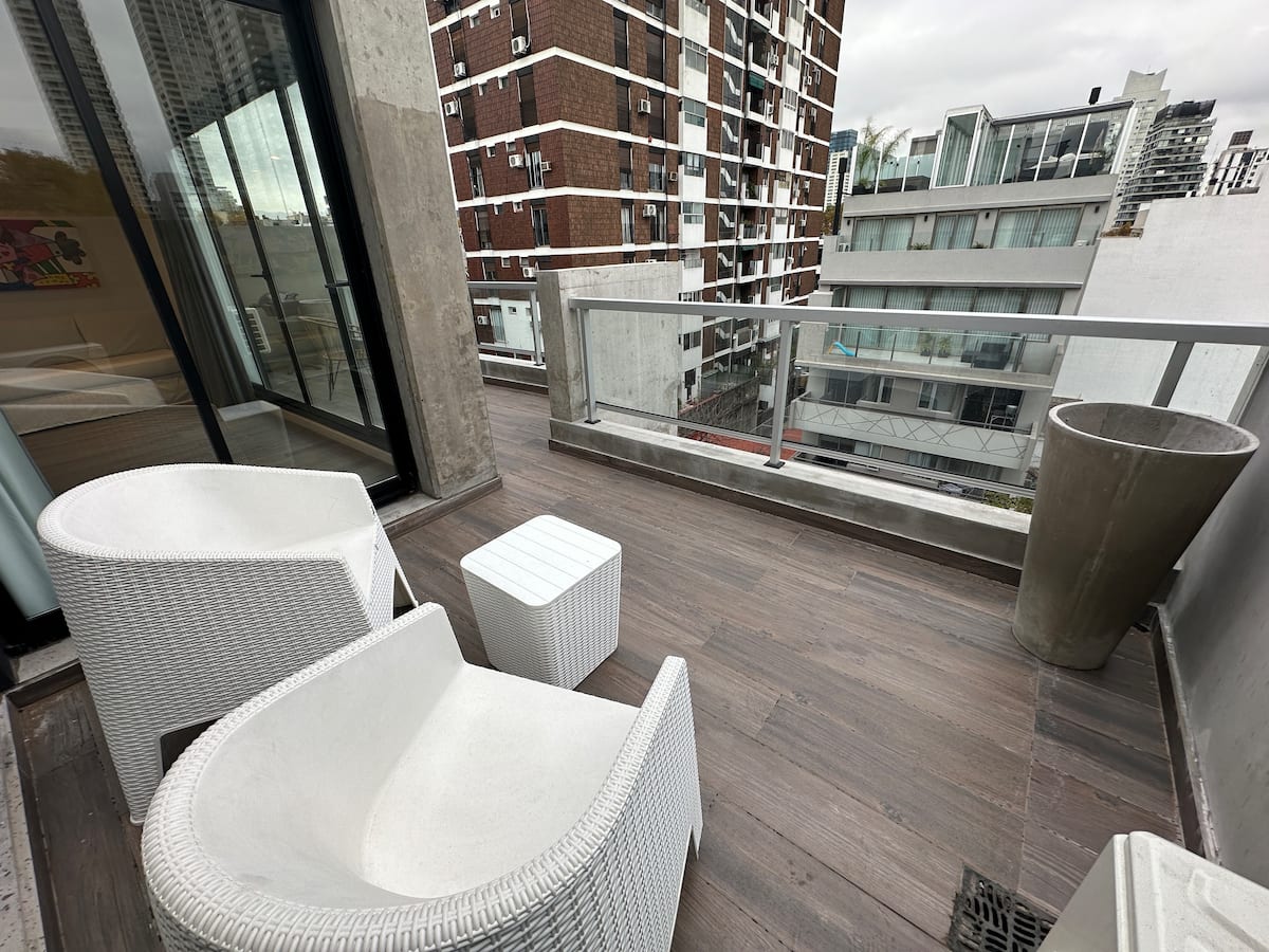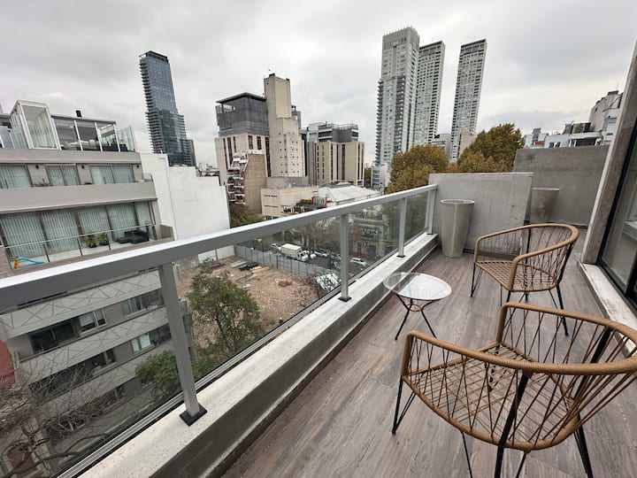 Apartamento de 2 ambientes em Palermo Hollywood. O imóvel tem 1 cama de casal e pode acomodar 2 pessoas; é possível solicitar 1 ou 2 colchões infláveis para hóspedes adicionais e há berços disponíveis gratuitamente. Segundo o anúncio, o apartamento é mobiliado e totalmente equipado, com cozinha e itens para estadia.