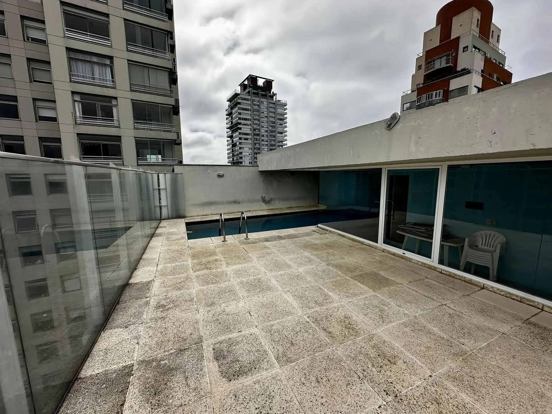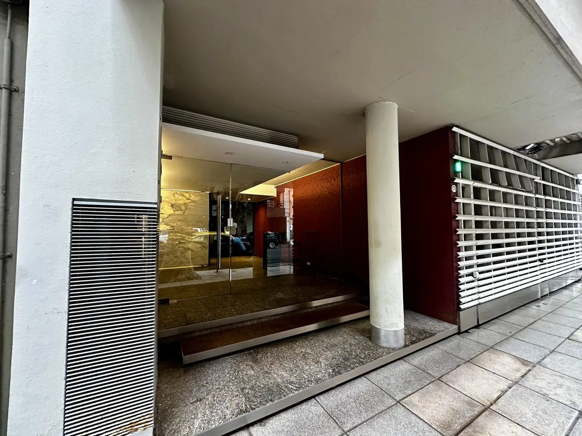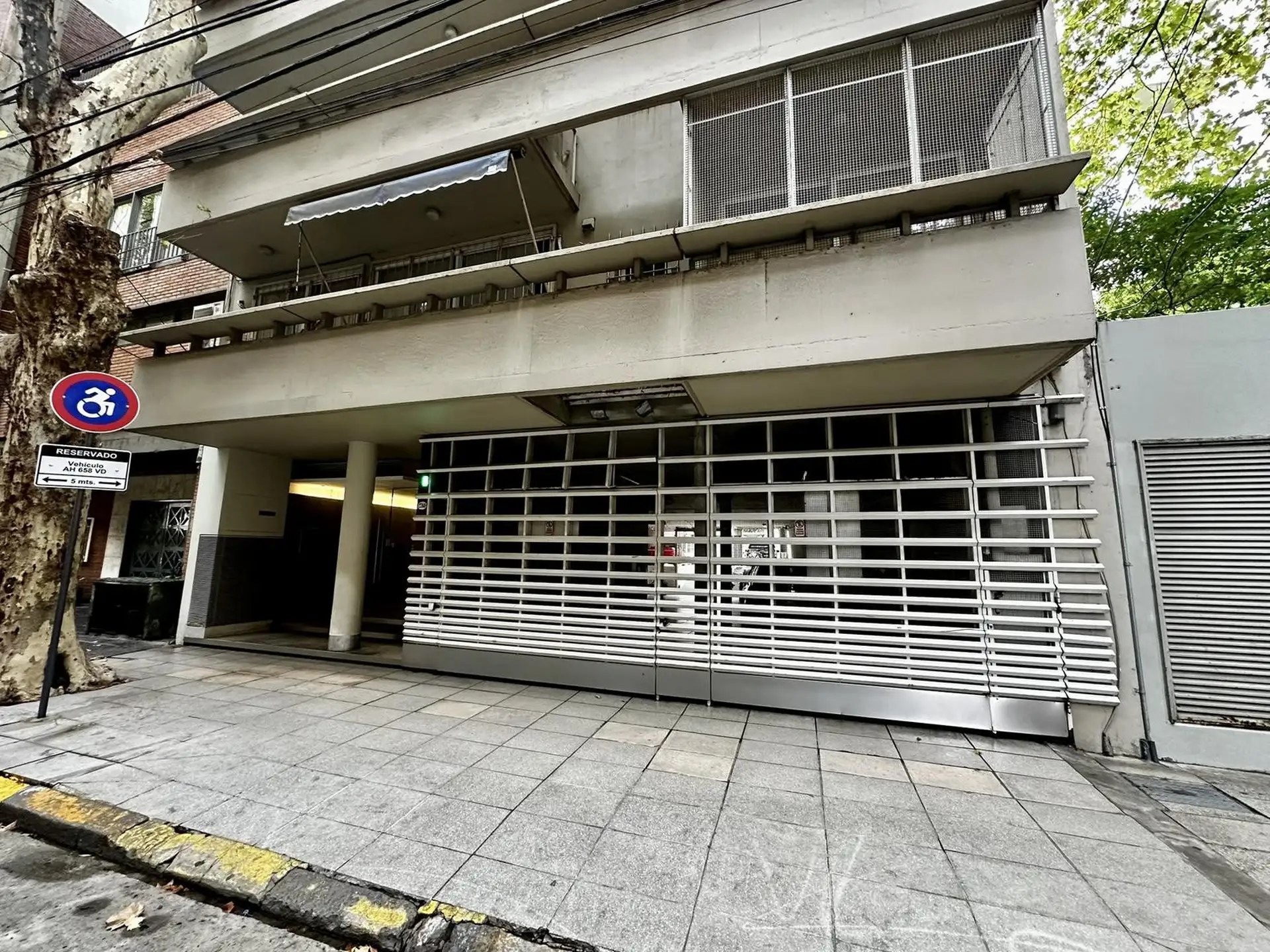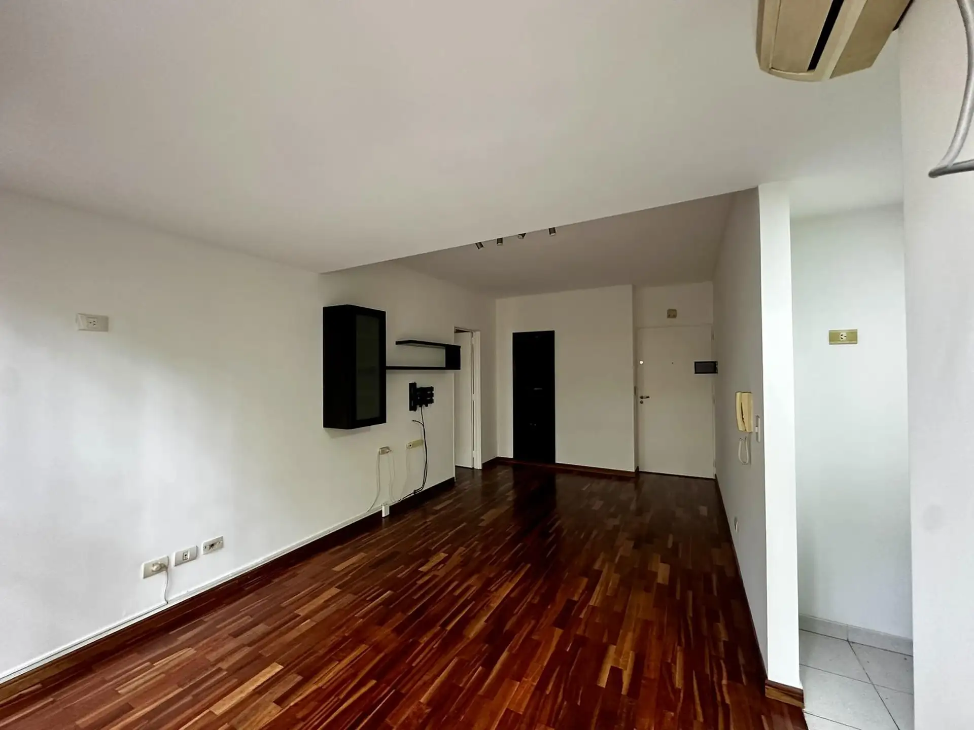 Apartamento de 1 quarto no 8º andar, de frente para a rua, com varanda. Cozinha, sala de estar e jantar e dormitório também ficam voltados para a frente. Inclui vaga de garagem fixa coberta. Piso de parquet recém-lixado e refeito, apartamento recém-pintado, ar-condicionado, água quente central e piscina no terraço.