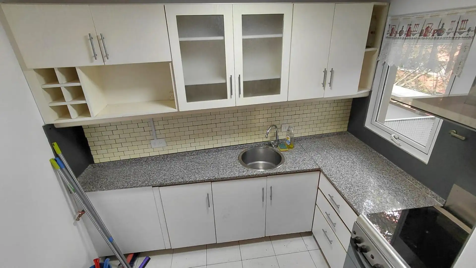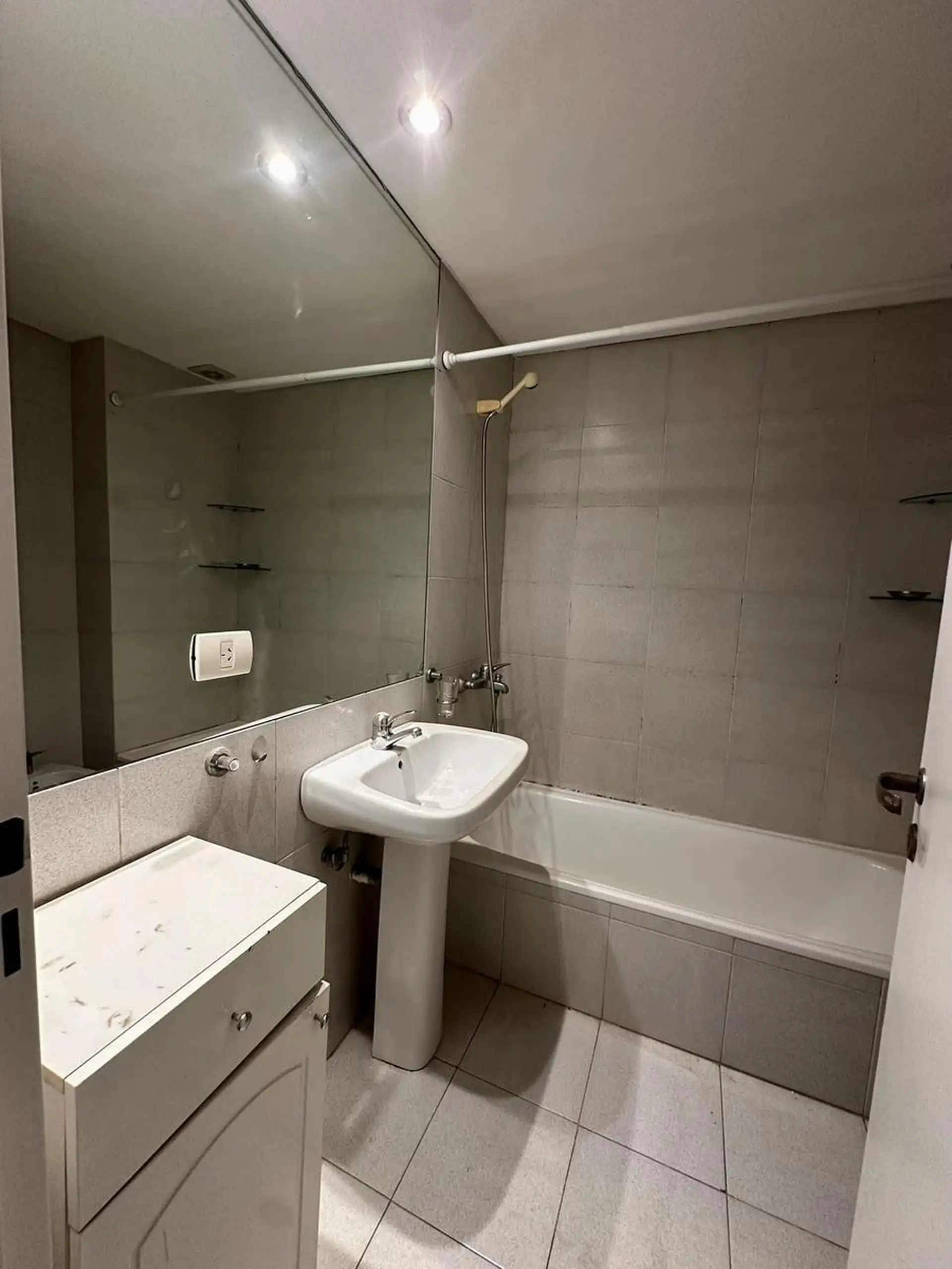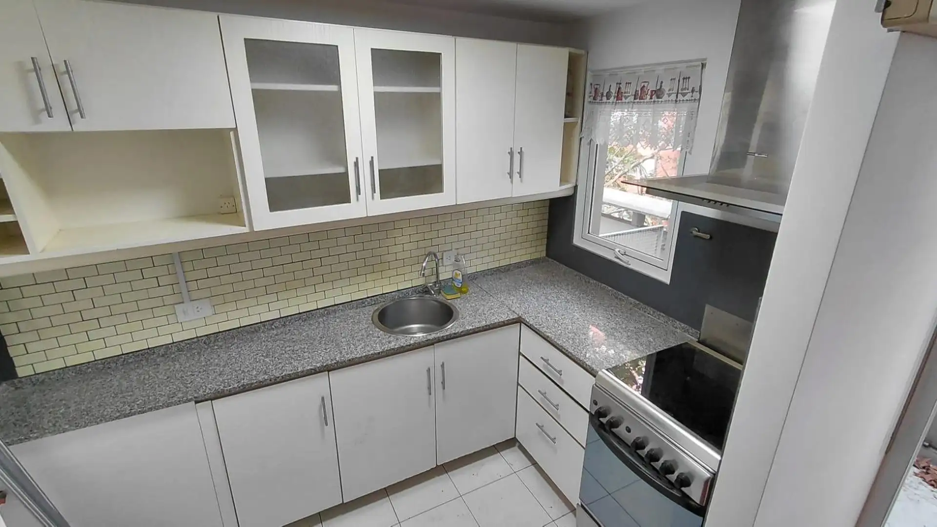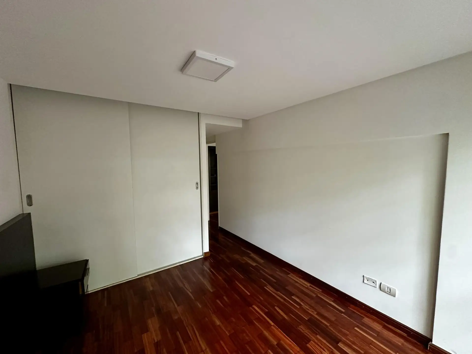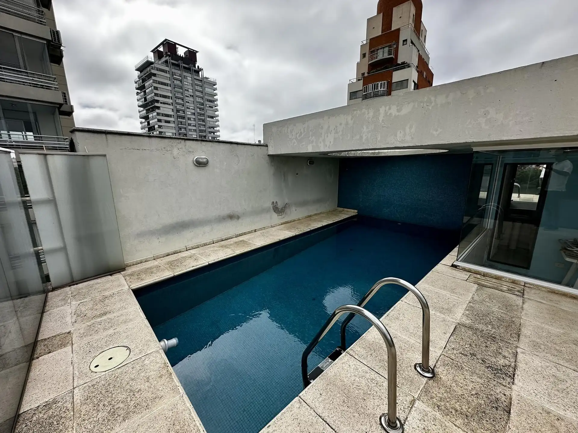 Apartamento de 1 quarto no 8º andar, de frente para a rua, com varanda. Cozinha, sala de estar e jantar e dormitório também ficam voltados para a frente. Inclui vaga de garagem fixa coberta. Piso de parquet recém-lixado e refeito, apartamento recém-pintado, ar-condicionado, água quente central e piscina no terraço.