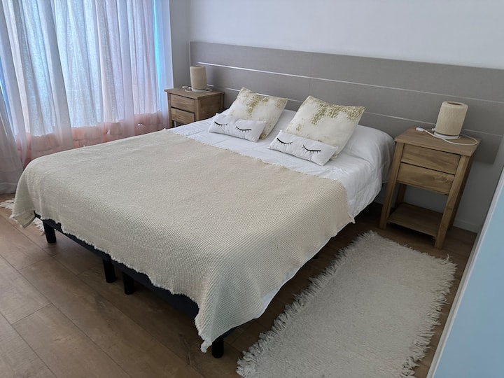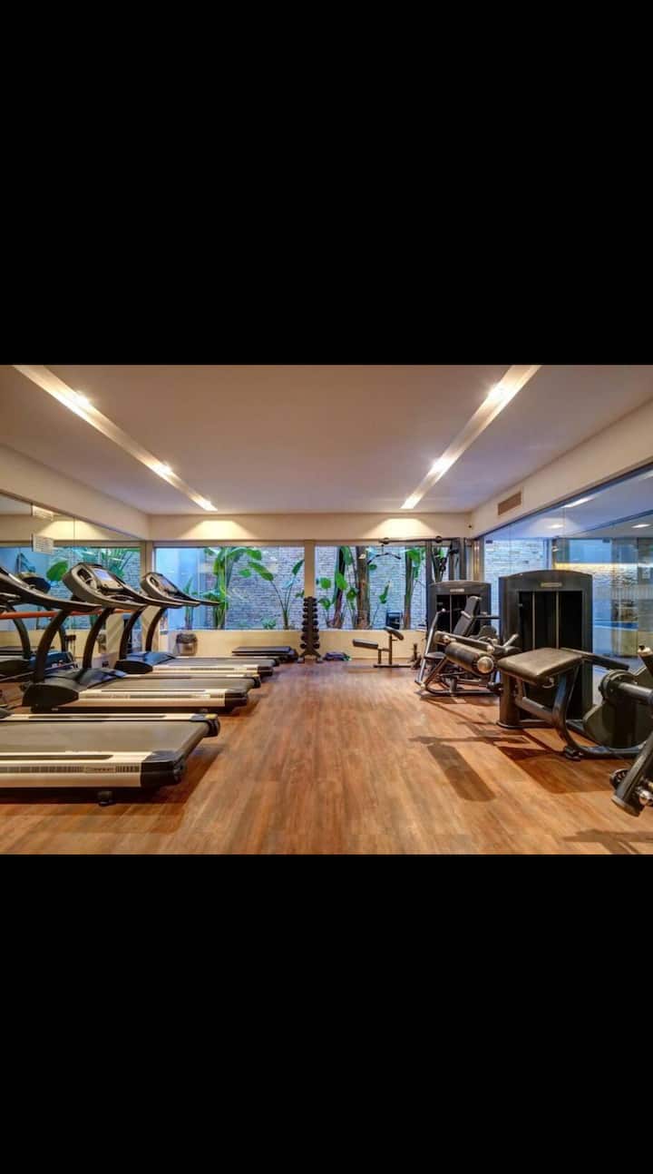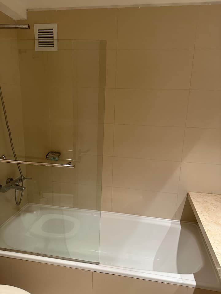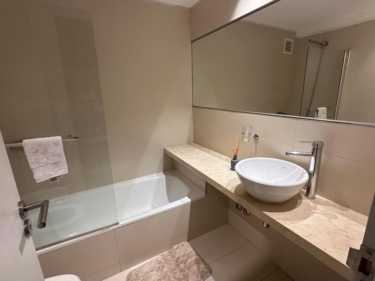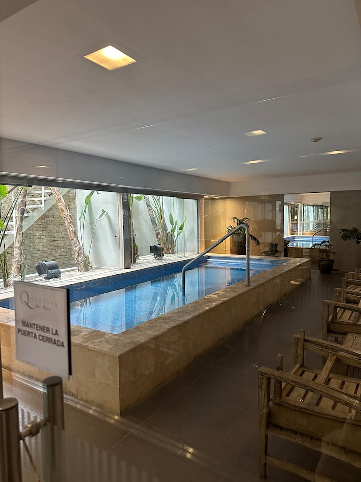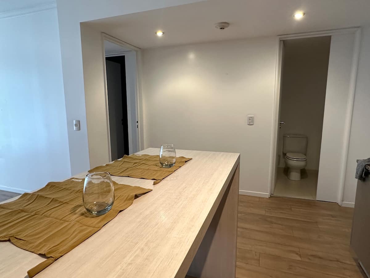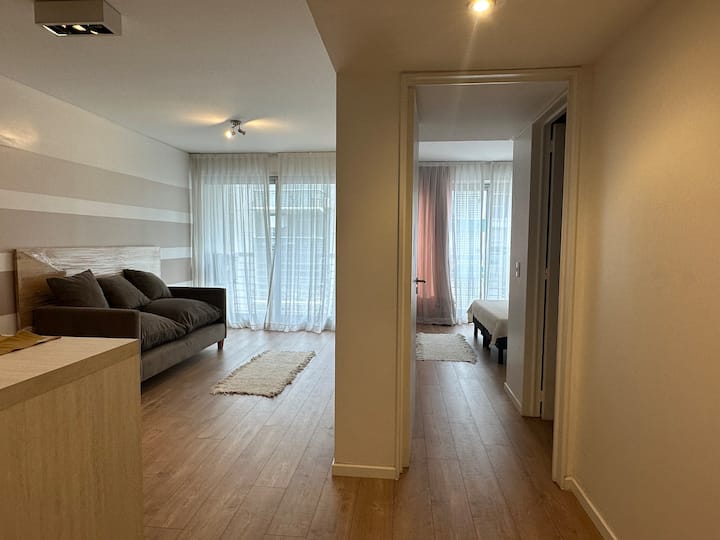 Apartamento no Quartier del Polo, em Las Cañitas, com 1 quarto. Conta com sala, cozinha totalmente equipada com geladeira e ar-condicionado, além de 2 banheiros (1 com bidê e chuveiro) e 1 banheiro social externo ao quarto. Inclui banheira de hidromassagem, toalhas e roupa de cama.