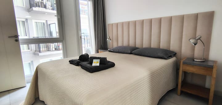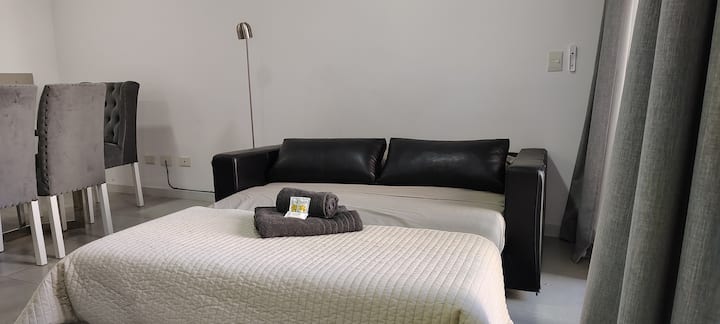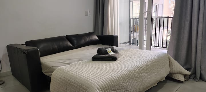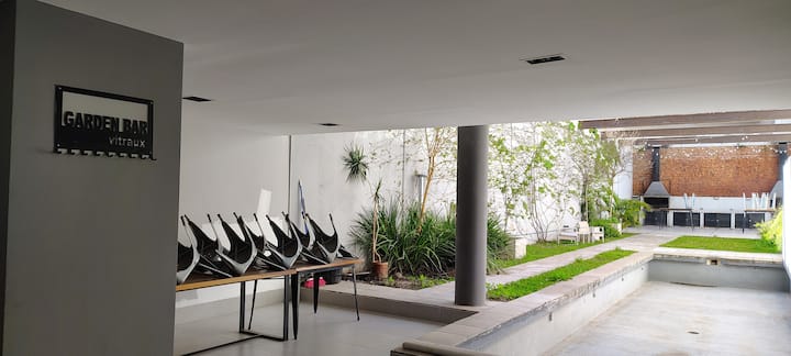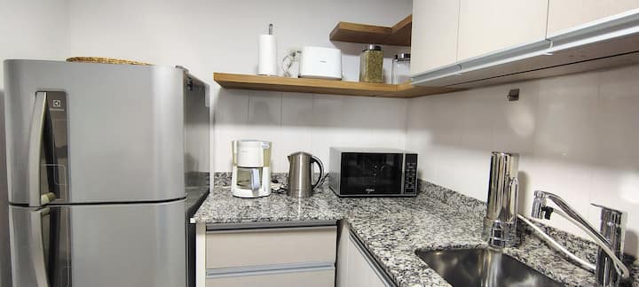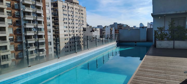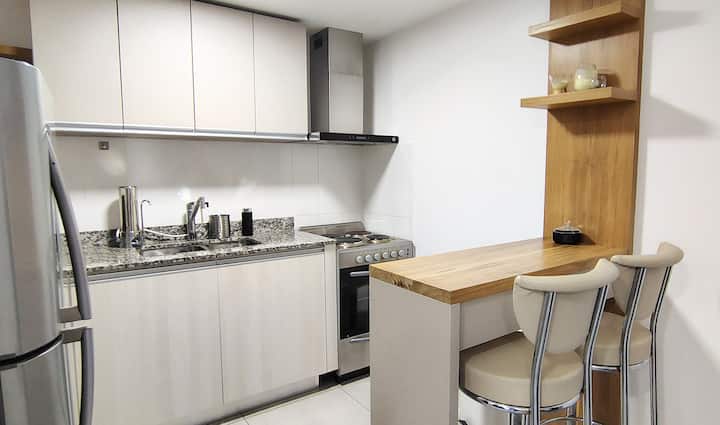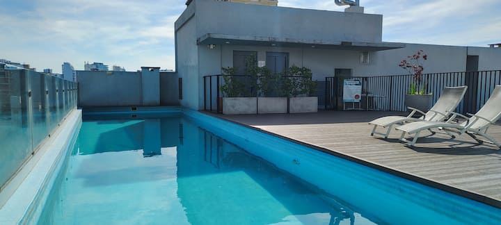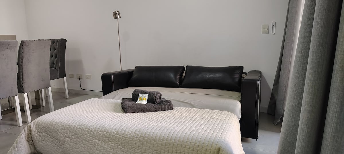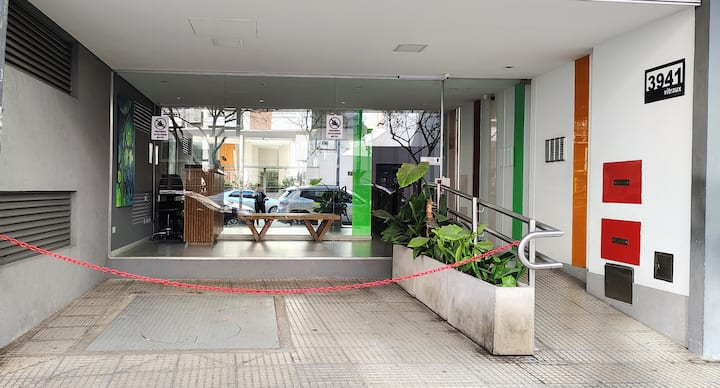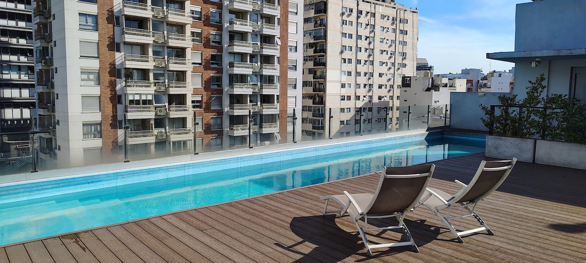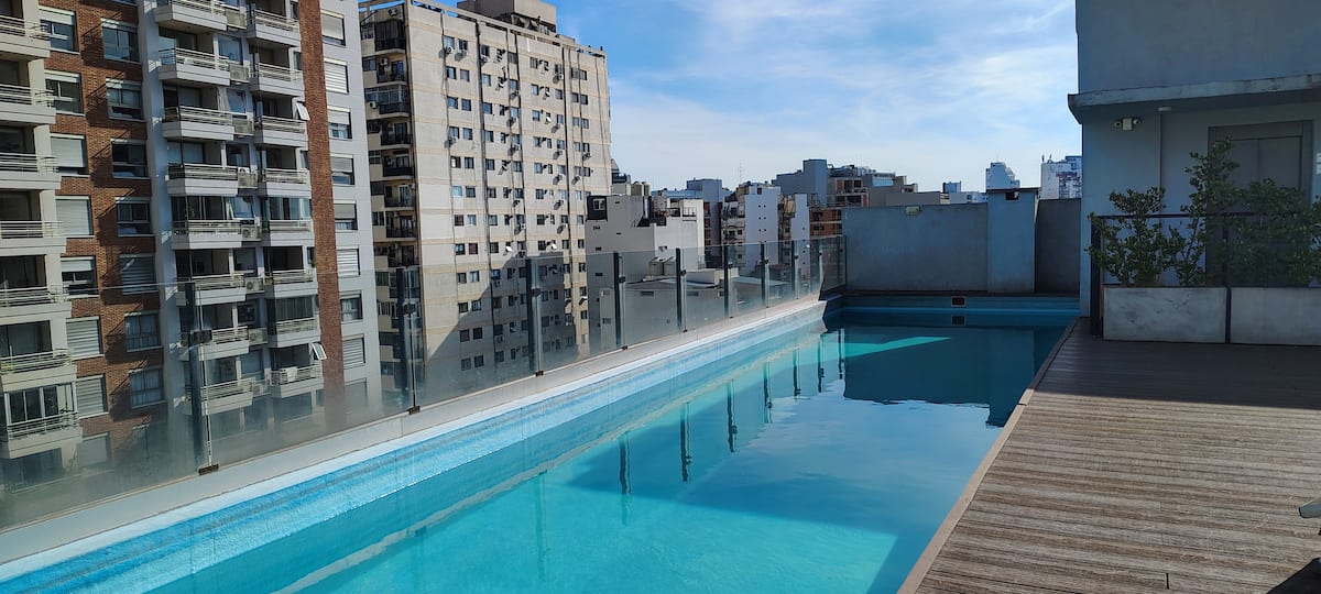 Apartamento em Palermo com 1 quarto, no 4º andar do edifício Vitreaux. Inclui sala de estar com sofá-cama, cozinha integrada com forno e fogão elétrico, micro-ondas, chaleira elétrica, cafeteira e torradeira, além de 2 banheiros (um deles privativo no quarto). O imóvel tem ar-condicionado e aquecimento em ambos os ambientes; inclui internet de alta velocidade e acesso gratuito à academia do prédio, além de piscina, lavanderia e espaço de cowork. O Sanatorio Guemes fica a cerca de 200 metros.