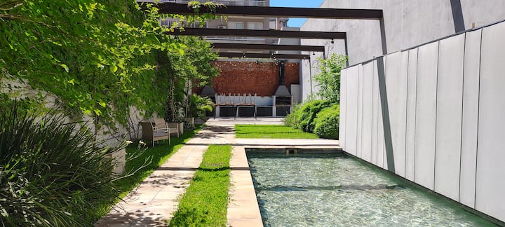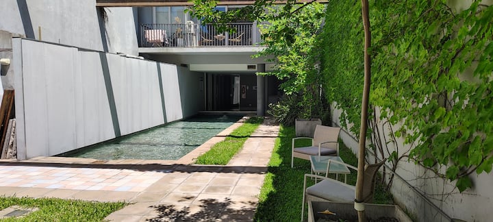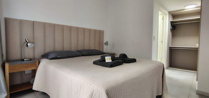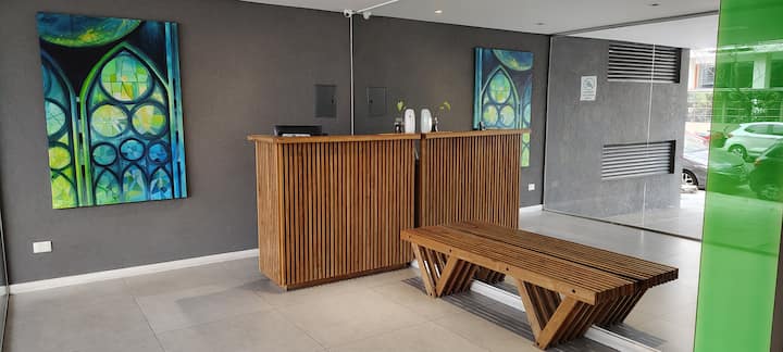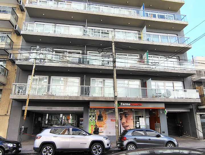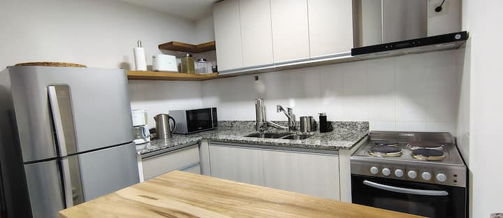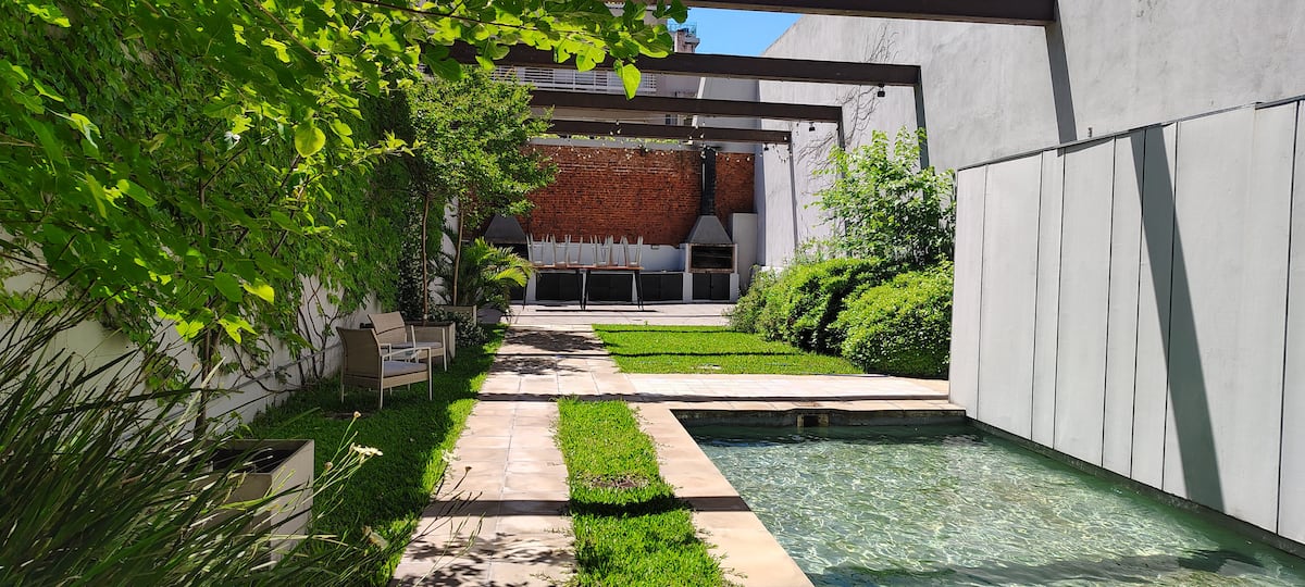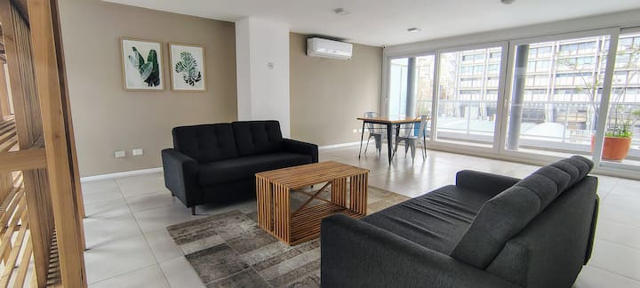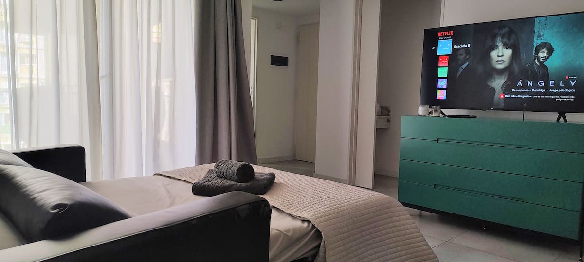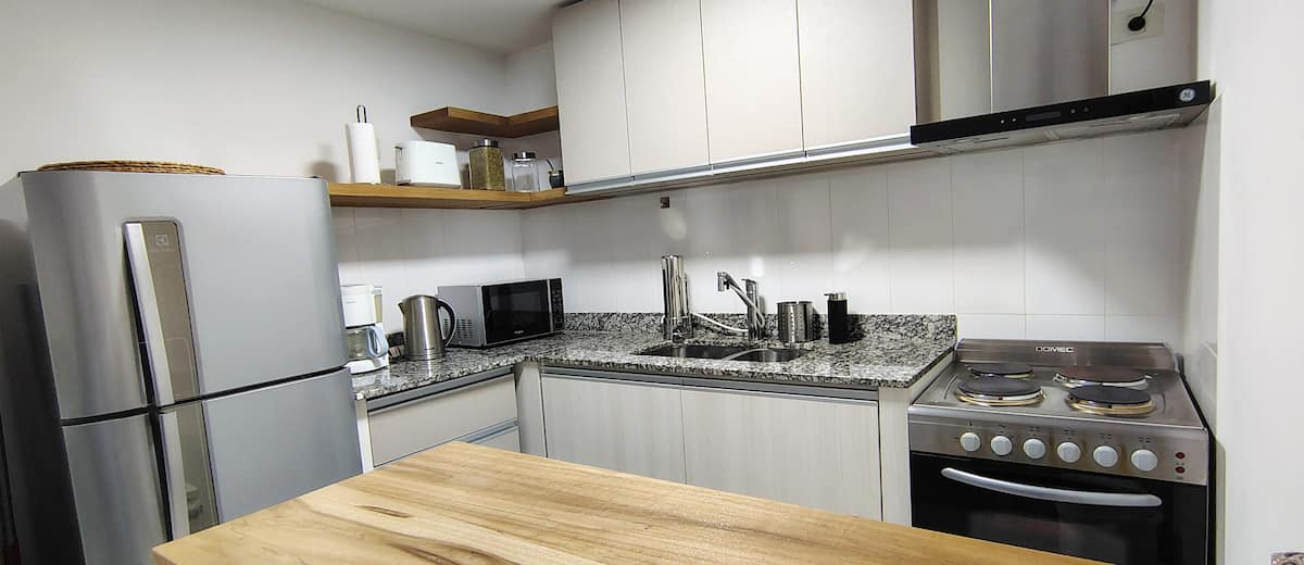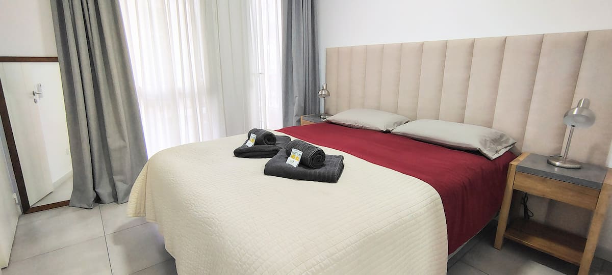 Apartamento em Palermo com 1 quarto, no 4º andar do edifício Vitreaux. Inclui sala de estar com sofá-cama, cozinha integrada com forno e fogão elétrico, micro-ondas, chaleira elétrica, cafeteira e torradeira, além de 2 banheiros (um deles privativo no quarto). O imóvel tem ar-condicionado e aquecimento em ambos os ambientes; inclui internet de alta velocidade e acesso gratuito à academia do prédio, além de piscina, lavanderia e espaço de cowork. O Sanatorio Guemes fica a cerca de 200 metros.