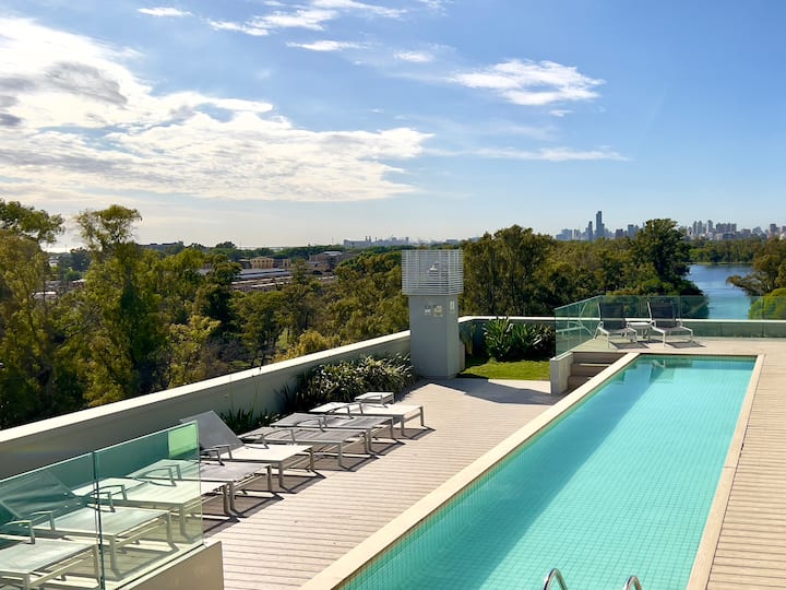 Apartamento em Palermo com 1 quarto, voltado para os Lagos e a área verde de Palermo. O prédio tem piscina, solarium, academia, área de churrasco, salão comunitário e lavanderia, além de vaga de garagem coberta e segurança 24 horas. Há varanda externa e o apartamento é mobiliado e equipado, com eletrodomésticos, Wi-Fi, 2 Smart TVs e 2 ar-condicionados.
