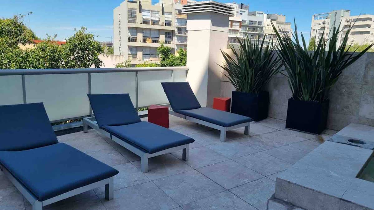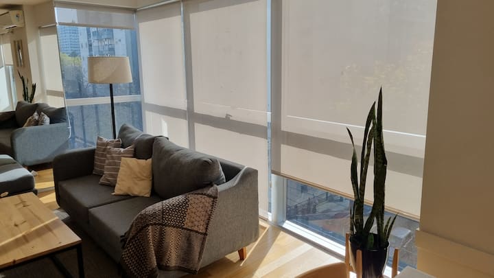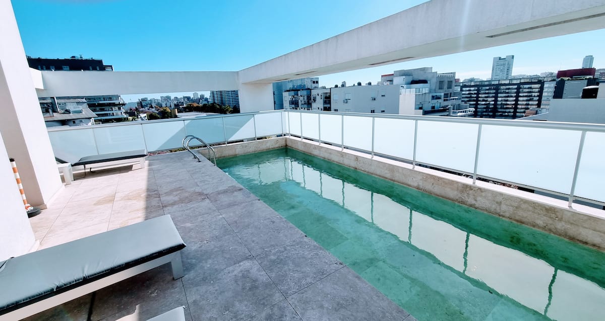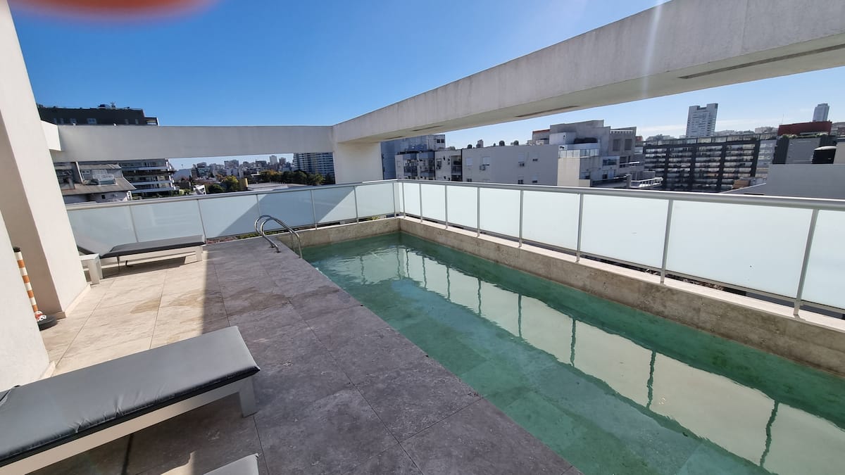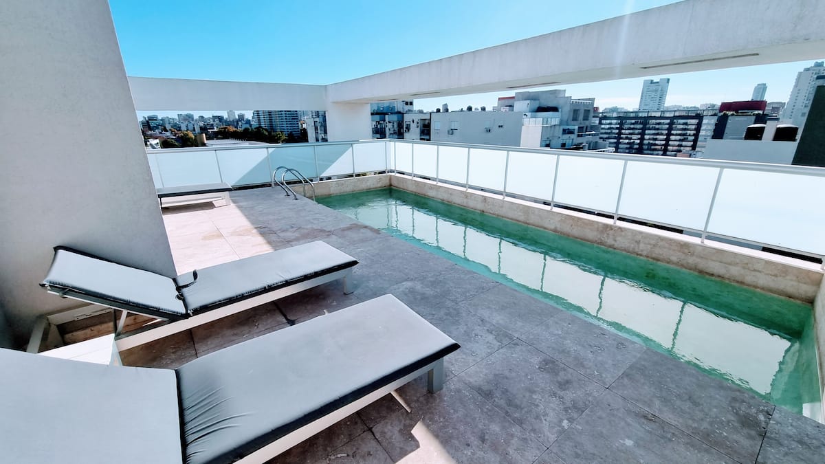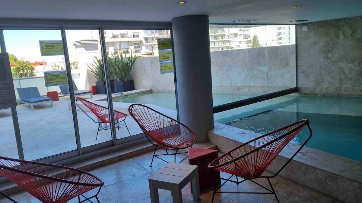 Apartamento de 2 ambientes em Palermo Hollywood, com 1 quarto e ar-condicionado na sala e no quarto. Possui Wi-Fi de 300 Mbps, TV inteligente com cabo e cozinha equipada. O prédio conta com academia, piscina, sauna, salão de festas (SUM), piscina aquecida e lavanderia no subsolo, além de segurança 24 horas. Não é aceito pets.