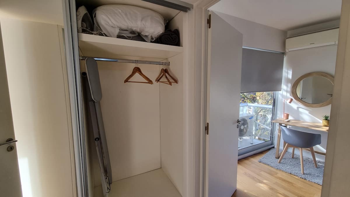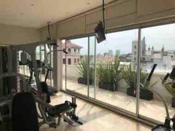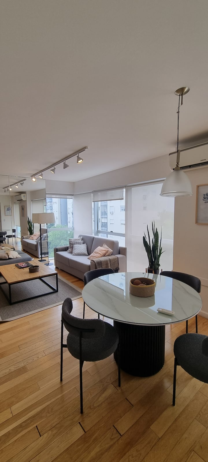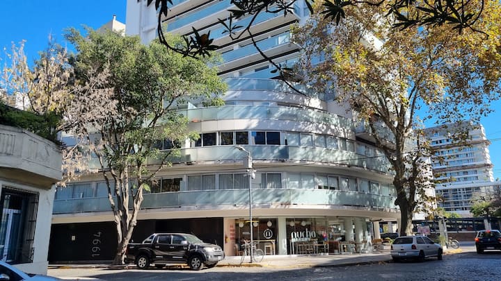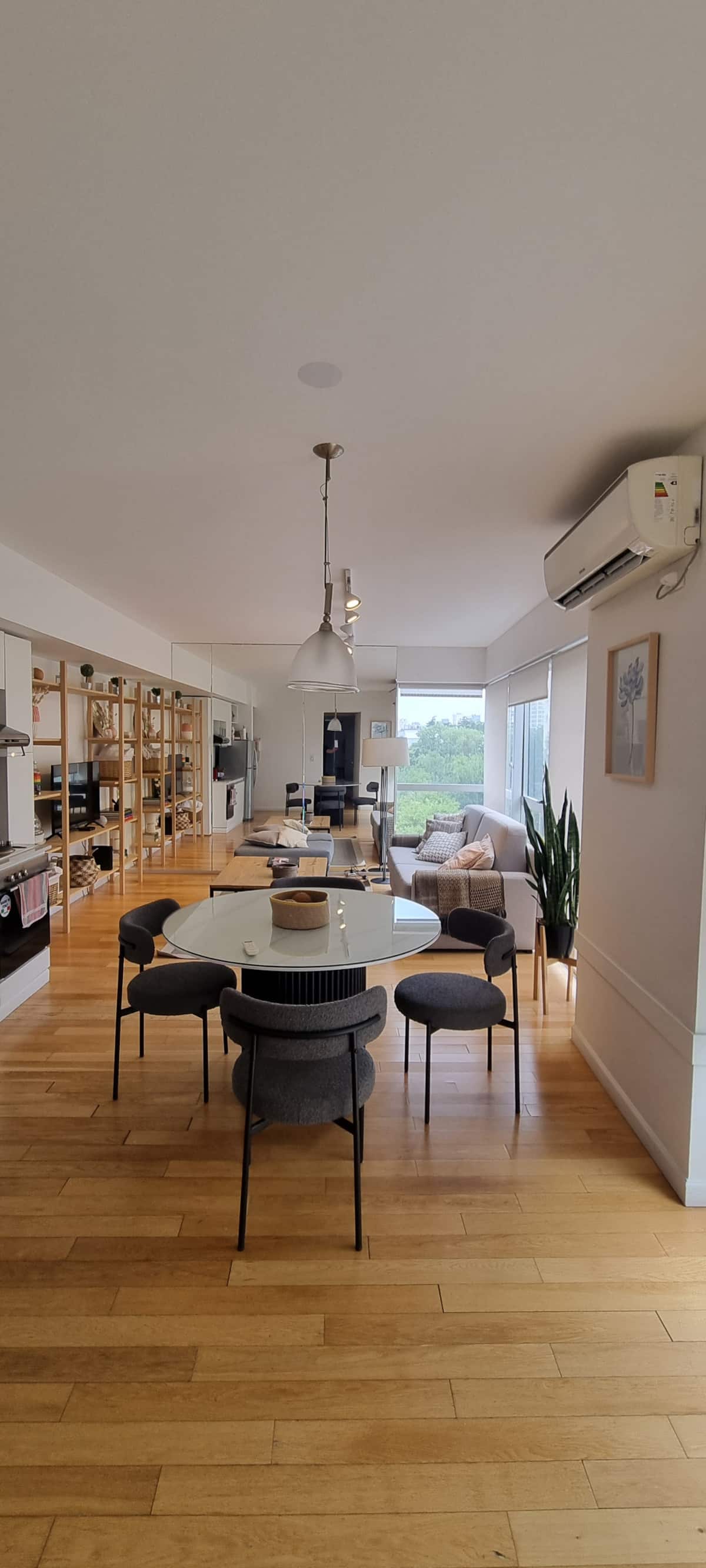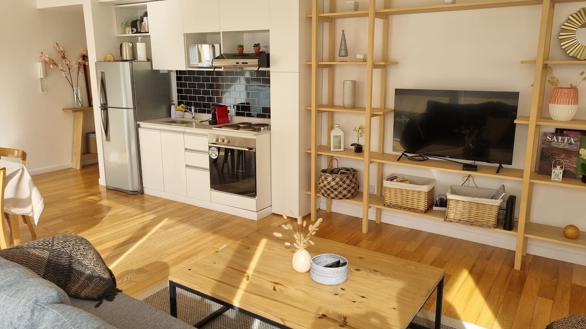 Apartamento de 2 ambientes em Palermo Hollywood, com 1 quarto e ar-condicionado na sala e no quarto. Possui Wi-Fi de 300 Mbps, TV inteligente com cabo e cozinha equipada. O prédio conta com academia, piscina, sauna, salão de festas (SUM), piscina aquecida e lavanderia no subsolo, além de segurança 24 horas. Não é aceito pets.