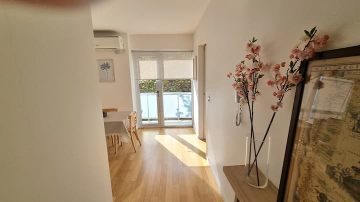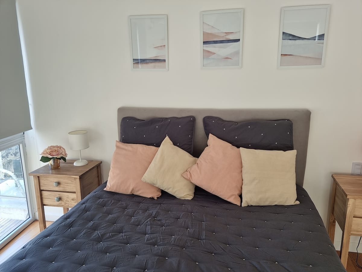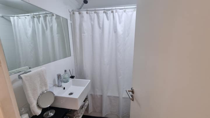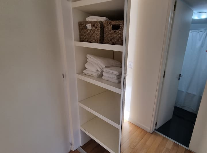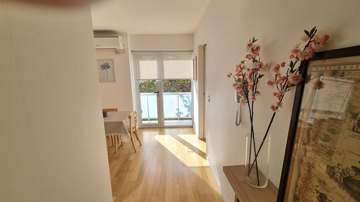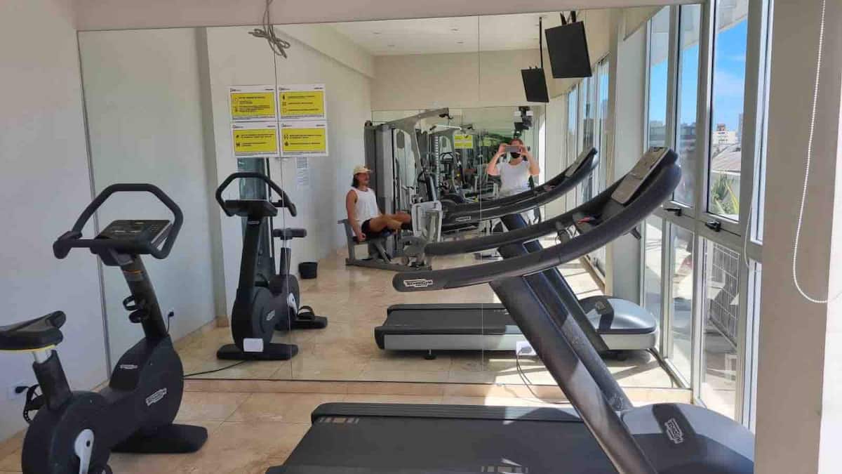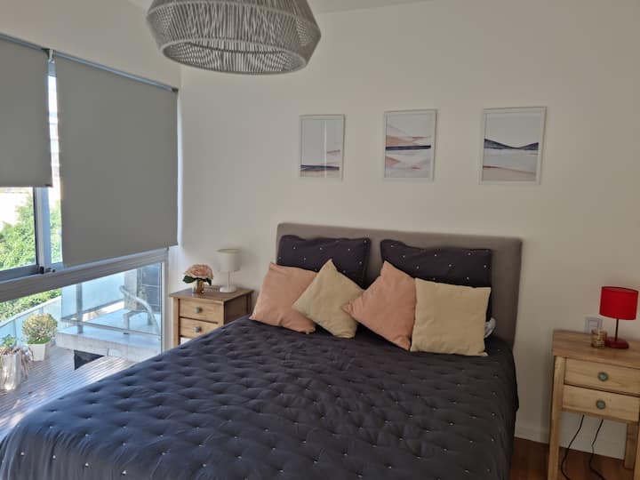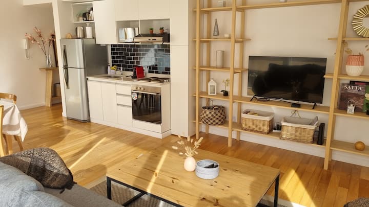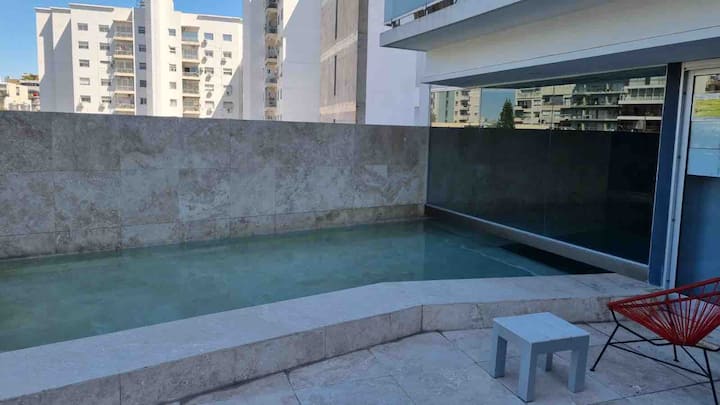 Apartamento de 2 ambientes em Palermo Hollywood, com 1 quarto e ar-condicionado na sala e no quarto. Possui Wi-Fi de 300 Mbps, TV inteligente com cabo e cozinha equipada. O prédio conta com academia, piscina, sauna, salão de festas (SUM), piscina aquecida e lavanderia no subsolo, além de segurança 24 horas. Não é aceito pets.