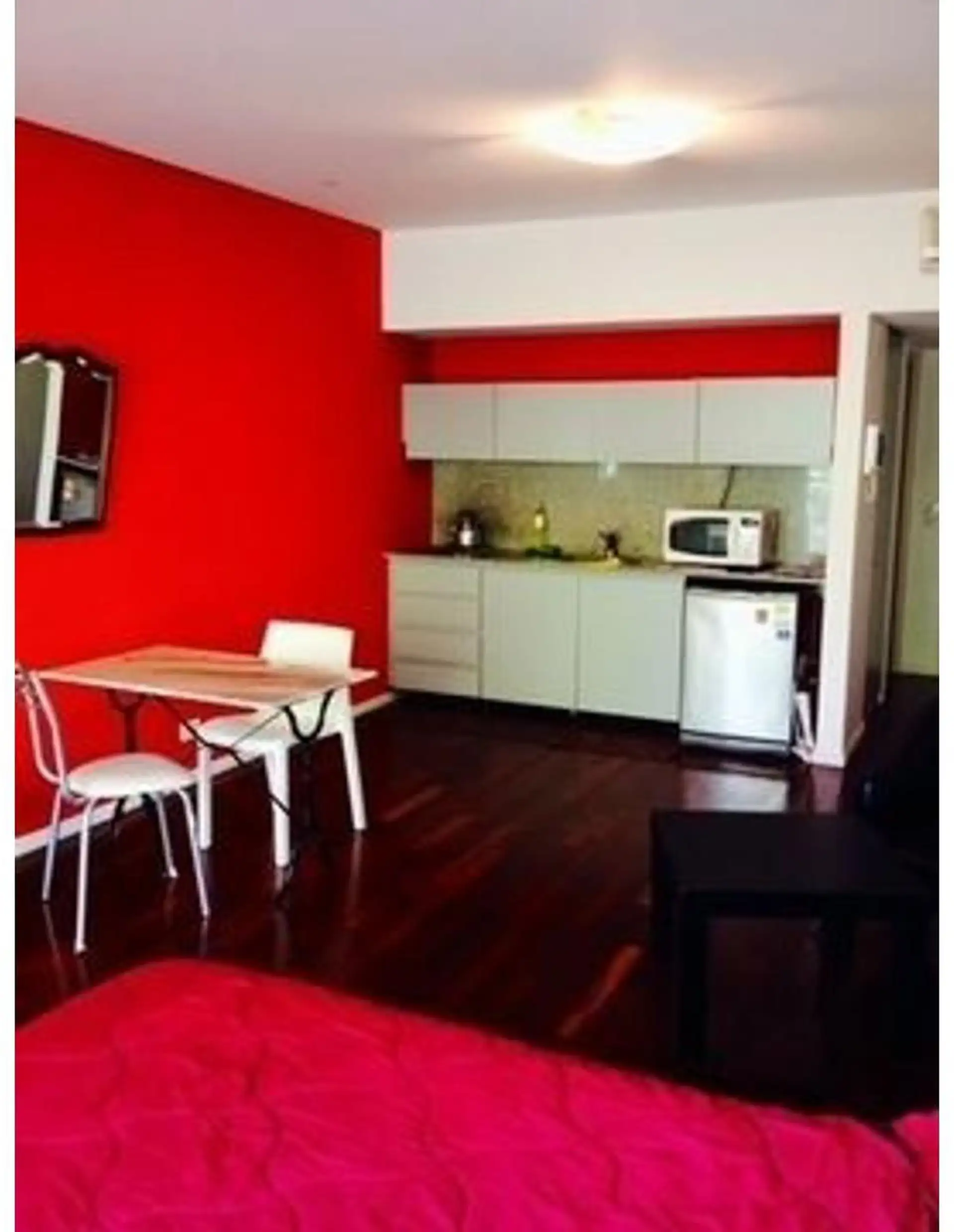 Apartamento mobiliado de 35 m² em Palermo Hollywood, de frente para a rua, com varanda corrido. Ar-condicionado (frio/calor), cama de casal e TV a cabo, Wi-Fi. O prédio tem piscina, elevador e aquecimento por piso radiante. O valor do pacote inclui expensas, ABL, água, Cablevisión e internet; luz e gás são pagos conforme consumo. Para entrada, é cobrado cerca de 3 meses: 1 mês de aluguel, 1 mês de depósito e 1 mês de comissão.
