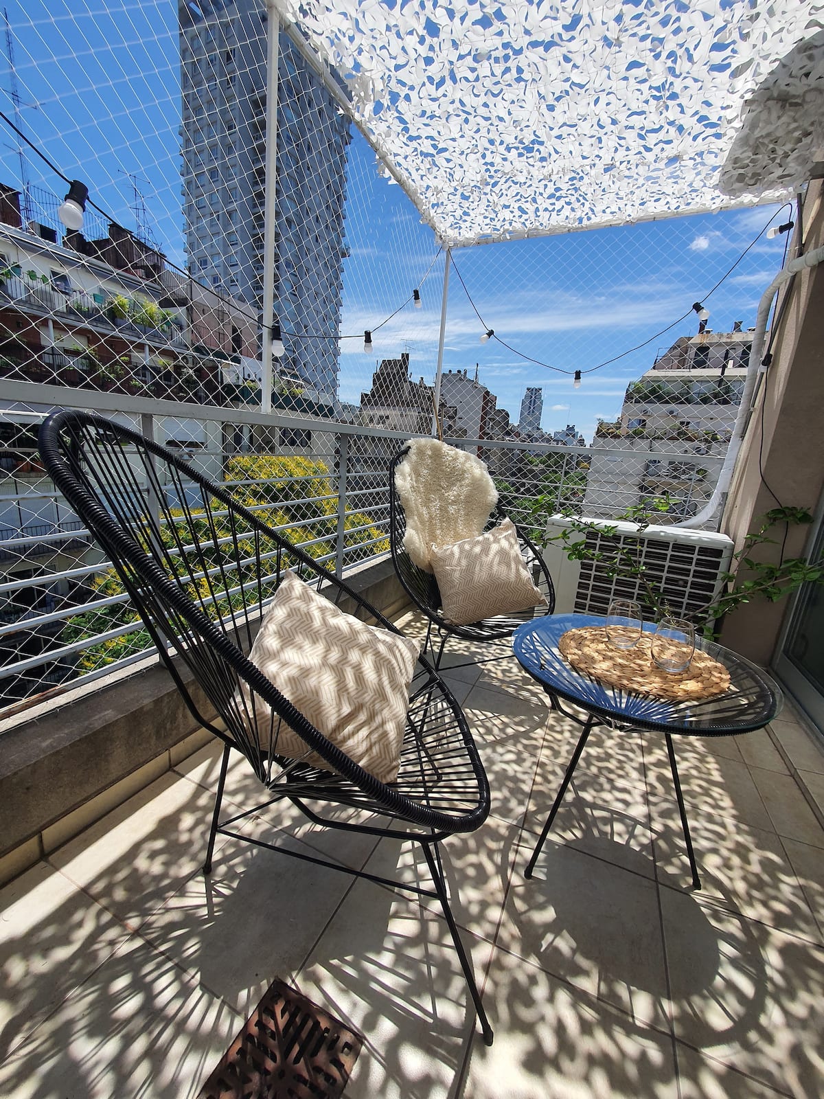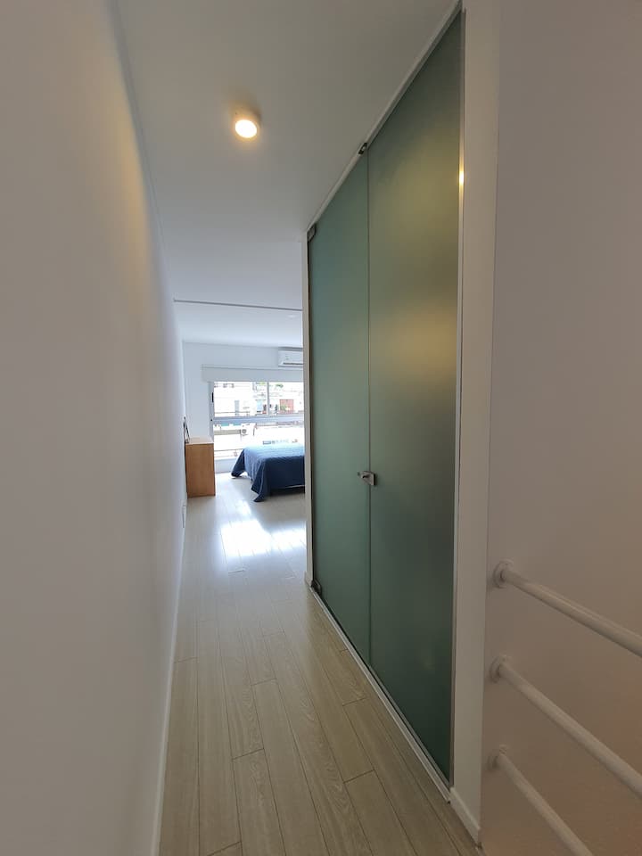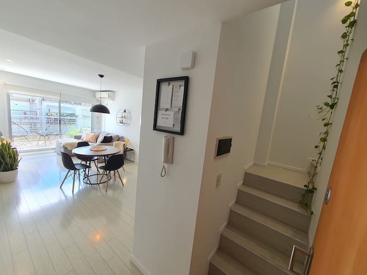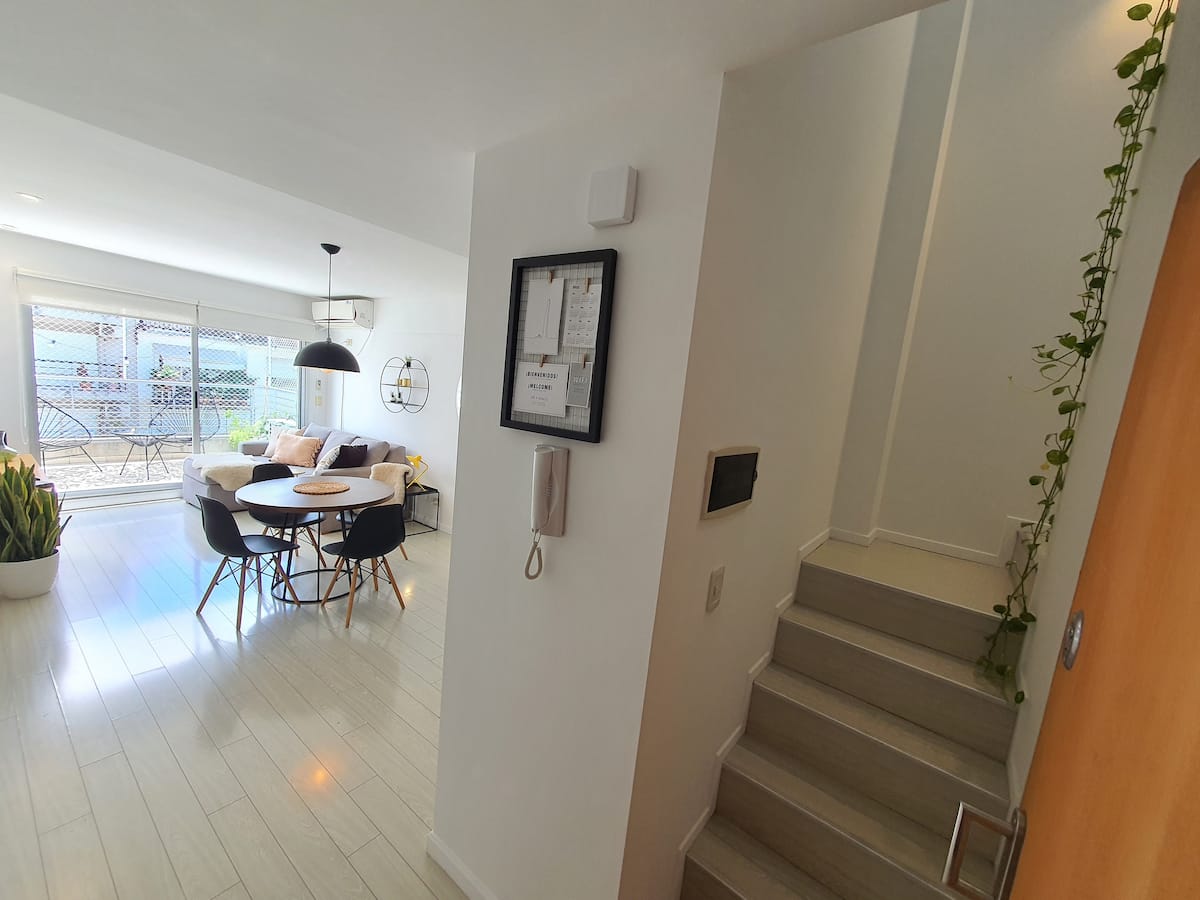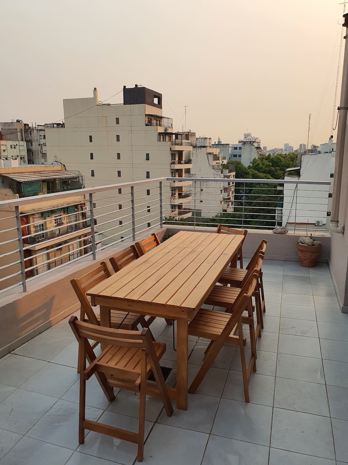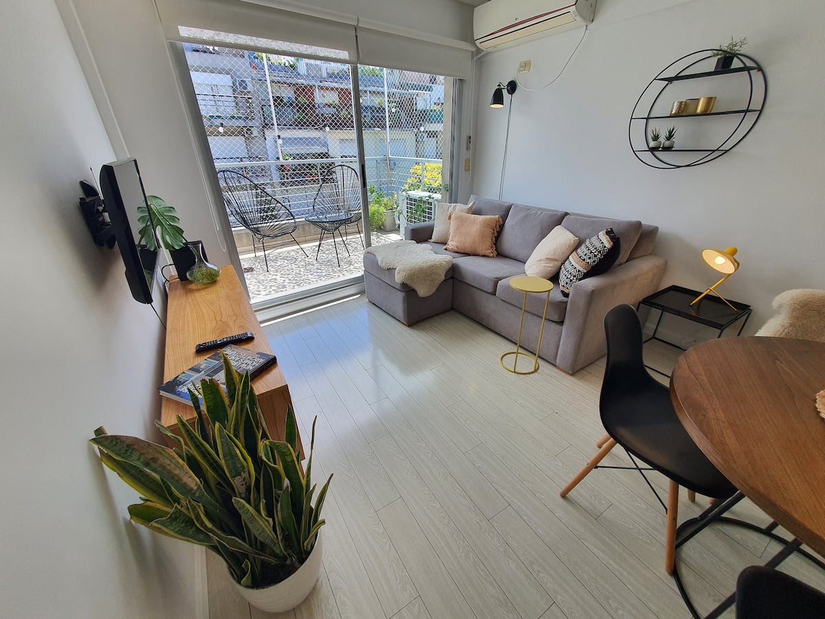 Apartamento em duplex em Palermo Soho, com 1 quarto, com varanda e terraço. No piso térreo, sala de estar com piso de madeira, iluminação regulável, ar-condicionado e Smart TV; acesso a uma varanda ensolarada por porta de vidro do chão ao teto. Cozinha totalmente equipada com itens como cafeteira, torradeira, micro-ondas, forno elétrico, fogão/“anafe” e utensílios. No andar superior, suíte com banheiro completo e closet, além de espaço de trabalho/estúdio. O prédio dispõe de piscina e área de ch