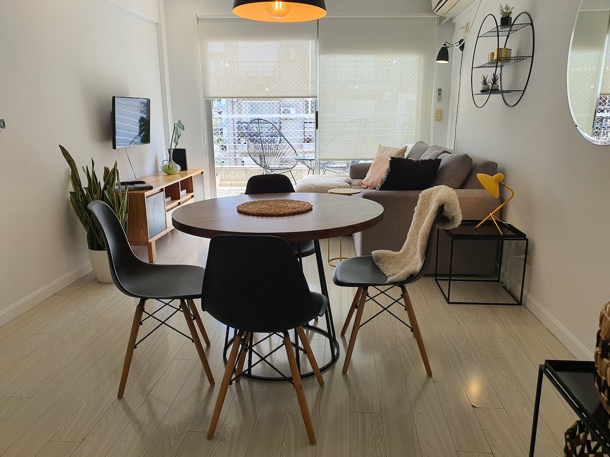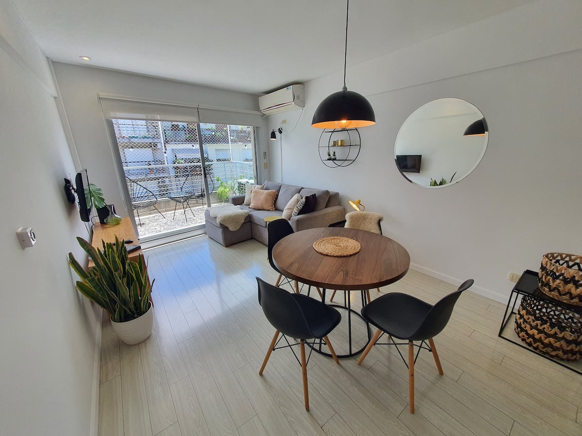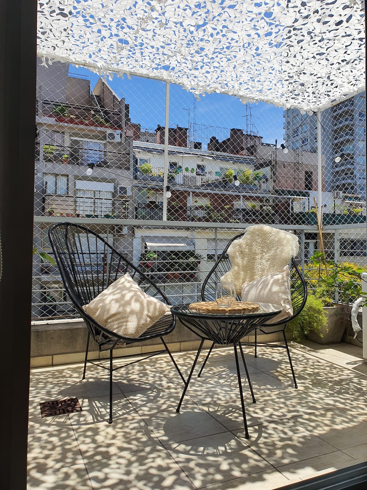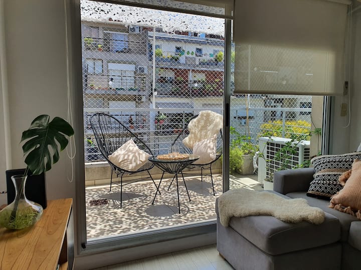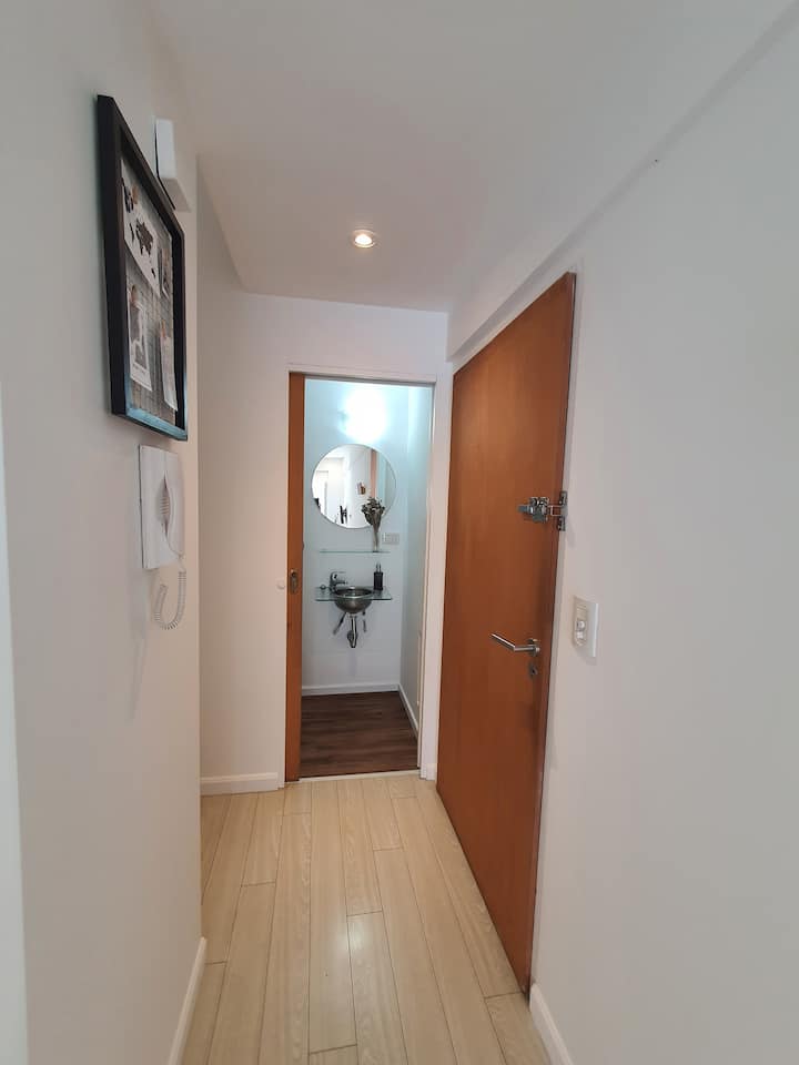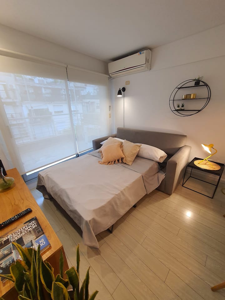 Apartamento em duplex em Palermo Soho, com 1 quarto, com varanda e terraço. No piso térreo, sala de estar com piso de madeira, iluminação regulável, ar-condicionado e Smart TV; acesso a uma varanda ensolarada por porta de vidro do chão ao teto. Cozinha totalmente equipada com itens como cafeteira, torradeira, micro-ondas, forno elétrico, fogão/“anafe” e utensílios. No andar superior, suíte com banheiro completo e closet, além de espaço de trabalho/estúdio. O prédio dispõe de piscina e área de ch