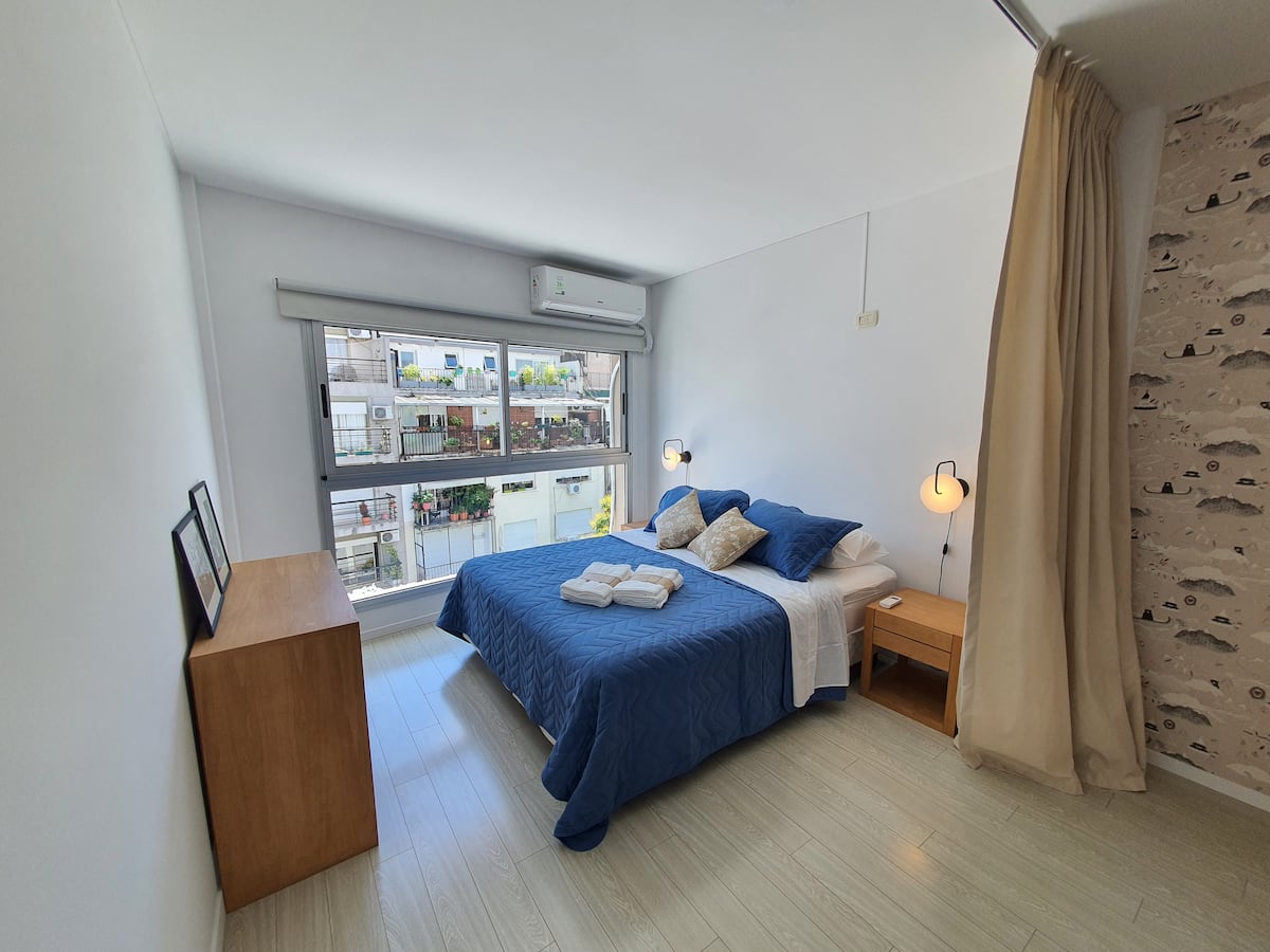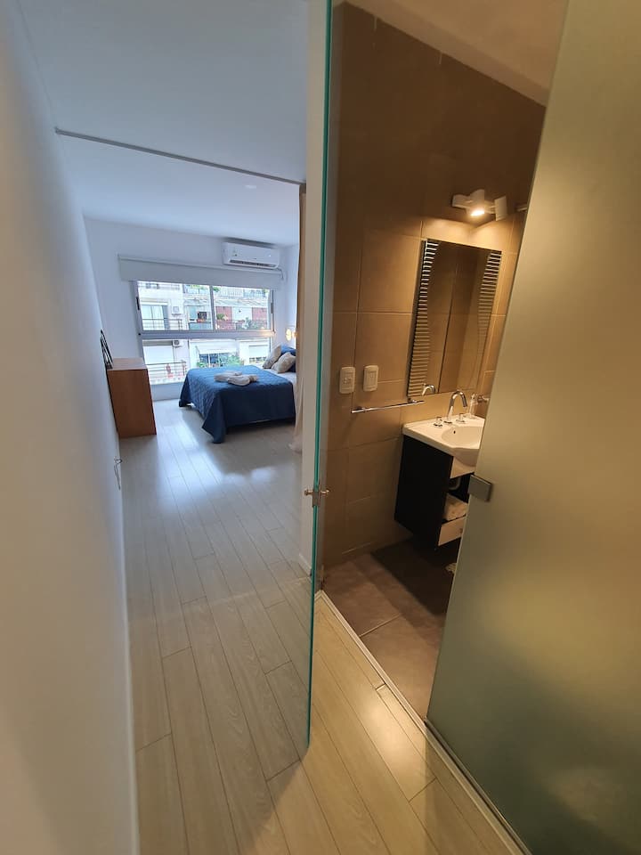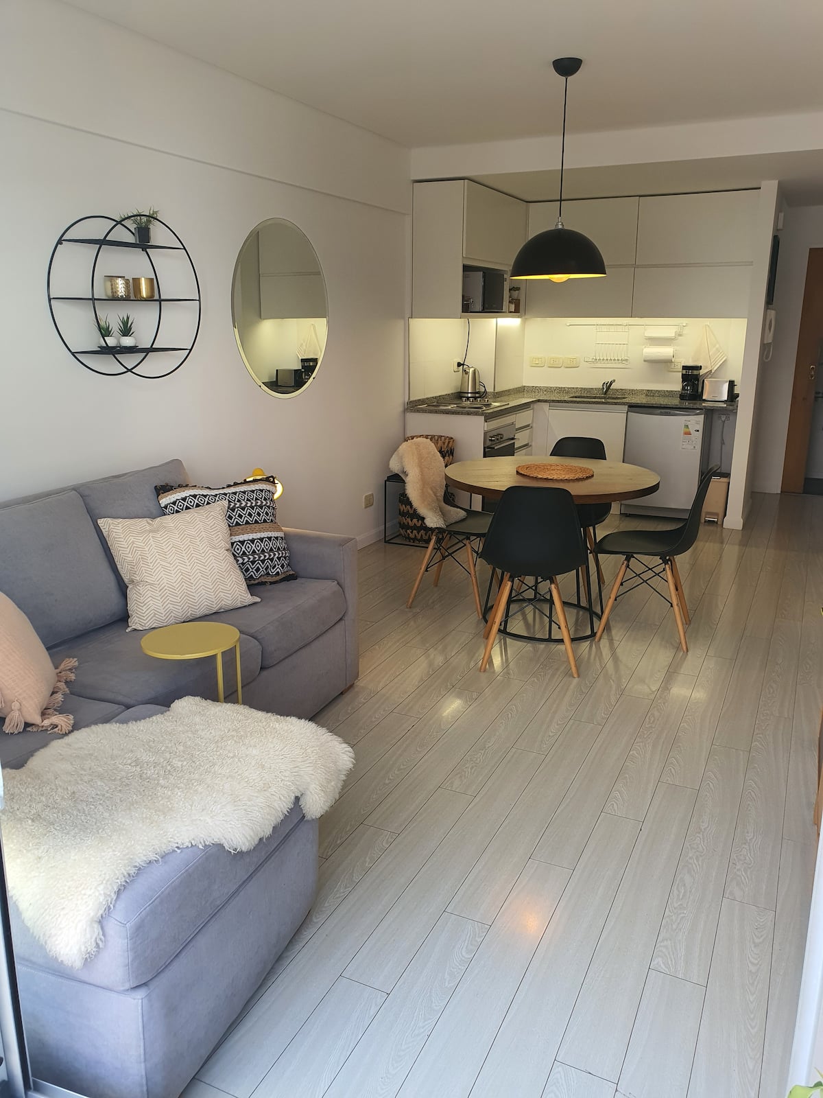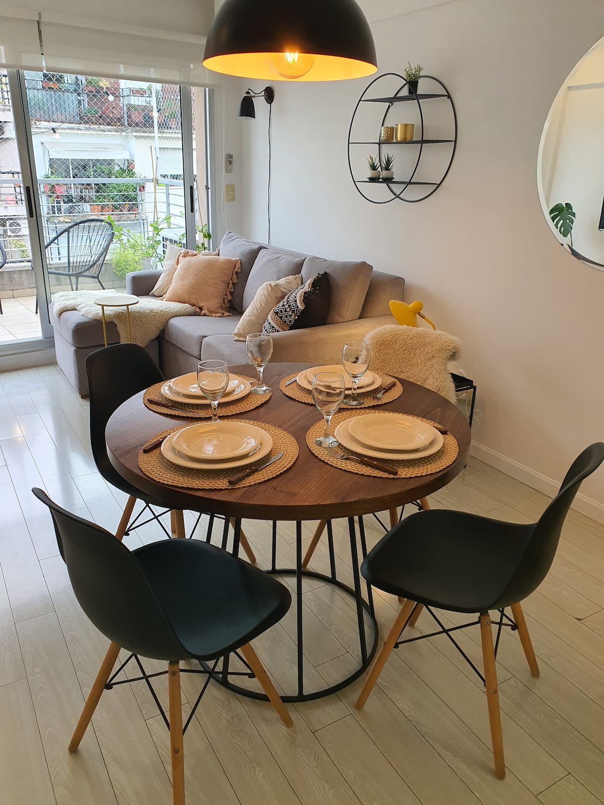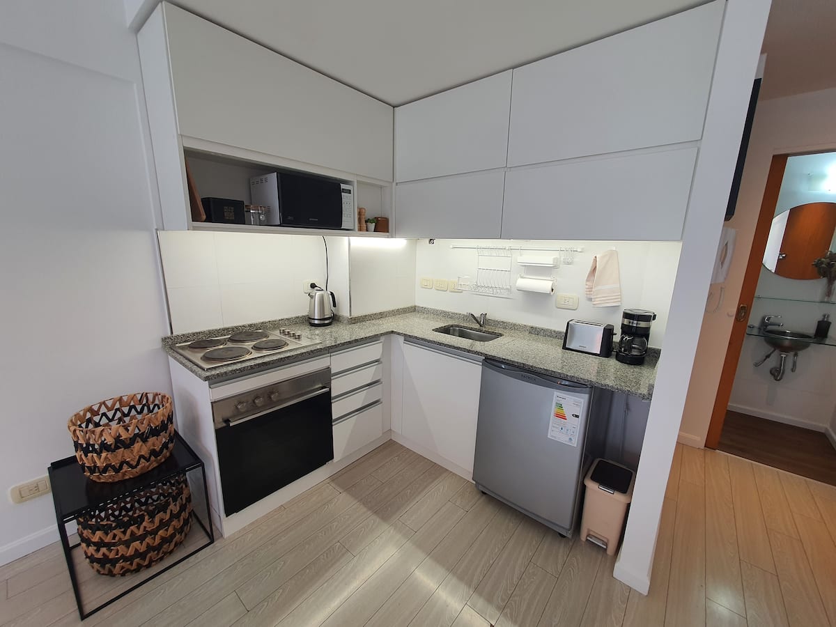 Apartamento em duplex em Palermo Soho, com 1 quarto, com varanda e terraço. No piso térreo, sala de estar com piso de madeira, iluminação regulável, ar-condicionado e Smart TV; acesso a uma varanda ensolarada por porta de vidro do chão ao teto. Cozinha totalmente equipada com itens como cafeteira, torradeira, micro-ondas, forno elétrico, fogão/“anafe” e utensílios. No andar superior, suíte com banheiro completo e closet, além de espaço de trabalho/estúdio. O prédio dispõe de piscina e área de ch