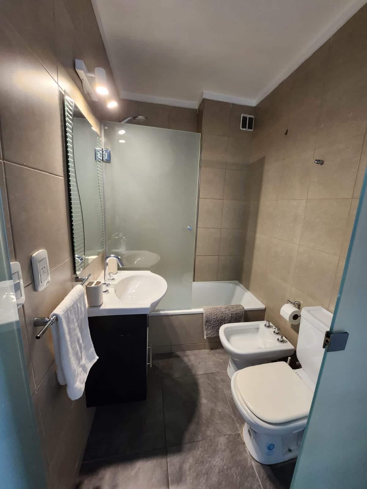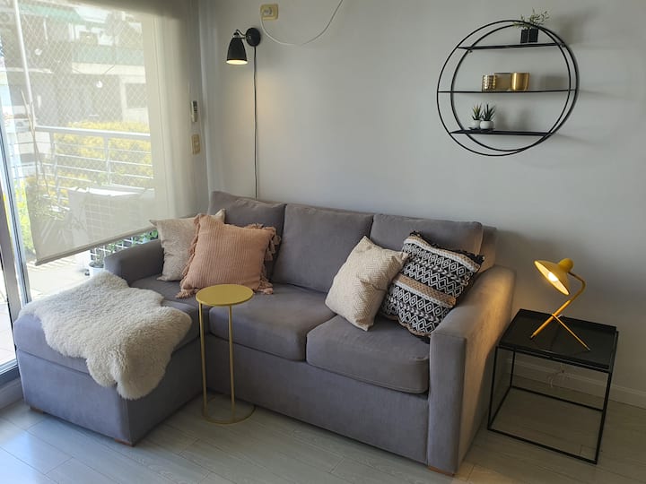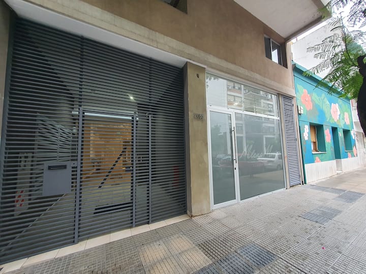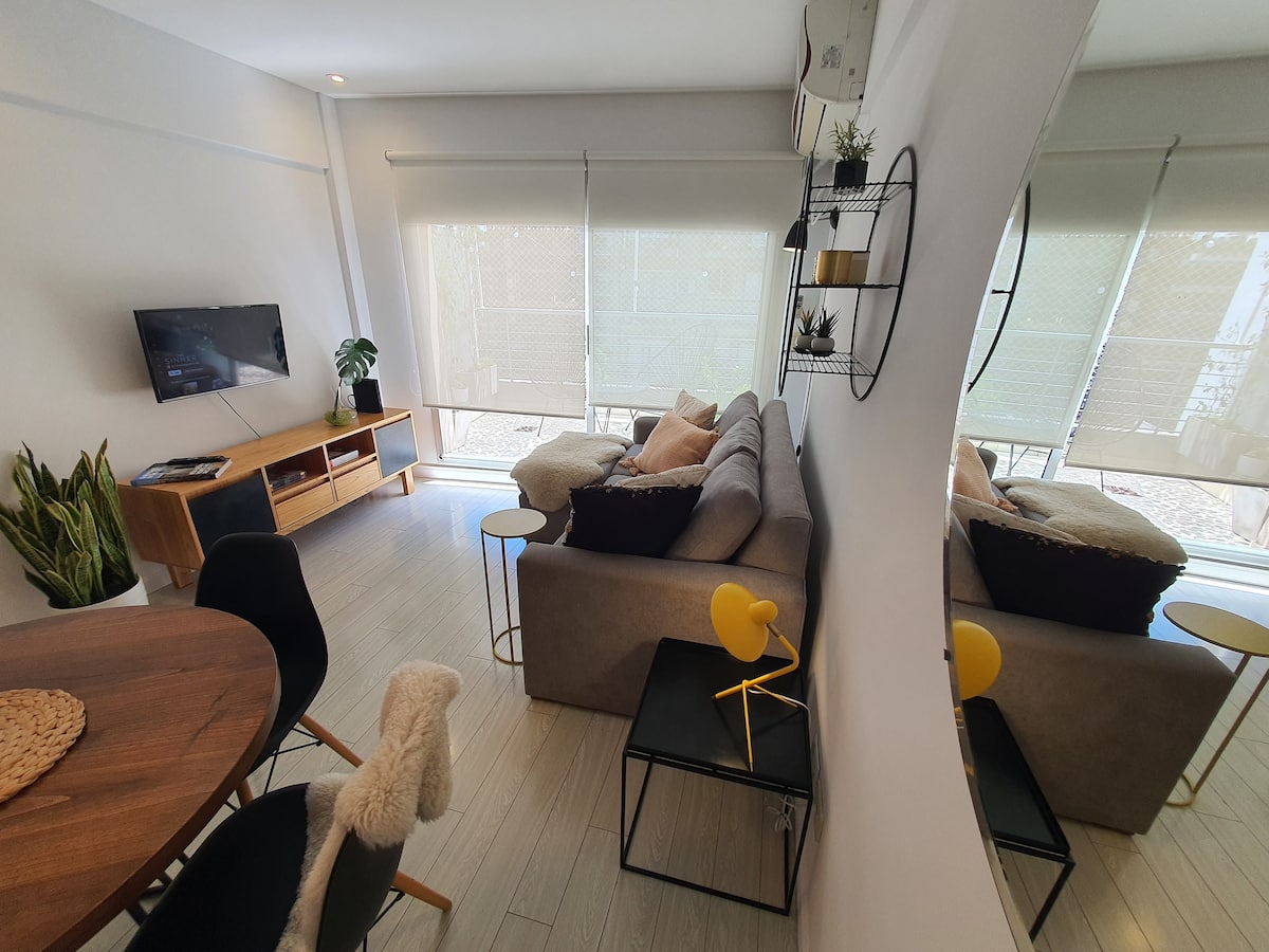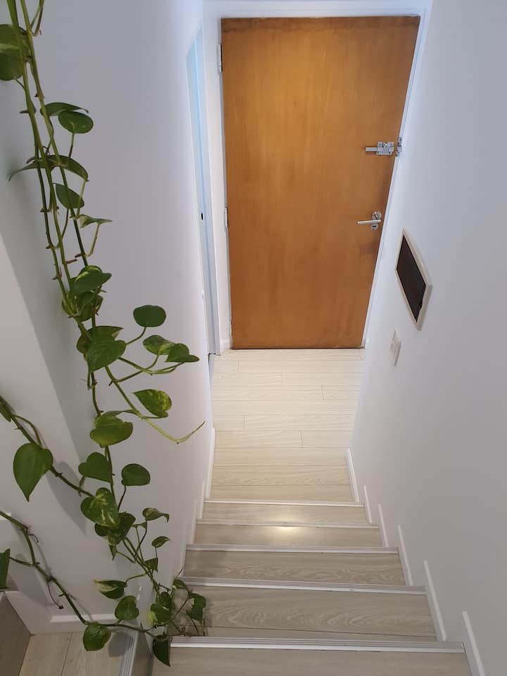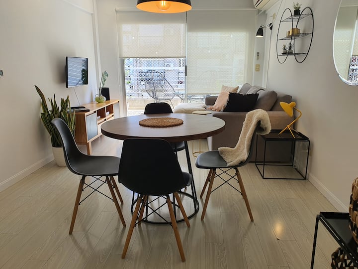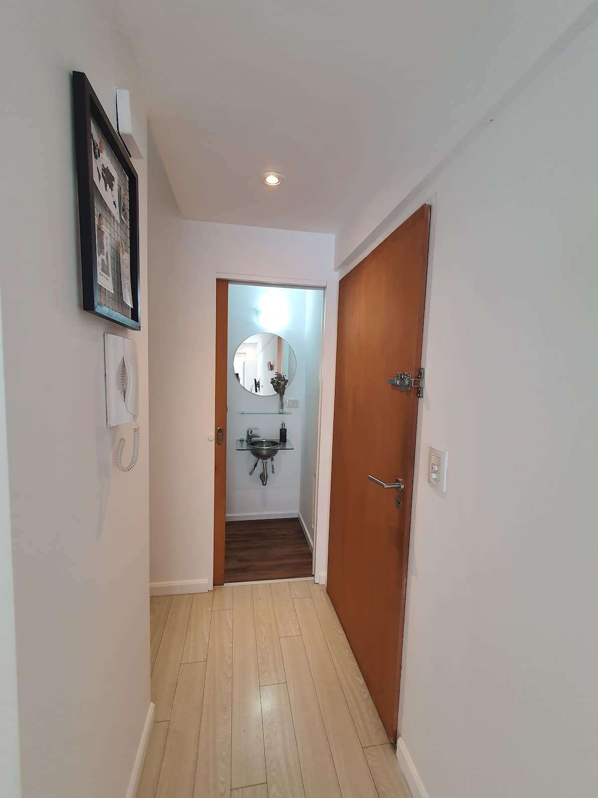 Apartamento em duplex em Palermo Soho, com 1 quarto, com varanda e terraço. No piso térreo, sala de estar com piso de madeira, iluminação regulável, ar-condicionado e Smart TV; acesso a uma varanda ensolarada por porta de vidro do chão ao teto. Cozinha totalmente equipada com itens como cafeteira, torradeira, micro-ondas, forno elétrico, fogão/“anafe” e utensílios. No andar superior, suíte com banheiro completo e closet, além de espaço de trabalho/estúdio. O prédio dispõe de piscina e área de ch