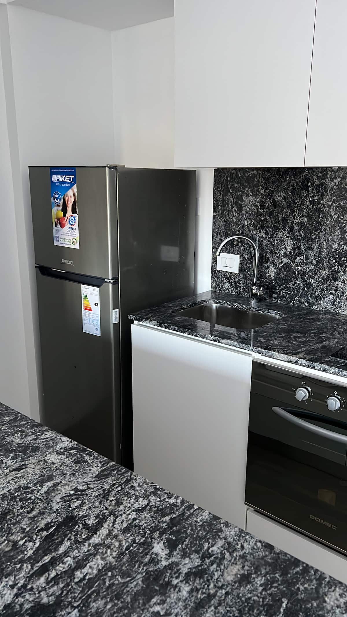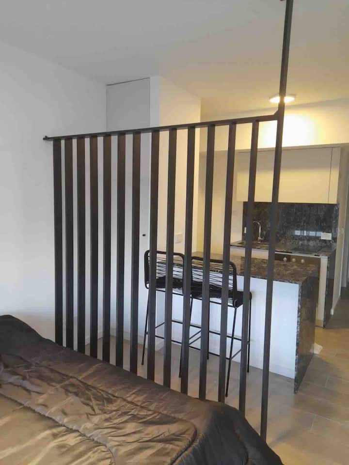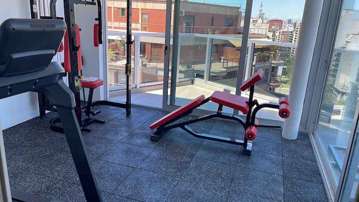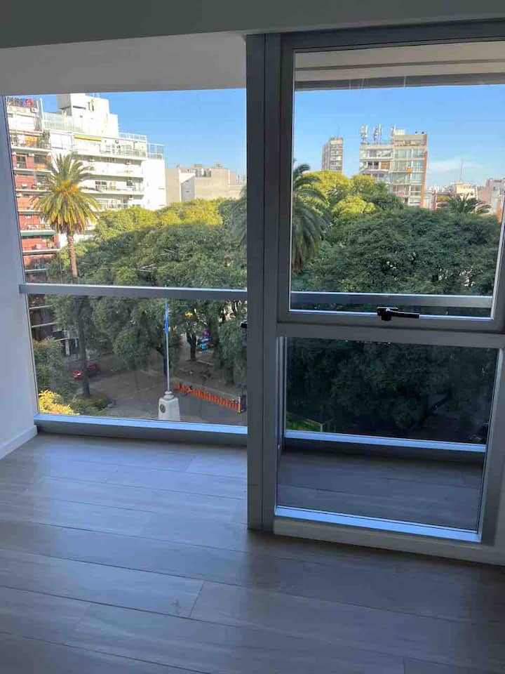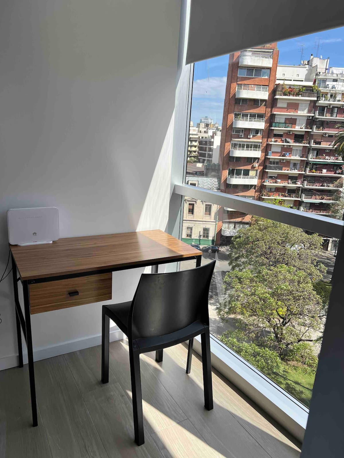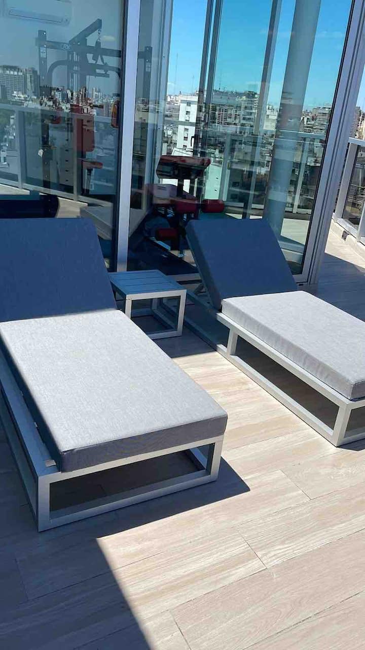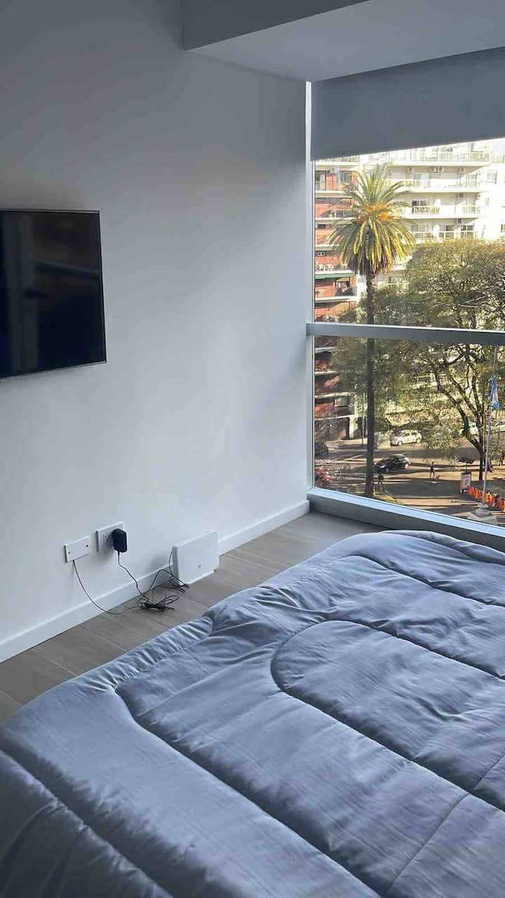 Apartamento de 30 m² no edifício “Palais Salguero”, em Palermo. Unidade com 1 quarto (estúdio) e área externa: varanda pequena, com cama de casal. O prédio tem piscina, academia e área de churrasco. Entrega em setembro de 2023. O apartamento tem ar-condicionado, geladeira com freezer, forno e fogão elétrico. Há TV sem cabo, com acesso à internet.
