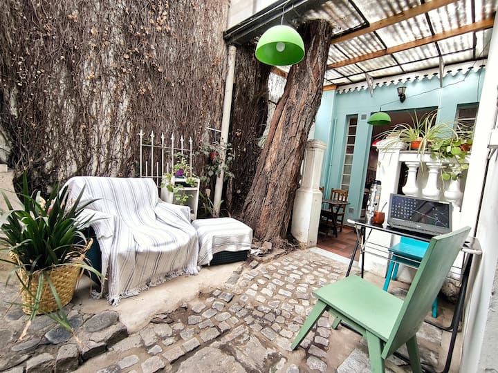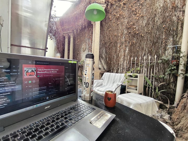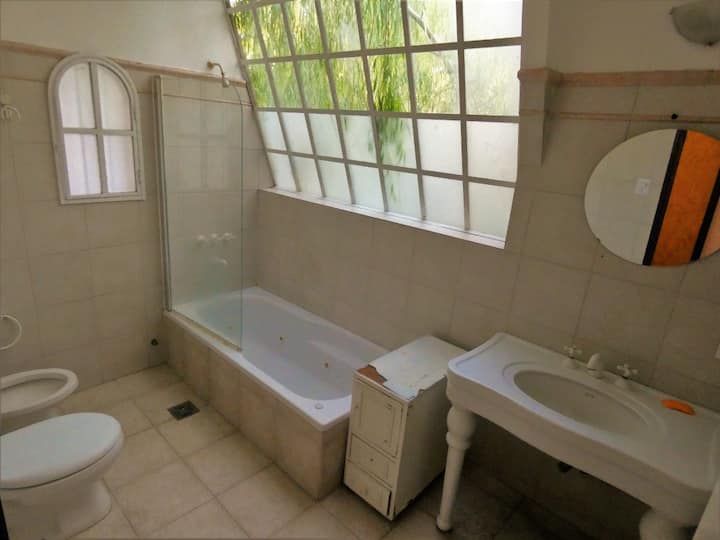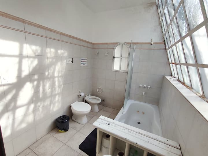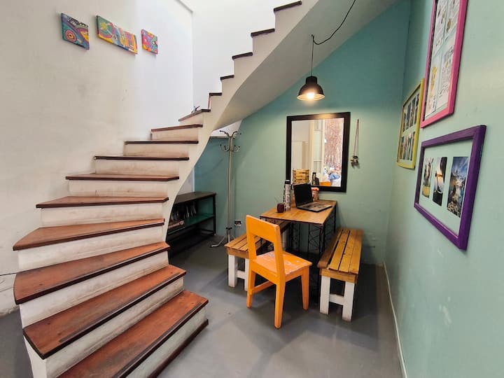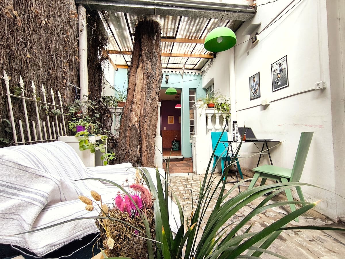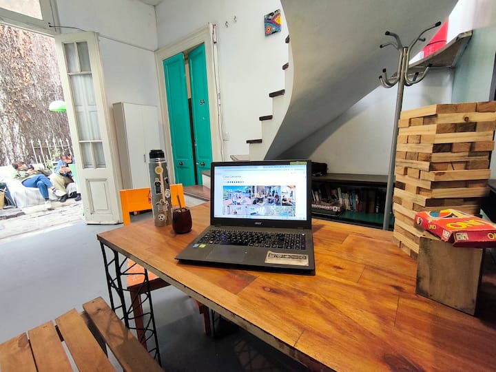 Casa compartilhada em Palermo, no térreo e no primeiro andar, com 11 quartos privativos com cama de casal. No térreo, há 6 quartos privativos, 2 banheiros completos compartilhados e áreas de jantar e estar, além de cozinha totalmente equipada. O acesso inclui chave individual para a casa e para o quarto, que conta com cama de casal, roupa de cama, mesa, armário, escrivaninha com cadeira e janela, com ventilador e aquecimento elétrico. A cozinha comum dispõe de 3 geladeiras, 2 fornos e micro-onda