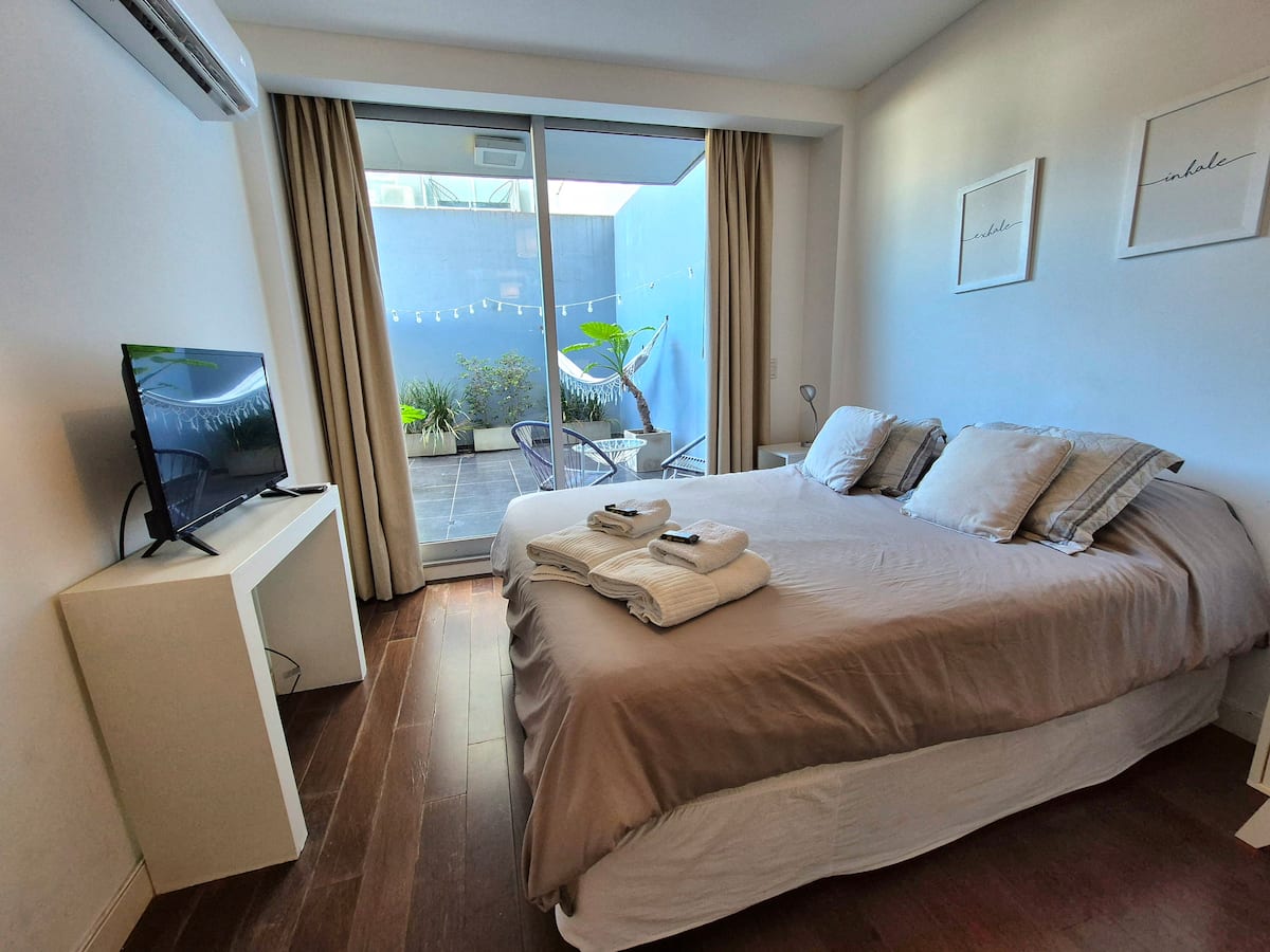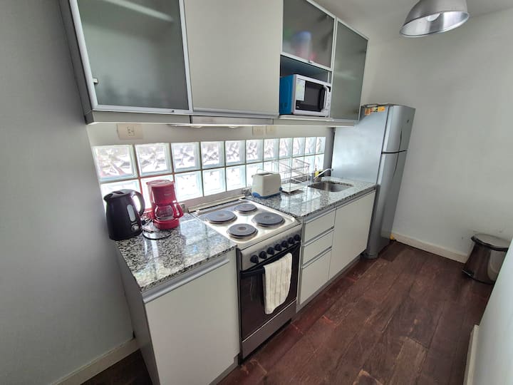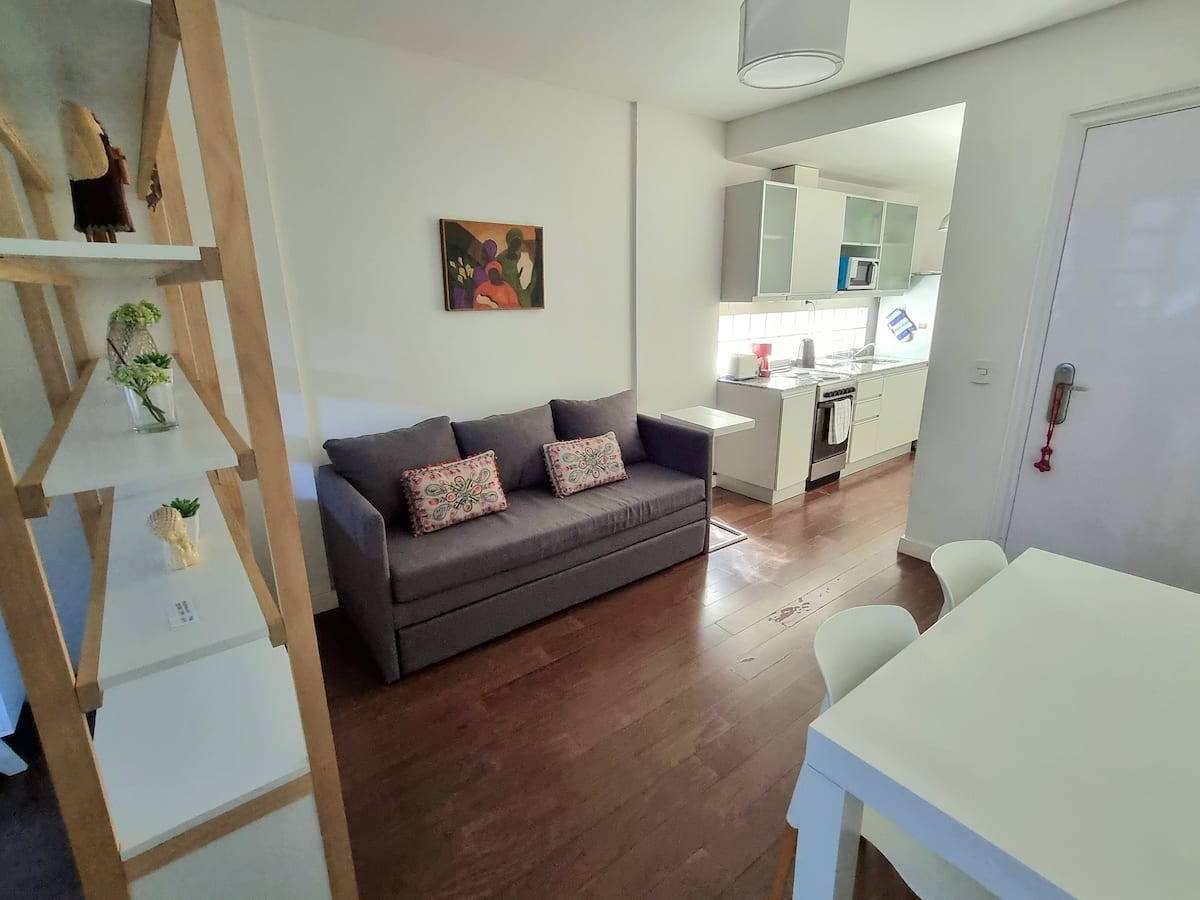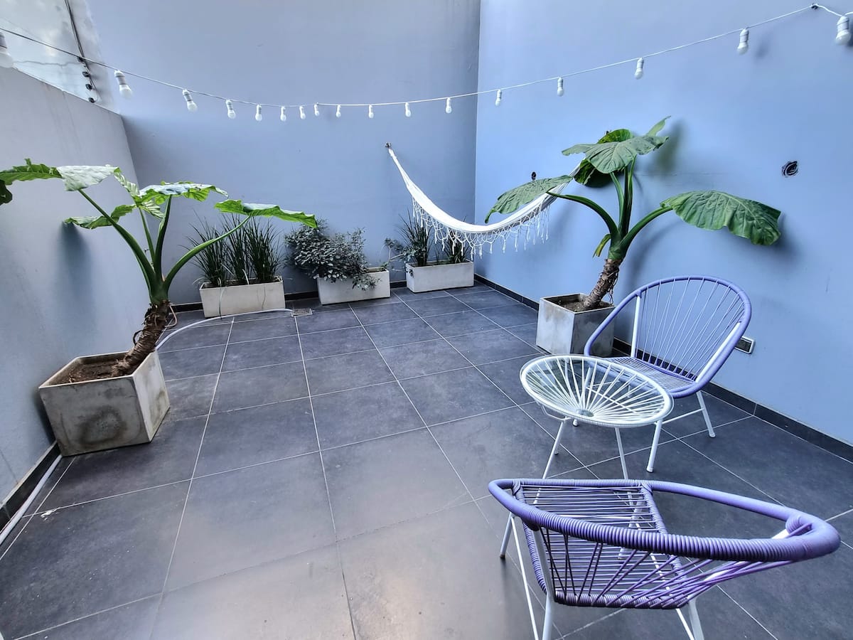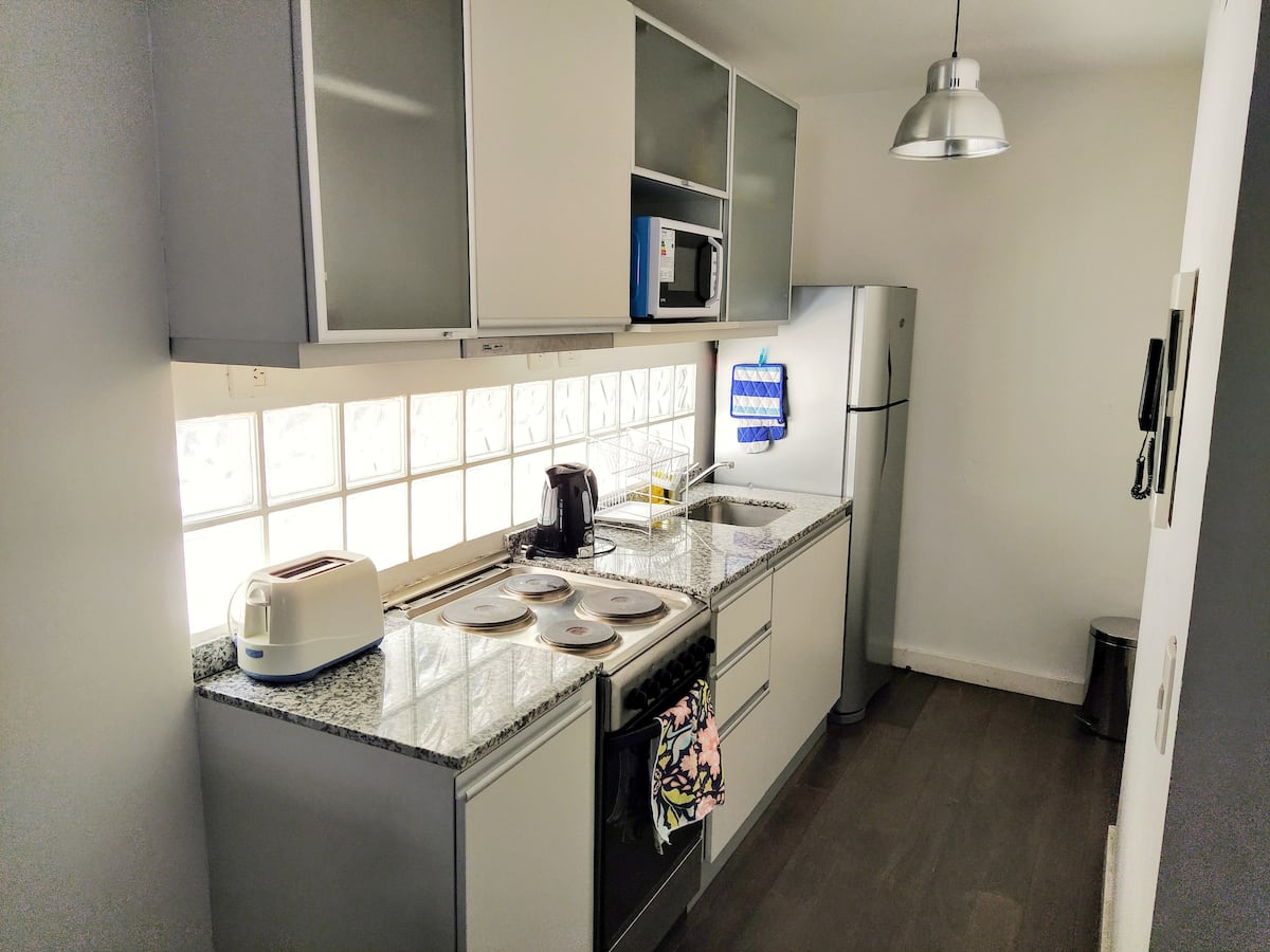 Kitnet mobiliada em Palermo, em rua tranquila, com pátio privativo. O imóvel tem cama de casal e sofá-cama, TV Smart com Netflix e TV a cabo, WiFi de 600 MB, ar-condicionado (função quente e fria) e banheiro completo com banheira e bidê. A cozinha dispõe de geladeira com freezer, forno com cooktop, micro-ondas, torradeira e chaleira elétrica, além de utensílios. O edifício tem setor de churrasqueira, salão de usos múltiplos e lavanderia no último andar, com uso mediante reserva. A tarifa inclui