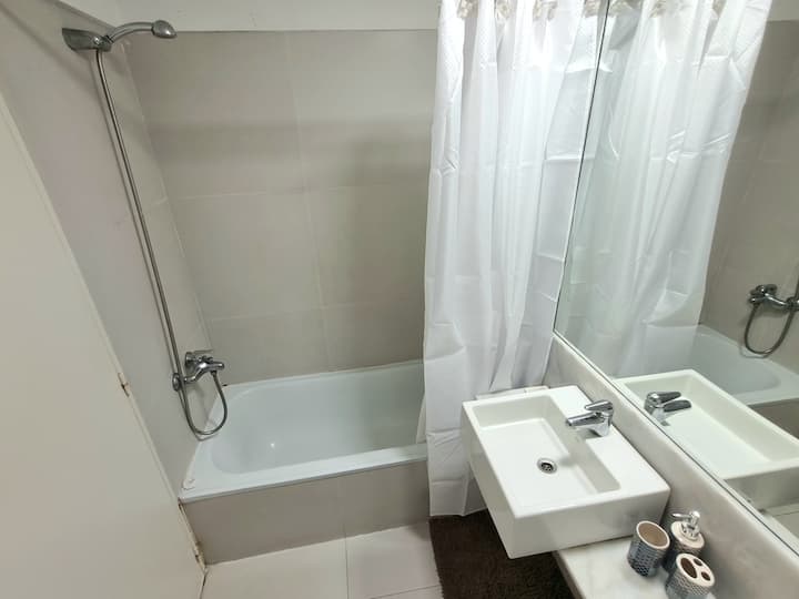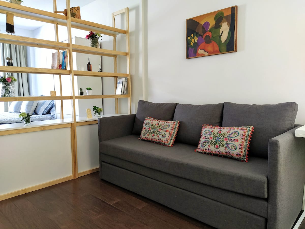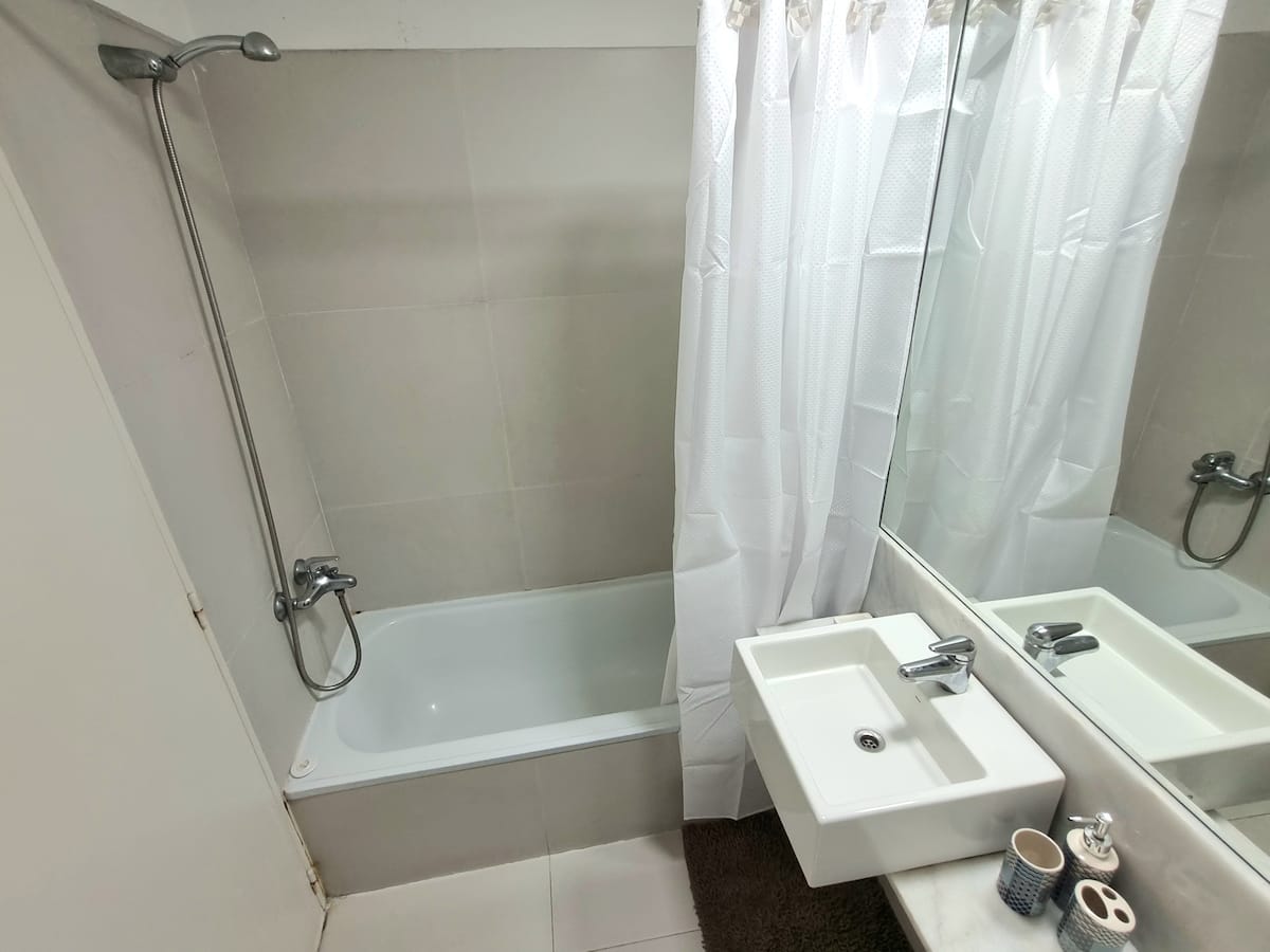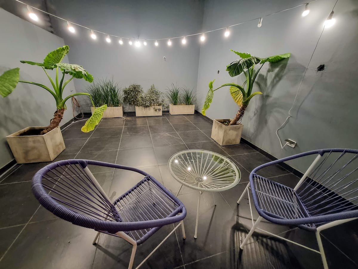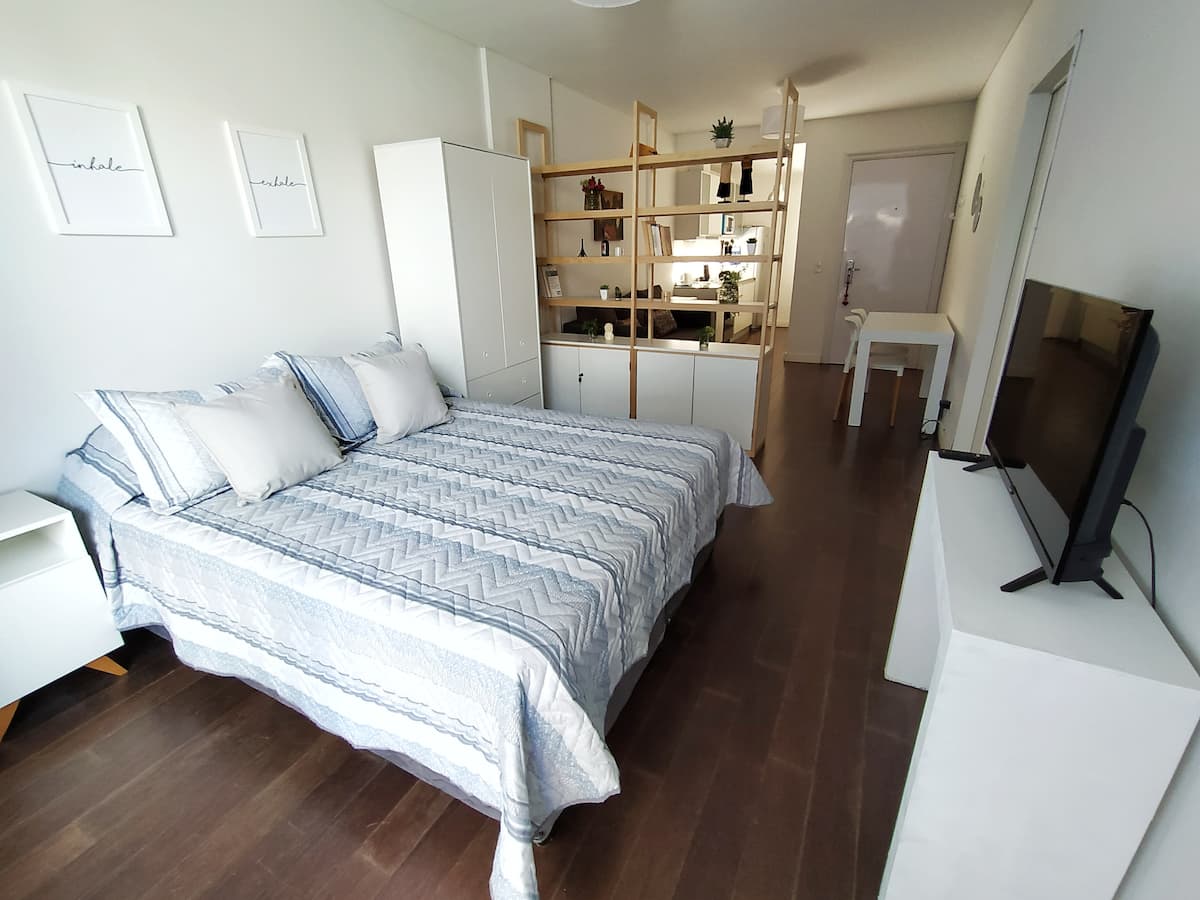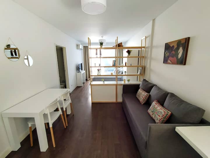 Kitnet mobiliada em Palermo, em rua tranquila, com pátio privativo. O imóvel tem cama de casal e sofá-cama, TV Smart com Netflix e TV a cabo, WiFi de 600 MB, ar-condicionado (função quente e fria) e banheiro completo com banheira e bidê. A cozinha dispõe de geladeira com freezer, forno com cooktop, micro-ondas, torradeira e chaleira elétrica, além de utensílios. O edifício tem setor de churrasqueira, salão de usos múltiplos e lavanderia no último andar, com uso mediante reserva. A tarifa inclui