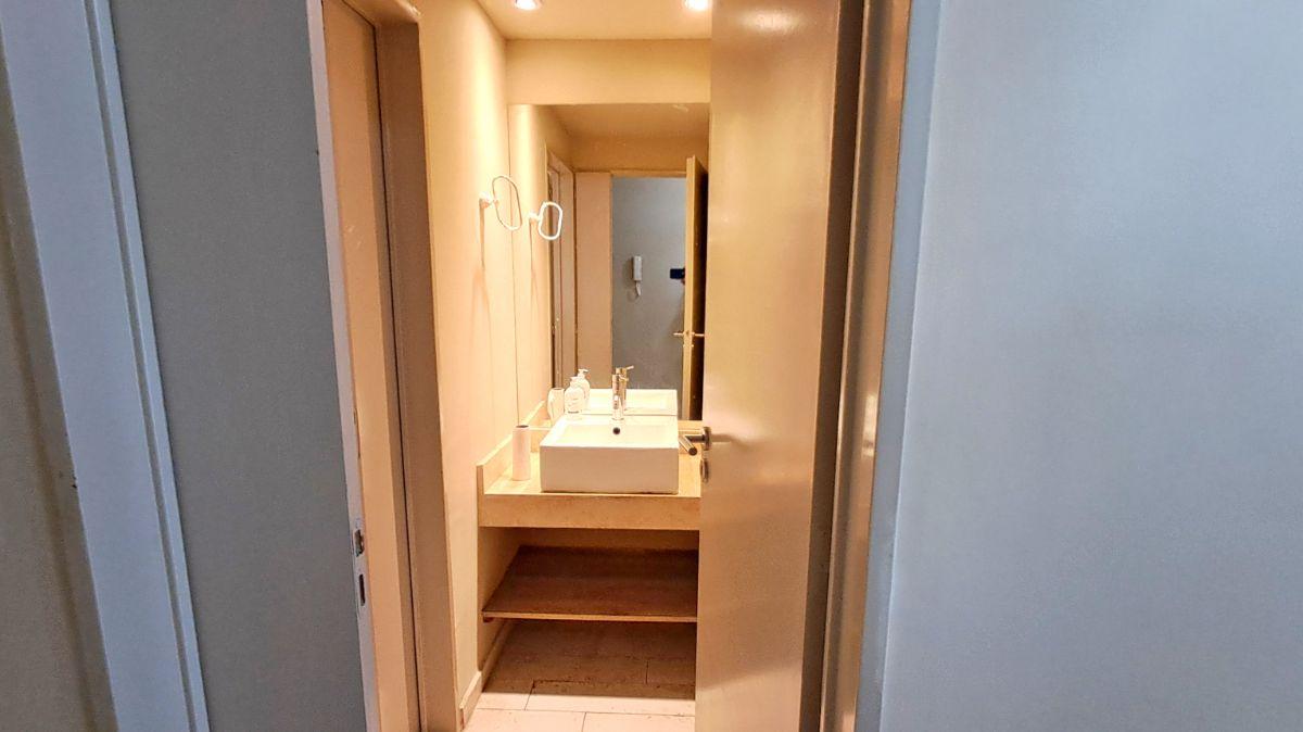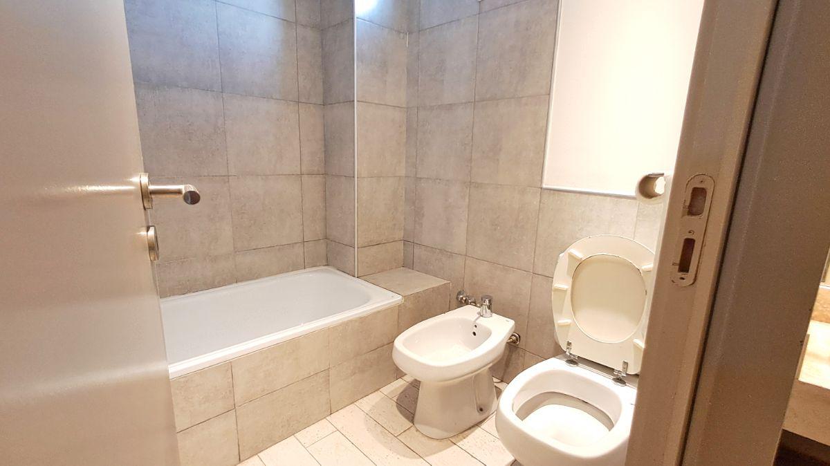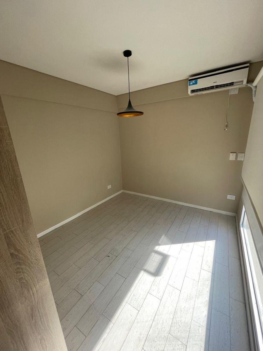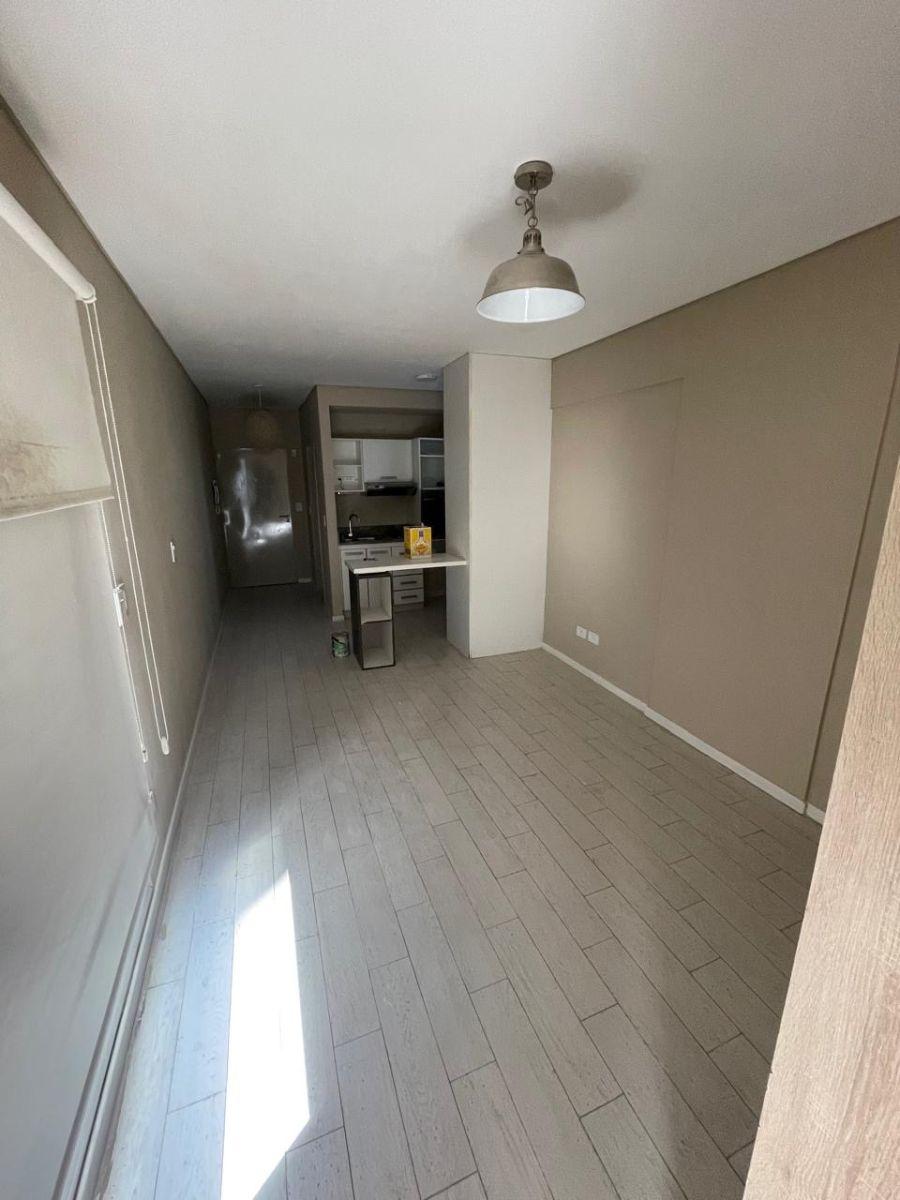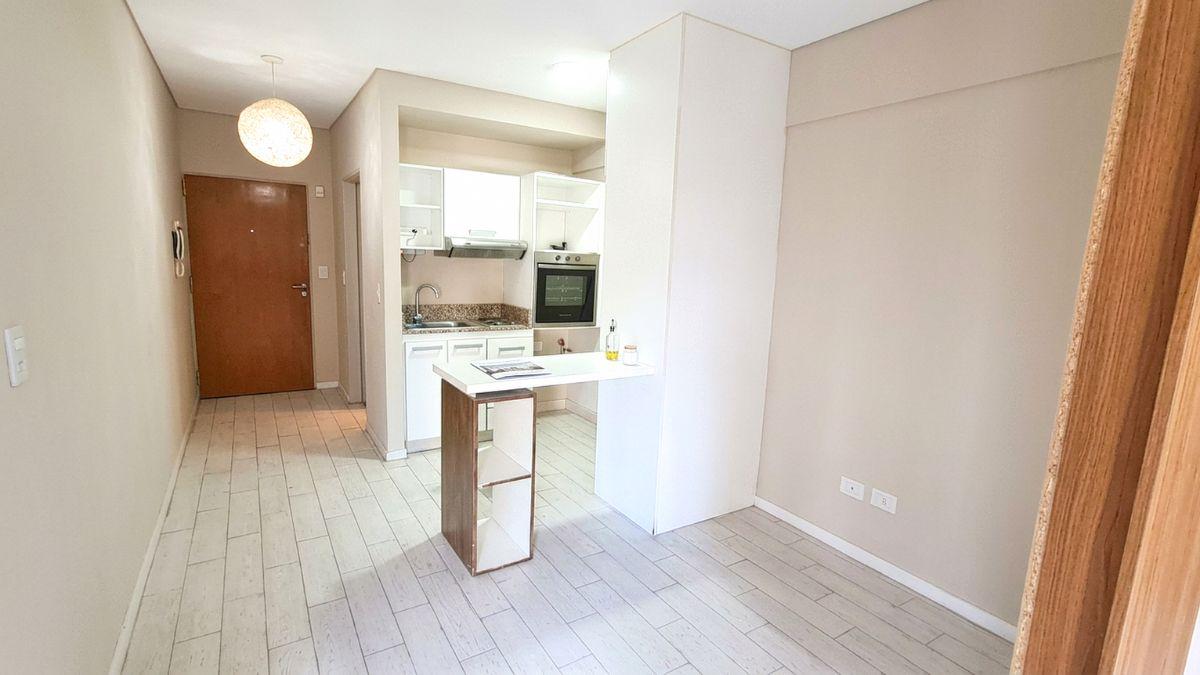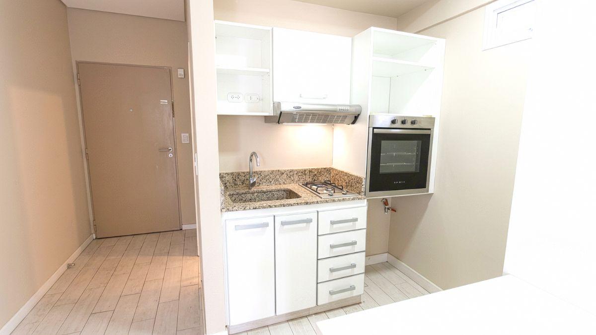 Apartamento de 1 ambiente divisível, no 3º andar, voltado para os fundos e com lateral, em Villa Urquiza/Parque Chas. Área de estar e jantar com cozinha integrada com móveis planejados (armários aéreos e base), fogão elétrico e conexão para máquina de lavar; dormitório com armário embutido. Banheiro completo com antebanheiro com banheira, aquecimento de água central e ar-condicionado split frio/calor. Prédio com 8 anos de idade, com salão de festas (SUM), lavanderia e área de churrasco. Locação