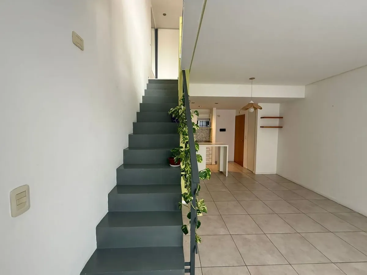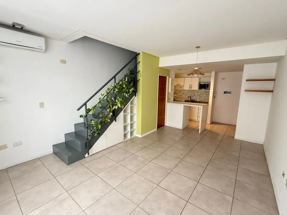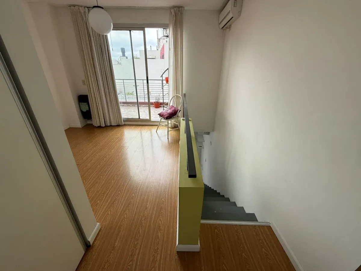 Apartamento de 2 ambientes em Parque Chas, no 1º andar por escada, com hall compartilhado com outra unidade. No acesso, há sala de estar e jantar com ar-condicionado e ventilação para uma sacada tipo balcão francês; cozinha integrada com barra para refeições, espaço para geladeira, espaço para lavadora e instalação a gás, além de lavabo sob a escada. A escada leva ao quarto no 1º andar, com ar-condicionado, áreas de armazenamento, banheiro completo e saída para sacada de fundos; uma escada carac