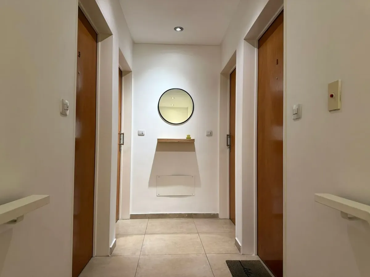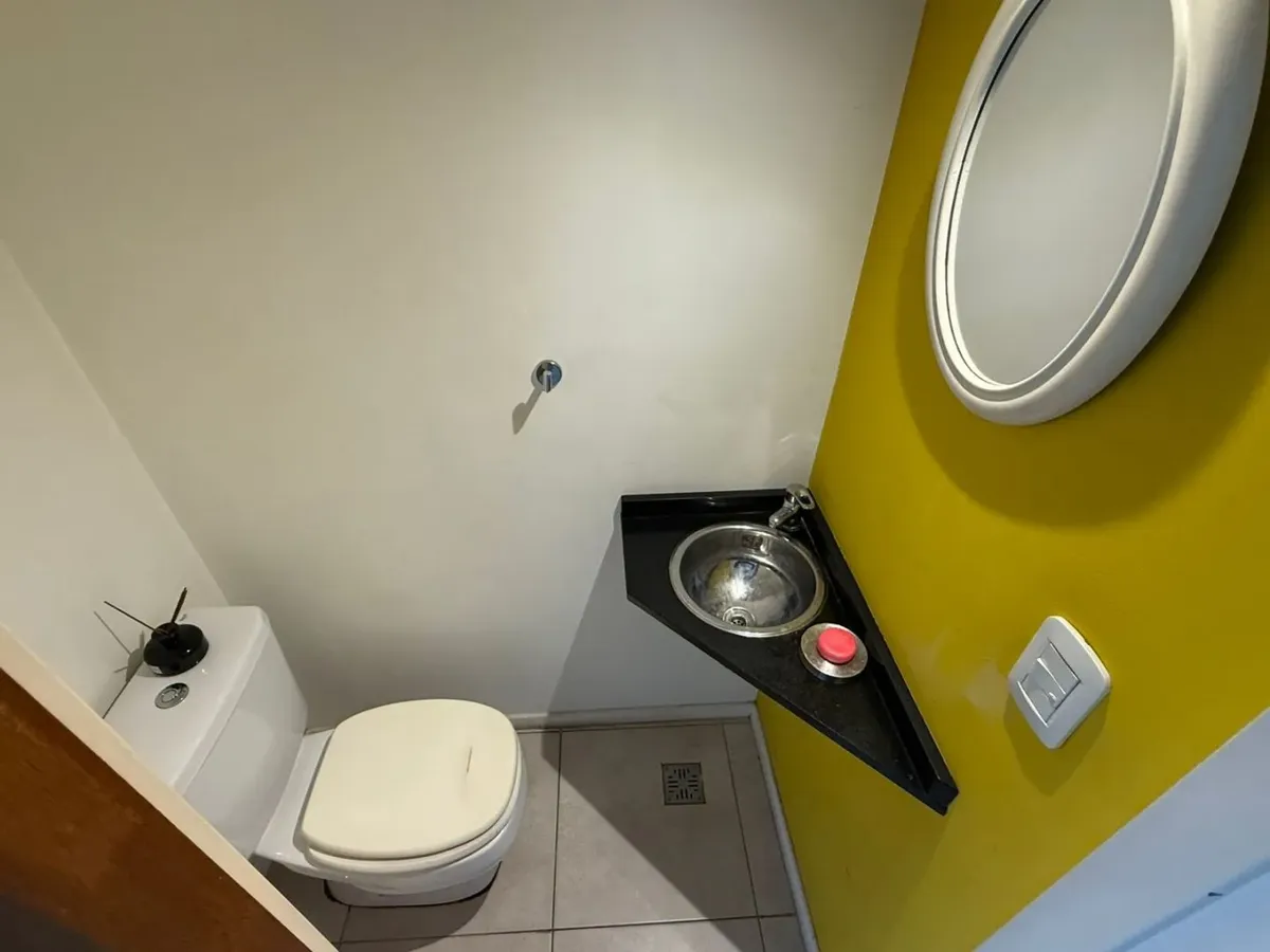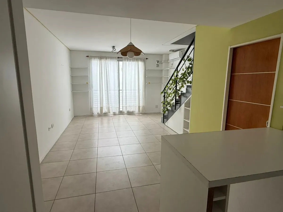 Apartamento de 2 ambientes em Parque Chas, no 1º andar por escada, com hall compartilhado com outra unidade. No acesso, há sala de estar e jantar com ar-condicionado e ventilação para uma sacada tipo balcão francês; cozinha integrada com barra para refeições, espaço para geladeira, espaço para lavadora e instalação a gás, além de lavabo sob a escada. A escada leva ao quarto no 1º andar, com ar-condicionado, áreas de armazenamento, banheiro completo e saída para sacada de fundos; uma escada carac