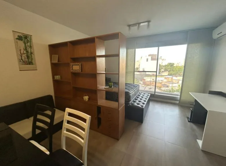 Apartamento de 1 quarto (ambiente) mobiliado, 4º andar de fundos, com varanda. Cozinha com espaço de armazenamento, fogão (anafe) e forno elétrico, mesa para 4 pessoas, cama de casal e escrivaninha. Possui closet (vestidor), banheiro completo com banheira, ar-condicionado e lavadora. O prédio tem solarium na cobertura. Locação temporária para no máximo 2 pessoas, sem animais. Condomínio incluído no aluguel, com despesas à parte.