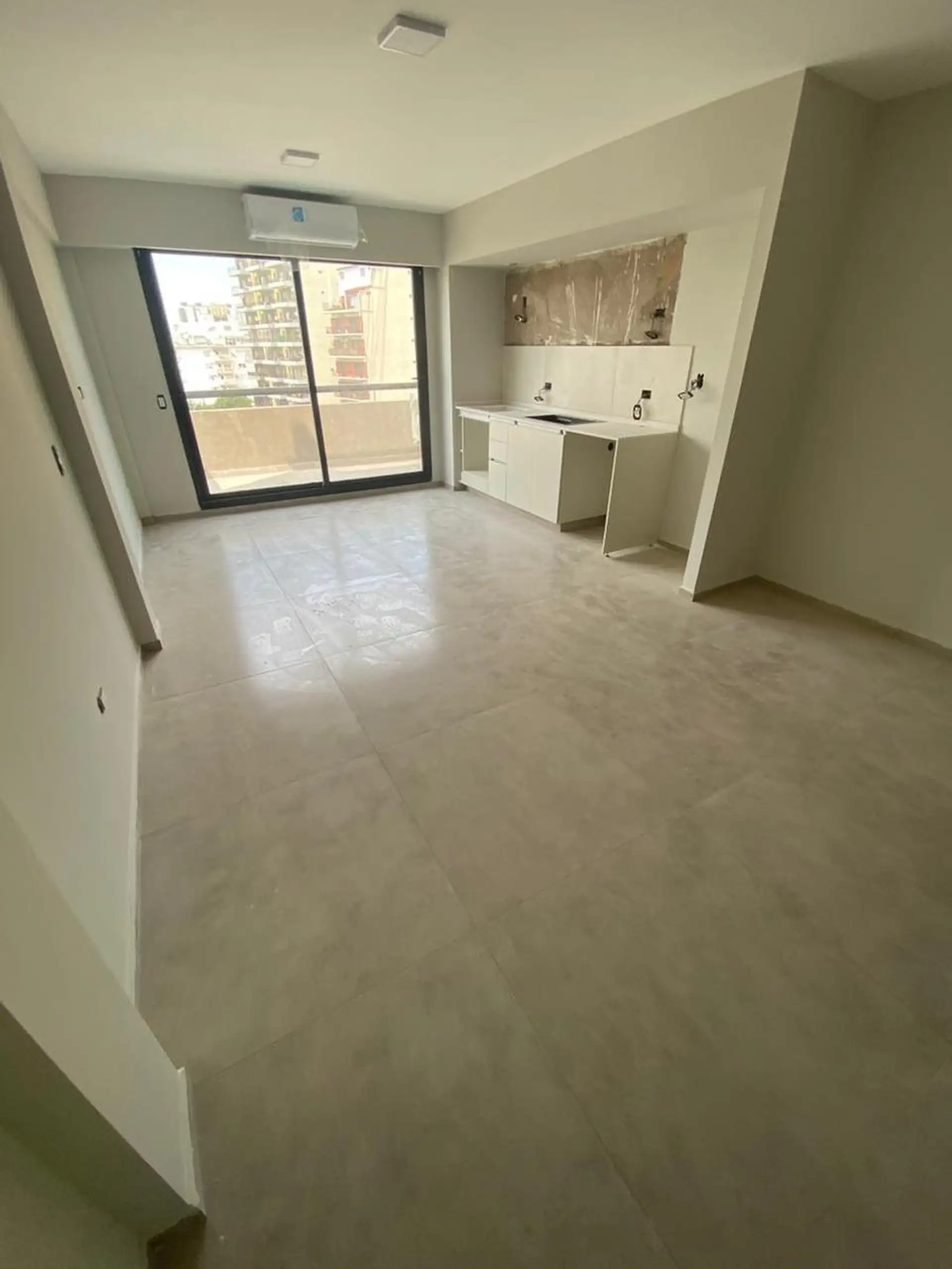 Kitnet novo (nunca habitado) em Parque Patricios, com cozinha integrada e banheiro completo. Há saída para varanda. O imóvel conta com ar-condicionado frio/calor instalado, balcões de cozinha com granito, torneiras FV e frentes de armários planejados. O prédio tem 9 andares, elevadores automáticos, pisos em porcelanato retificado, esquadrias de alumínio preto e sistema central de água quente. Previsão de entrega: março/abril de 2026.
