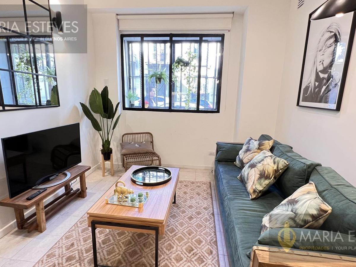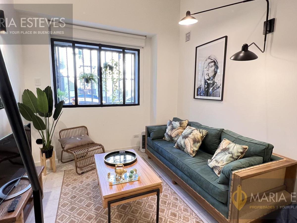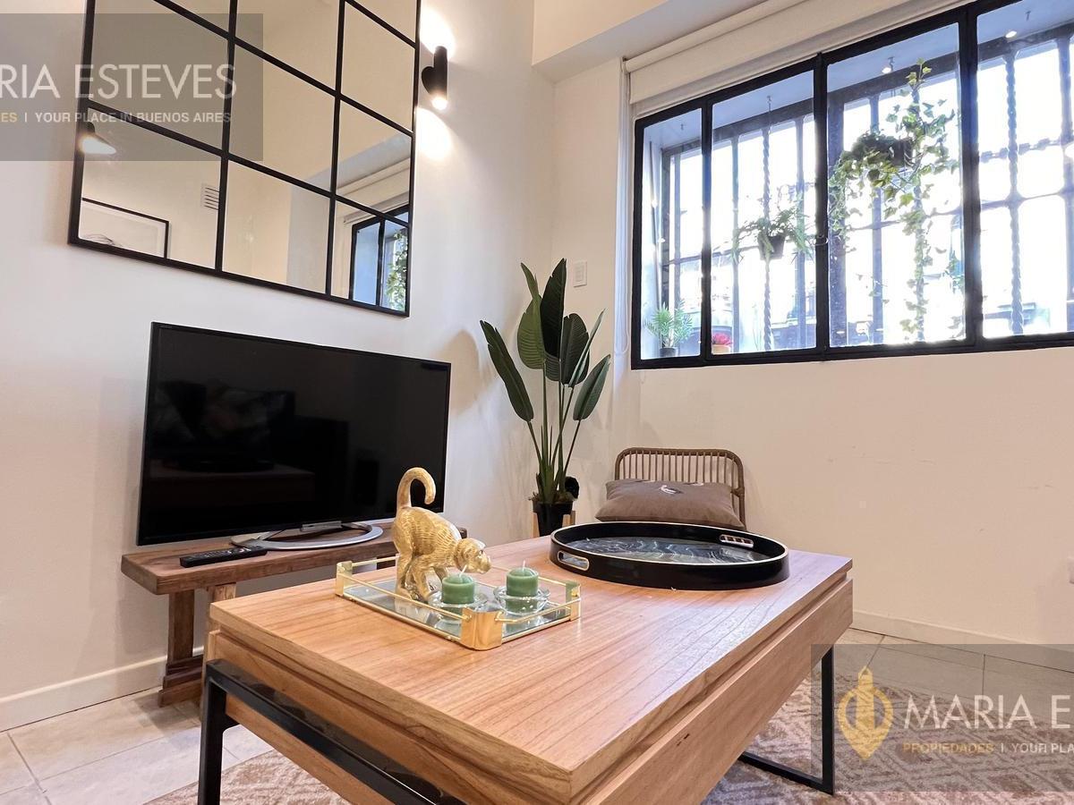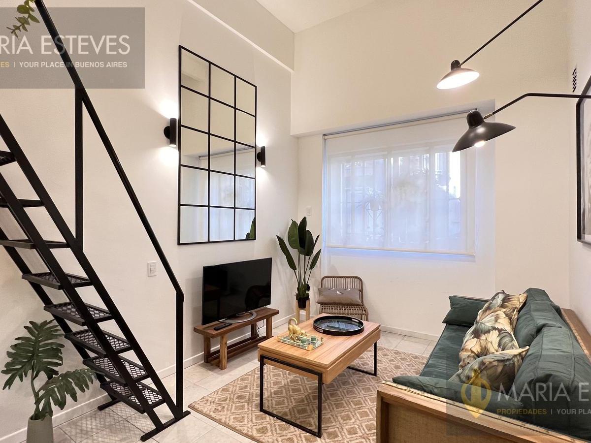 Loft de 1 quarto em Parque Patricios, em nível térreo (pb) de um edifício antigo recuperado. Unidade reformada recentemente, com acesso por rampas, sala de estar e sala de jantar com cozinha e banheiro completo. O mezanino conta com quarto com cama de casal, banheiro com box e closet; há um sofá que pode ser usado como cama de solteiro. A área externa do prédio inclui terraço com área de churrasco, piscina, duchas, espreguiçadeiras e sombrinhas para uso dos hóspedes. O aluguel é temporário, com