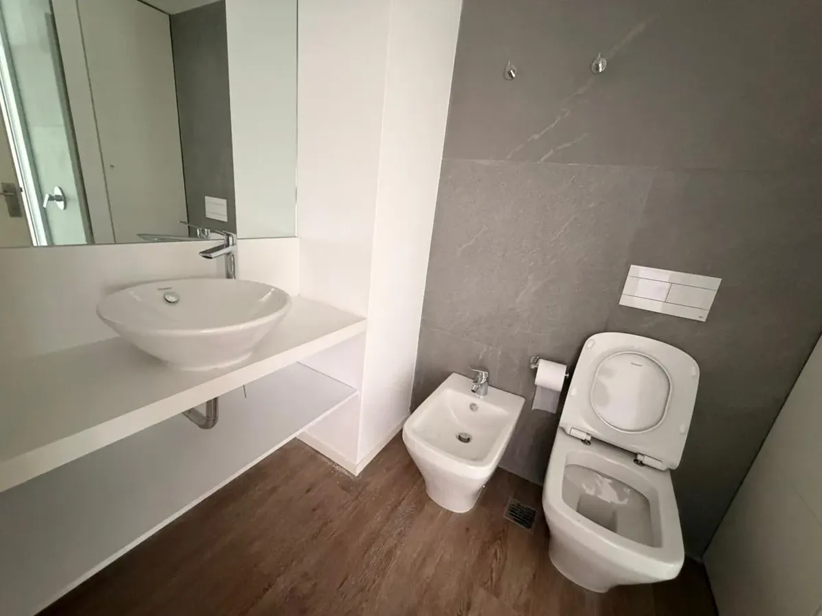 Kitnet para aluguel sem mobília no Quartier del Bajo, em Puerto Madero. Cozinha semi-integrada com armários na parte inferior e banheiro completo. O aluguel custa USD 850, mais condomínio e outras despesas. O prédio oferece piscina, salão de festas (SUM), área de churrasco, piscina aquecida, academia, sauna, sala de massagens, hidromassagem, lavanderia e segurança 24 horas.
