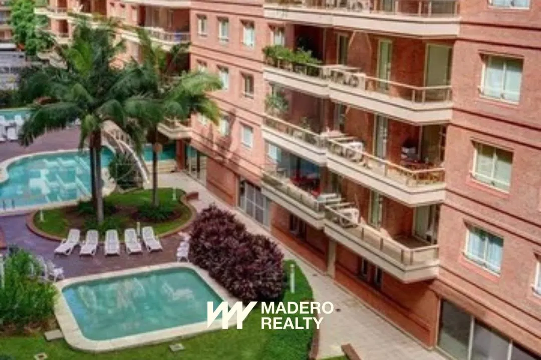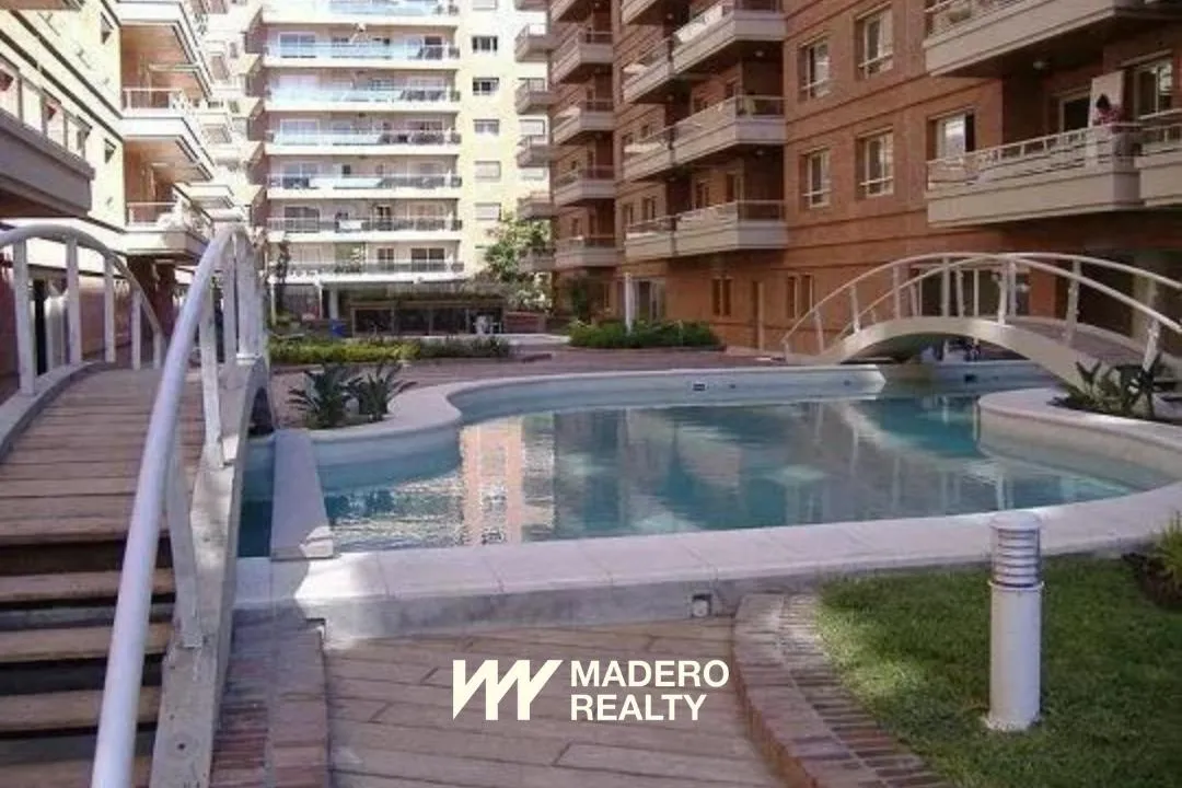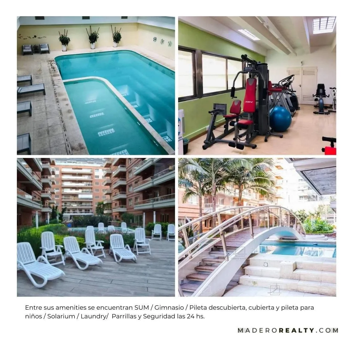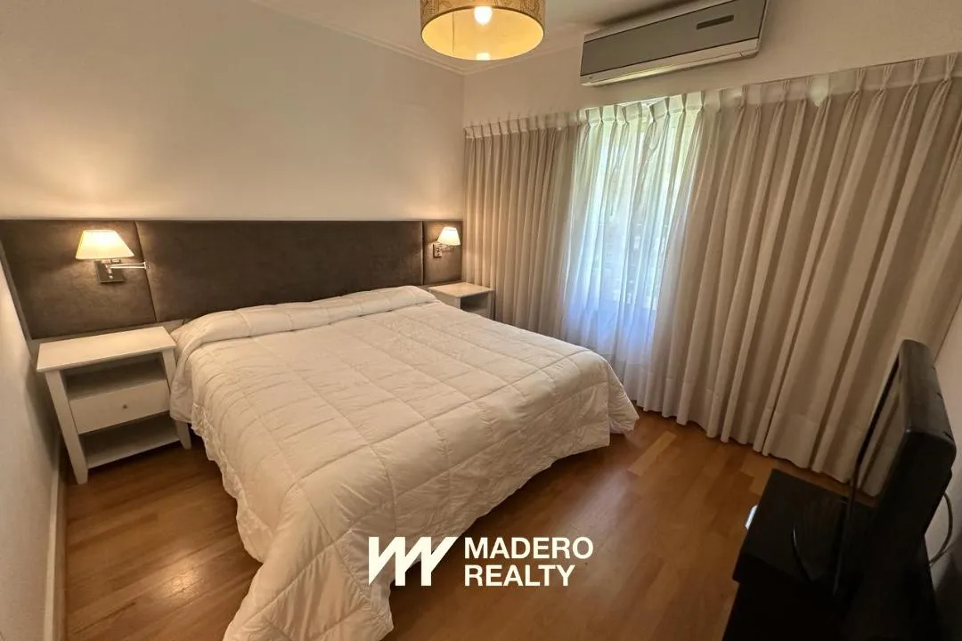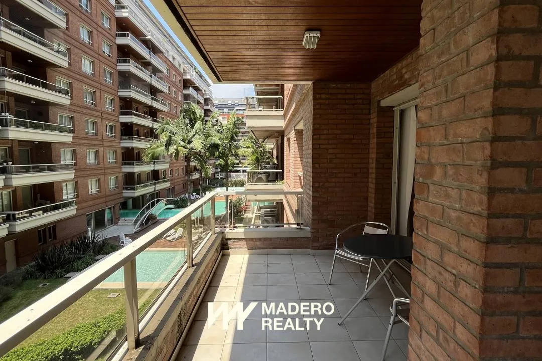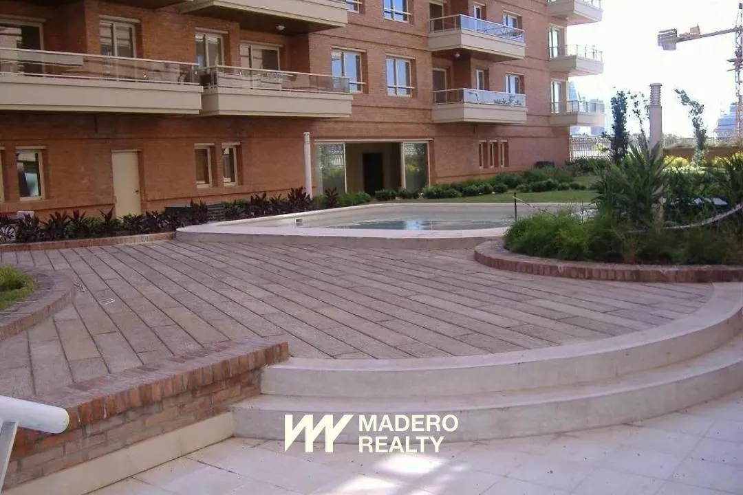 Apartamento de dois ambientes com 70 m² em primeira linha do dique, na Av. Olga Cossettini, com varanda e vista para o jardim interno e a piscina. Sala de jantar com saída para a varanda e sofá-cama, cozinha independente e quarto em suíte com banheiro completo e jacuzzi. Há lavabo de recepção e ar-condicionado (frio-calor) em todos os ambientes, TV LCD 32", equipamento de som e lava-roupa. O prédio tem 5 andares, janelas com vidro duplo, 3 subsolos com vagas de garagem fixas, piscina coberta cli
