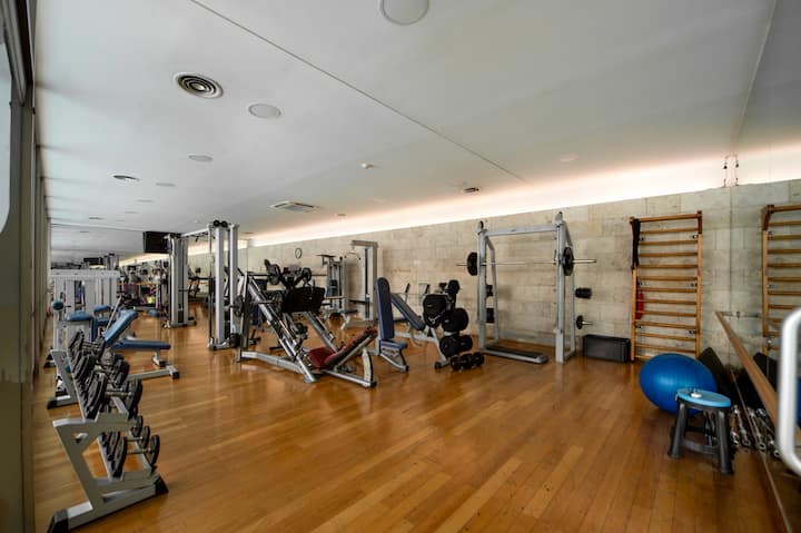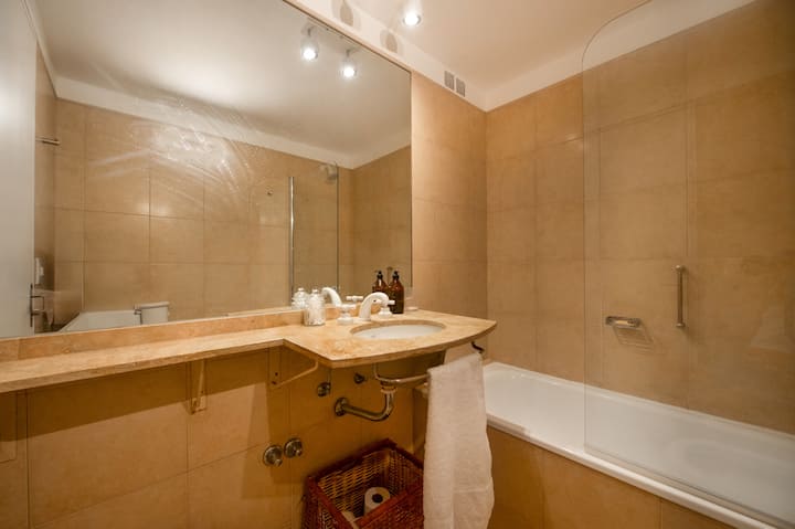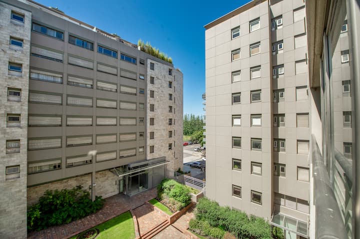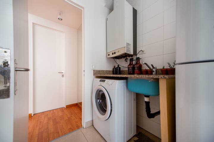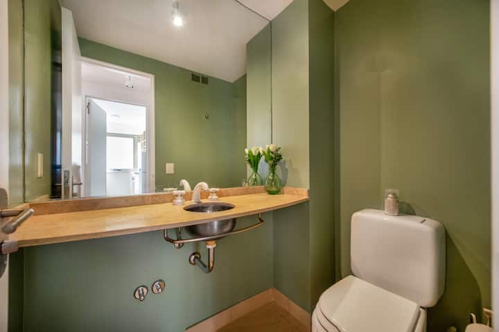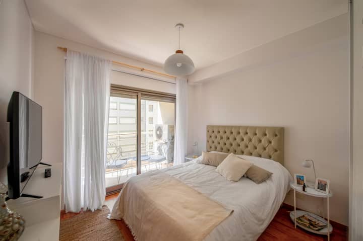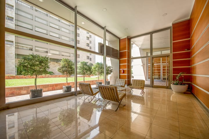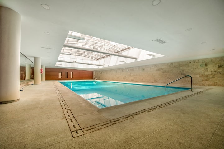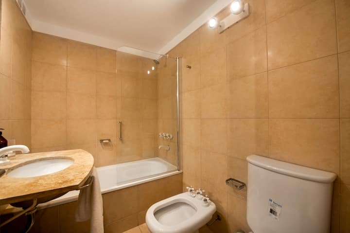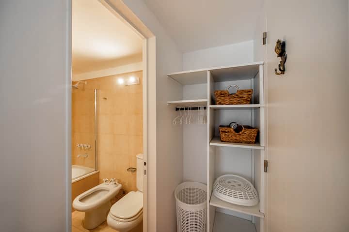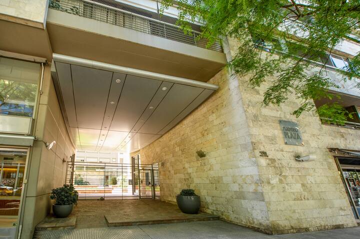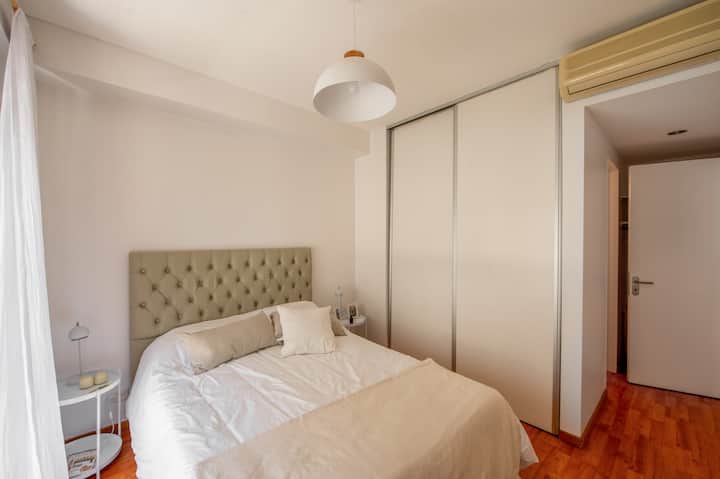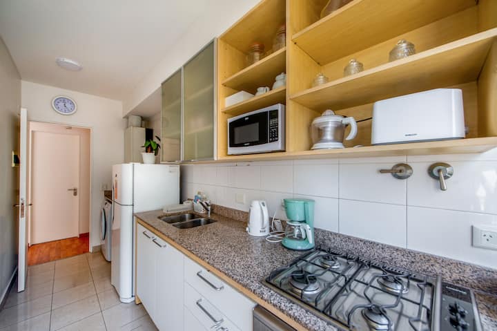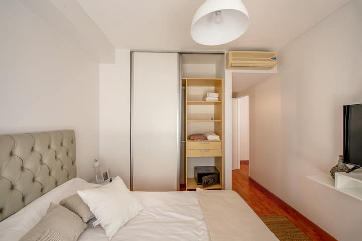 Apartamento de 2 ambientes em Puerto Madero. Sala com ar-condicionado e TV, e quarto com ar-condicionado, TV e varanda privativa. Banheiro social e banheiro privativo completo (en suite). Cozinha equipada com máquina de lavar no apartamento. O edifício tem segurança 24 horas, piscina aquecida disponível o ano todo e academia.