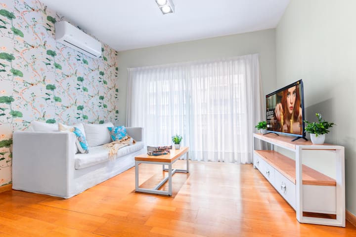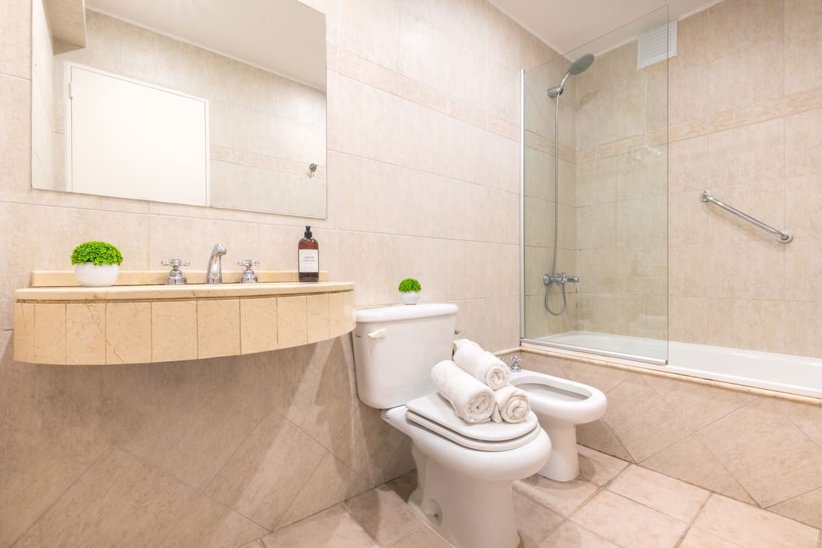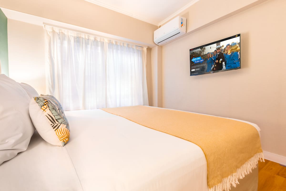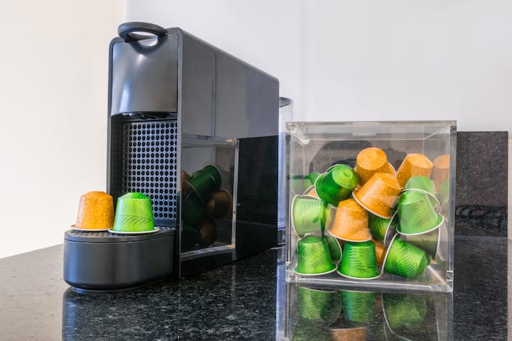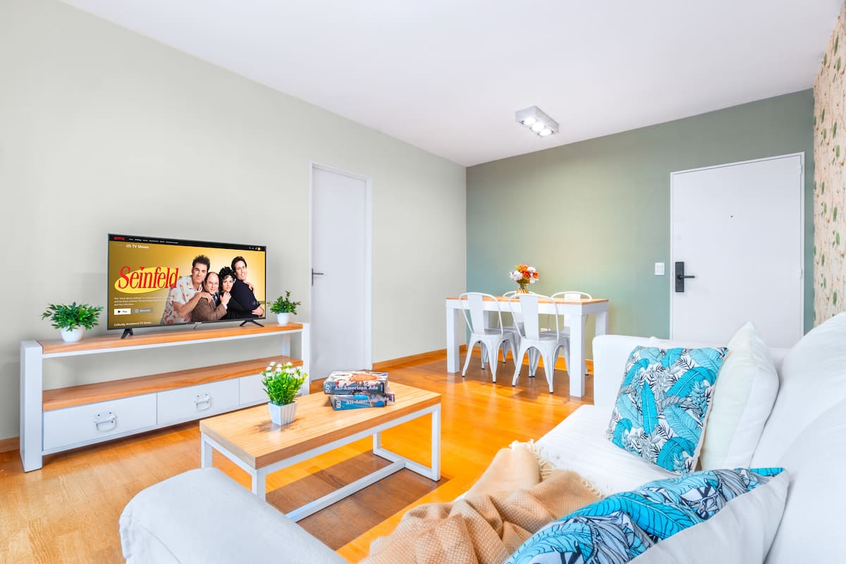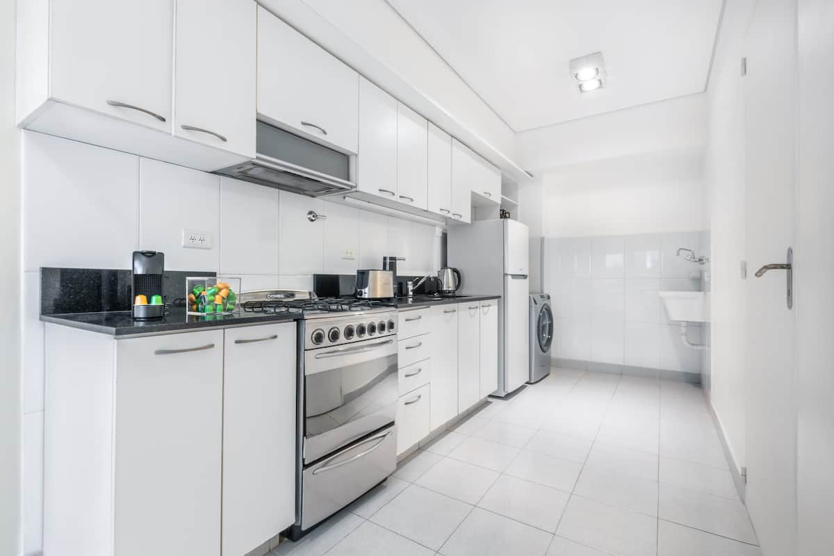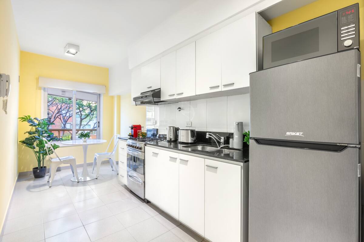 Apartamento de 1 quarto em Puerto Madero, com ar-condicionado e aquecimento central. Conta com varanda com mesa e rede de descanso, Wi-Fi e fechadura inteligente com código. Inclui cozinha com Nespresso, lavadora, torradeira, micro-ondas, chaleira elétrica, geladeira e forno, além de cama queen-size, secador de cabelo e TVs smart de 42" e 52" com Netflix. O prédio tem vigilância 24 horas e 2 piscinas sazonais; há vaga de garagem mediante cobrança.
