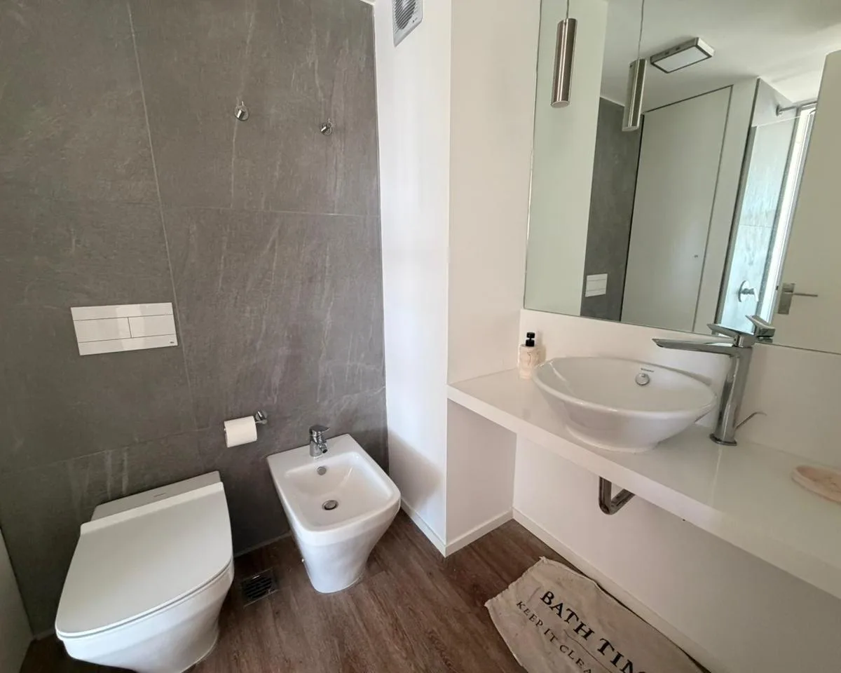 Kitnet em Puerto Madero, no Quartier del Bajo, sem mobília. Cozinha semi-integrada com armários na parte inferior e banheiro completo. Aluguel mensal de USD 800, mais condomínio e demais despesas. O complexo tem piscina, salão de festas, área de churrasco, piscina aquecida, academia, sauna, sala de massagens, hidromassagem, lavanderia e segurança 24 h. O Quartier del Bajo tem torres de 36 andares, inauguradas em dezembro de 2023.