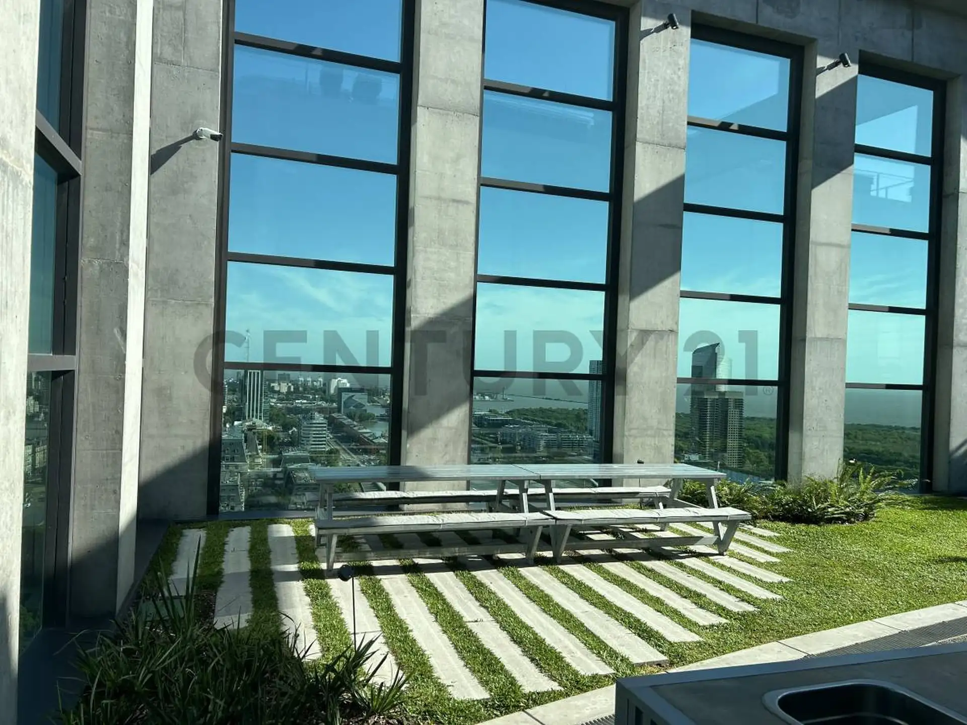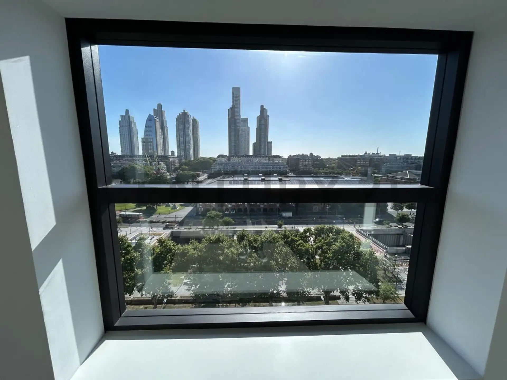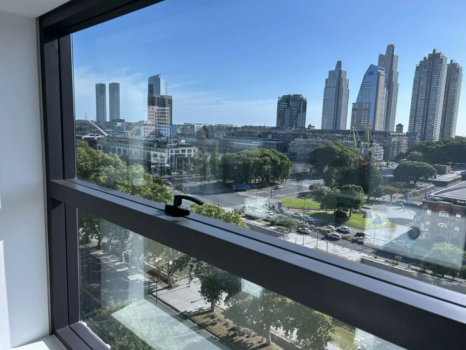 Apartamento em Puerto Madero com 1 quarto. Acabamentos incluem esquadrias de alumínio com janelas DVH e pisos internos em mosaico granítico pré-polido. Banheiros com revestimento cerâmico no box de ducha, louças e metais monocomando, além de espelho no lavatório; cozinhas com bancadas e revestimentos em quartzo tipo Silestone Branco Norte.