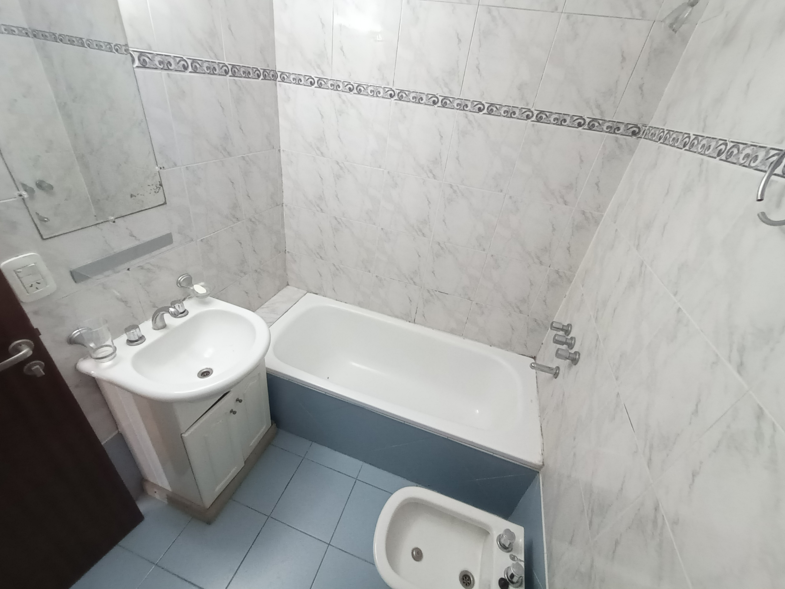 Apartamento de 2 ambientes em Torres de Quilmes, Torre I, no 12º andar. Sala de estar e jantar com saída para varanda ampla, cozinha instalada com móveis sob medida e armário aéreo, fogão de 4 bocas e exaustor. Lavanderia integrada à cozinha com tanque e instalação para máquina de lavar. 1 dormitório com carpete, armário embutido e ar-condicionado split, além de 1 banheiro completo com sanitários, torneiras, espelho e vanity. O complexo tem piscina e segurança 24 horas. O aluguel é de 500.000, c