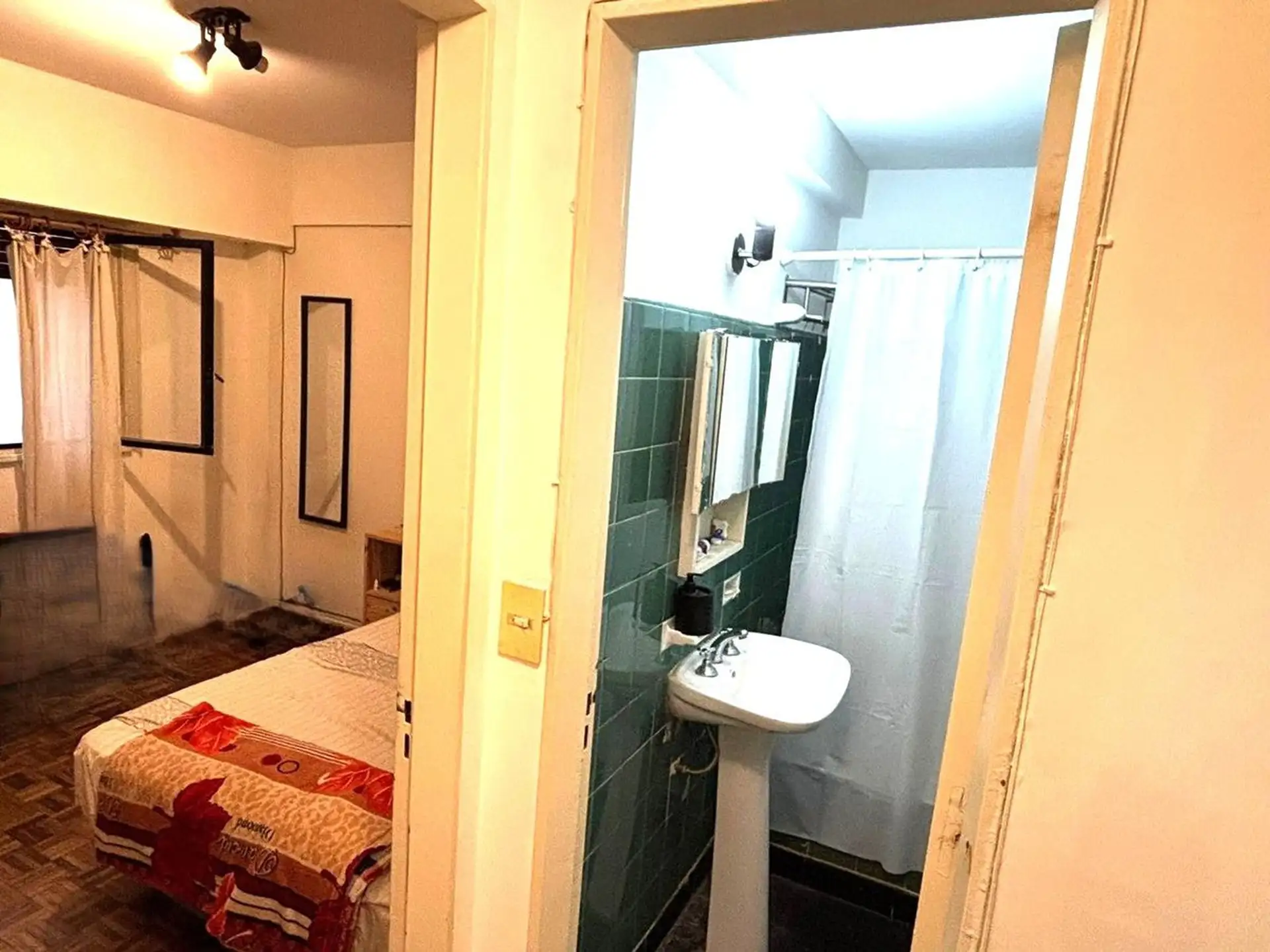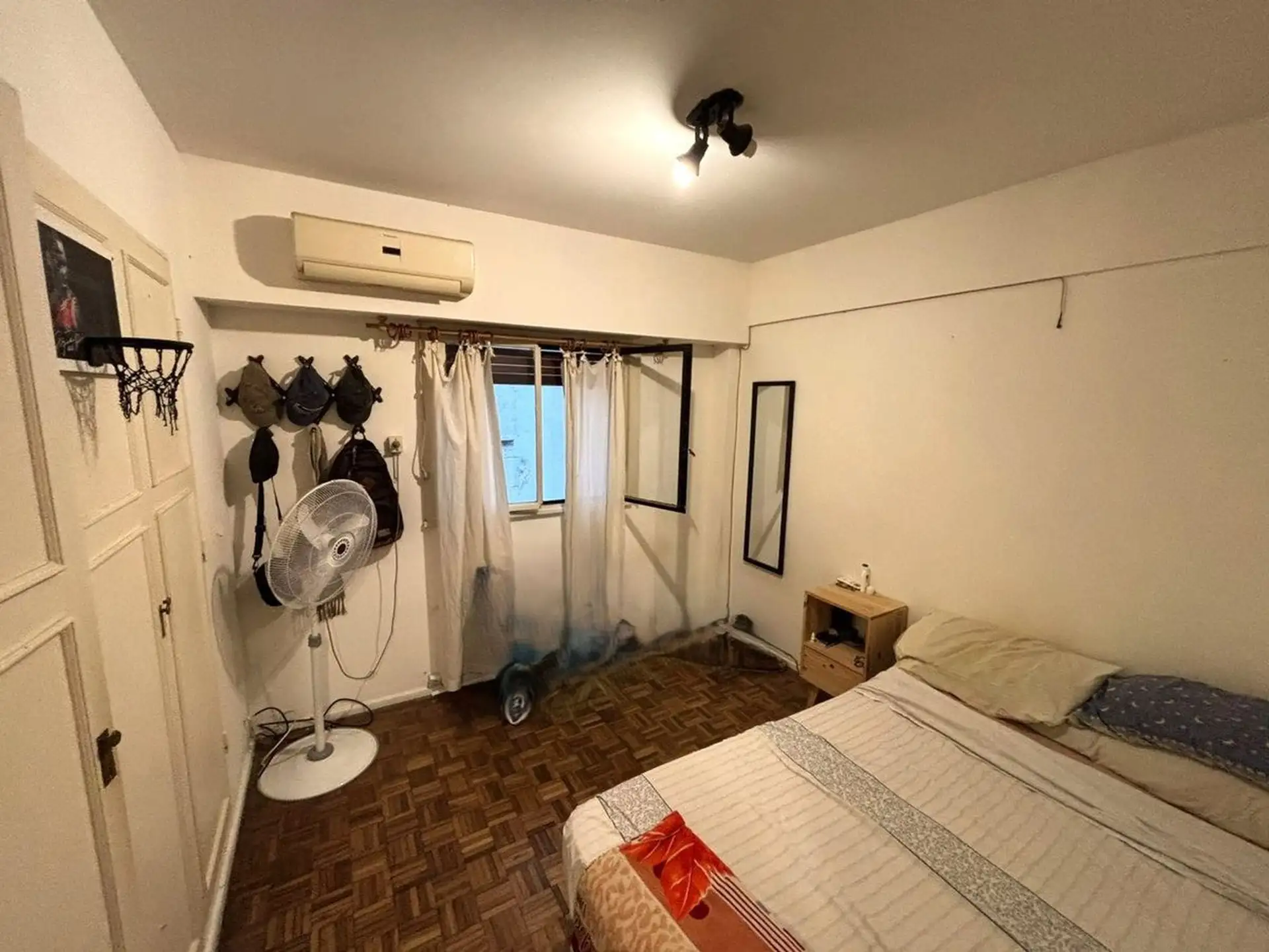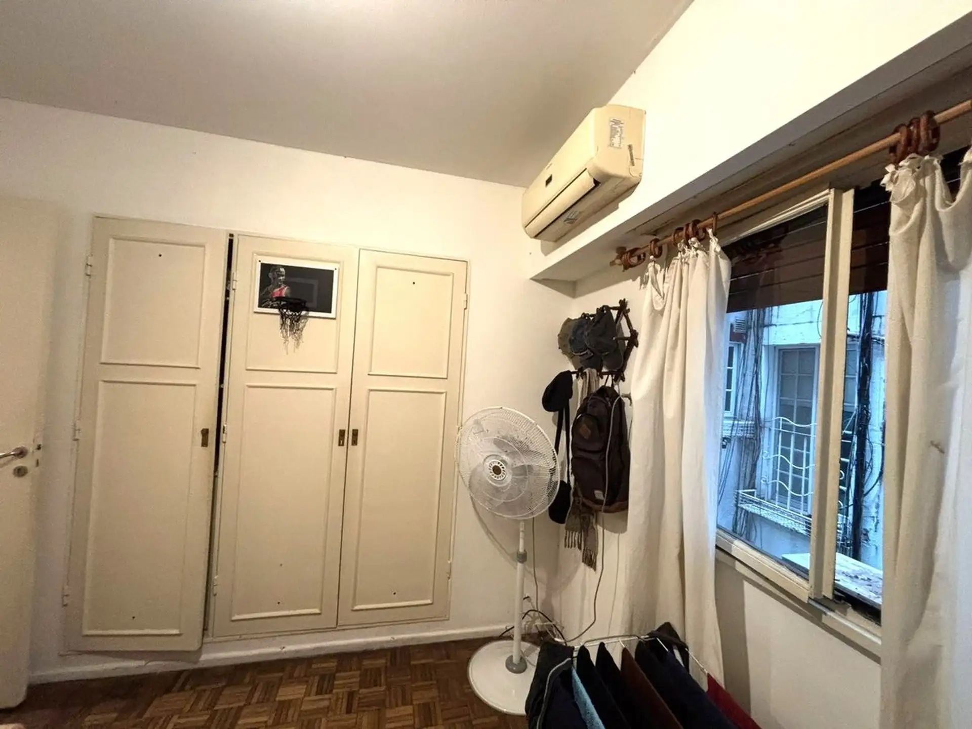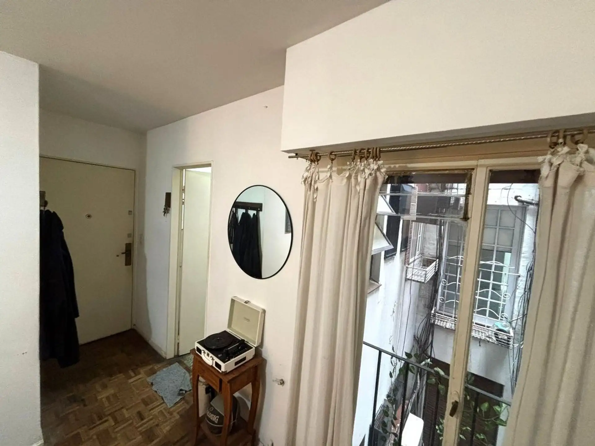 Apartamento de dois ambientes para aluguel na divisa entre Recoleta e Barrio Norte, em Av. Pueyrredón. A unidade fica de fundos (contrafrente), com todos os ambientes voltados para janelas e sala de estar e jantar com varanda francesa. Inclui quarto com armário embutido, ar-condicionado, banheiro completo com banheira e cozinha independente com espaço para máquina de lavar; é oferecido sem mobília. O prédio tem encarregado e elevador.