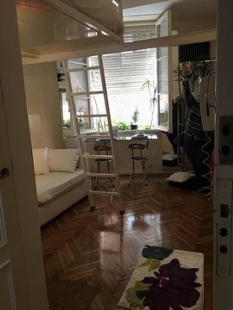 Kitnet em Recoleta, tipo studio, com mezanino e 28 m². Fica de frente para a Plaza Francia. Está mobiliada e equipada, com ar-condicionado e kitchenette completa. O preço anunciado é de US$ 550 para contrato normal ou temporário, com condomínio de ARS 140.000.