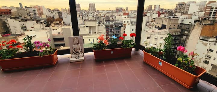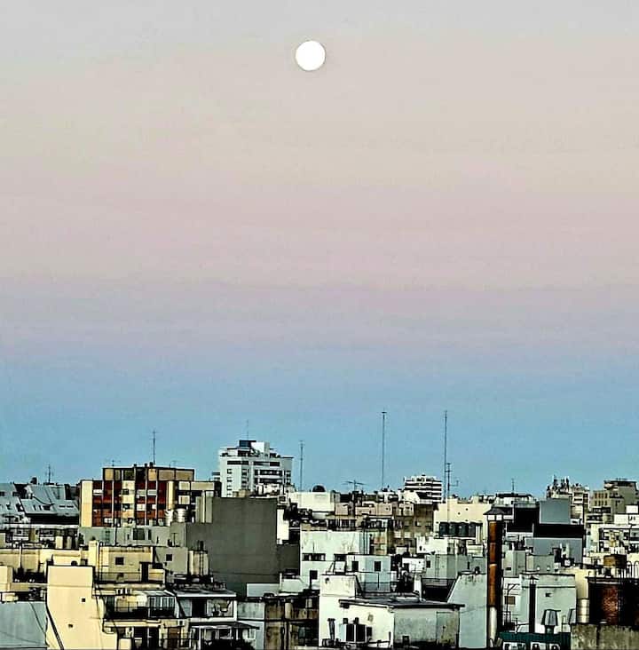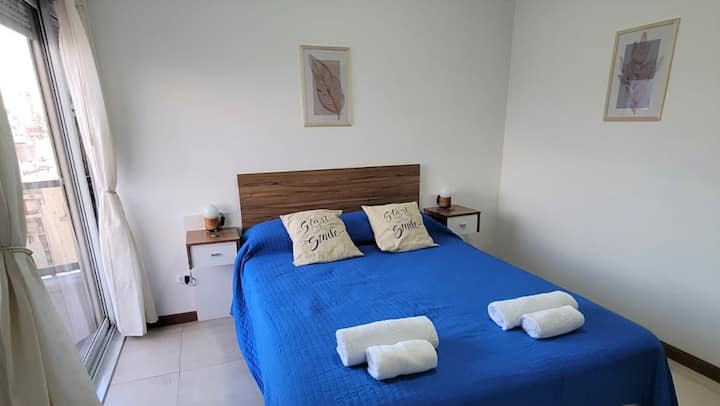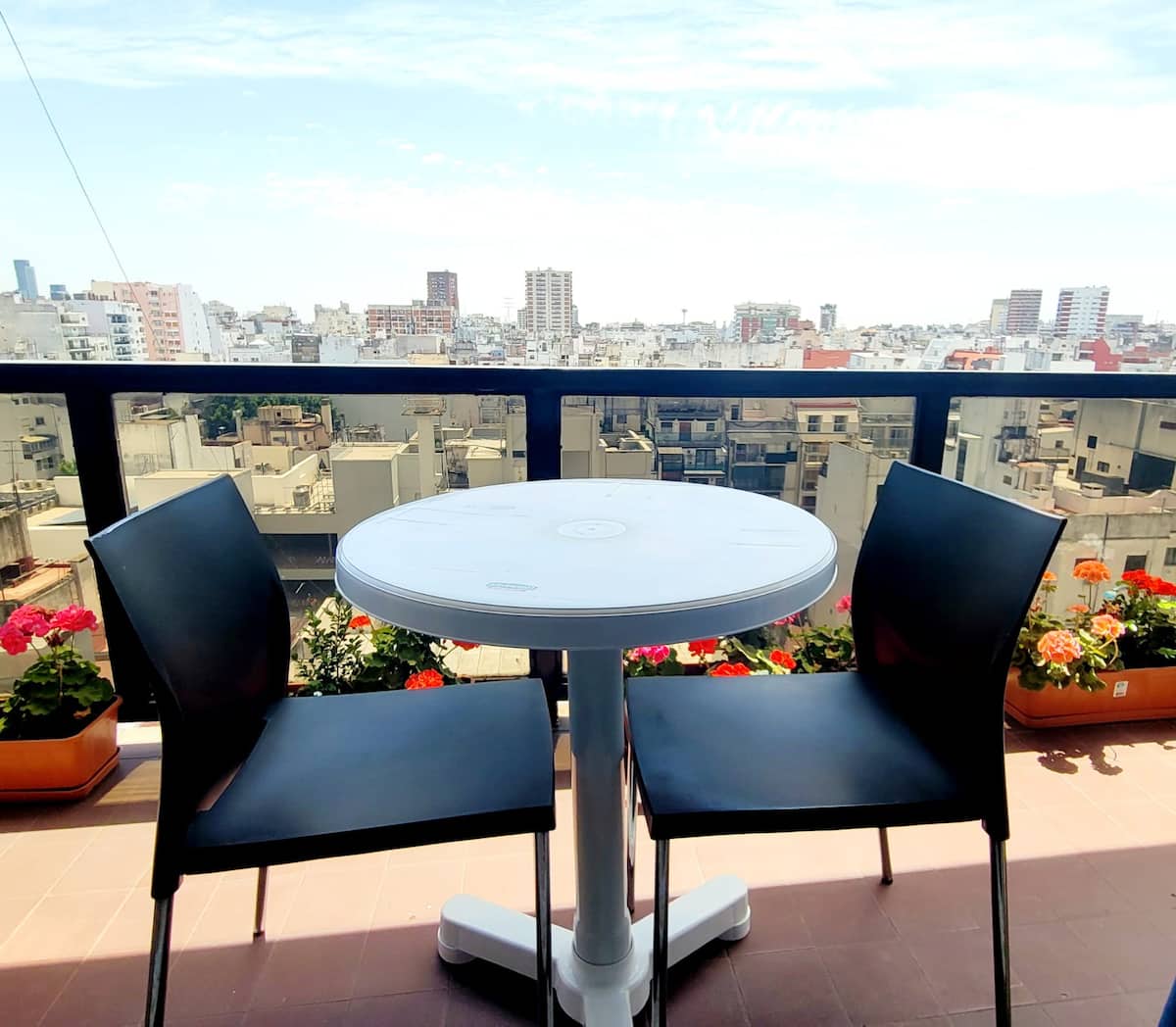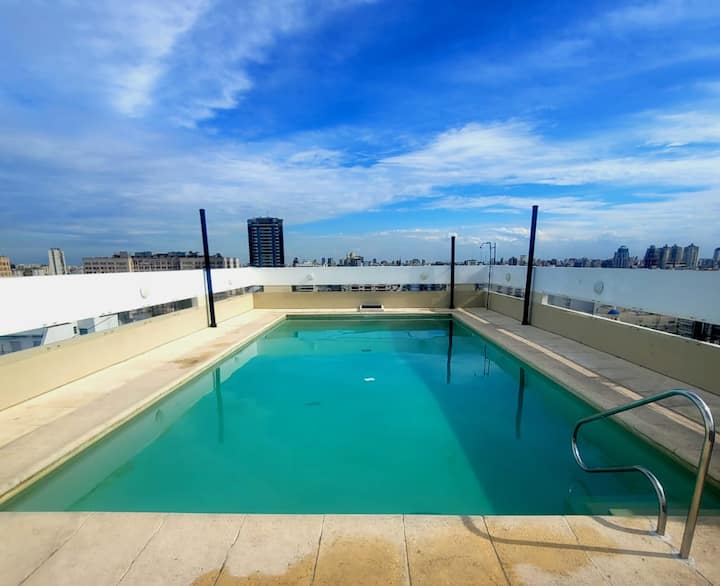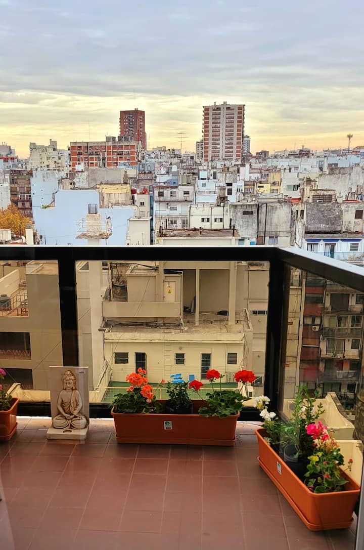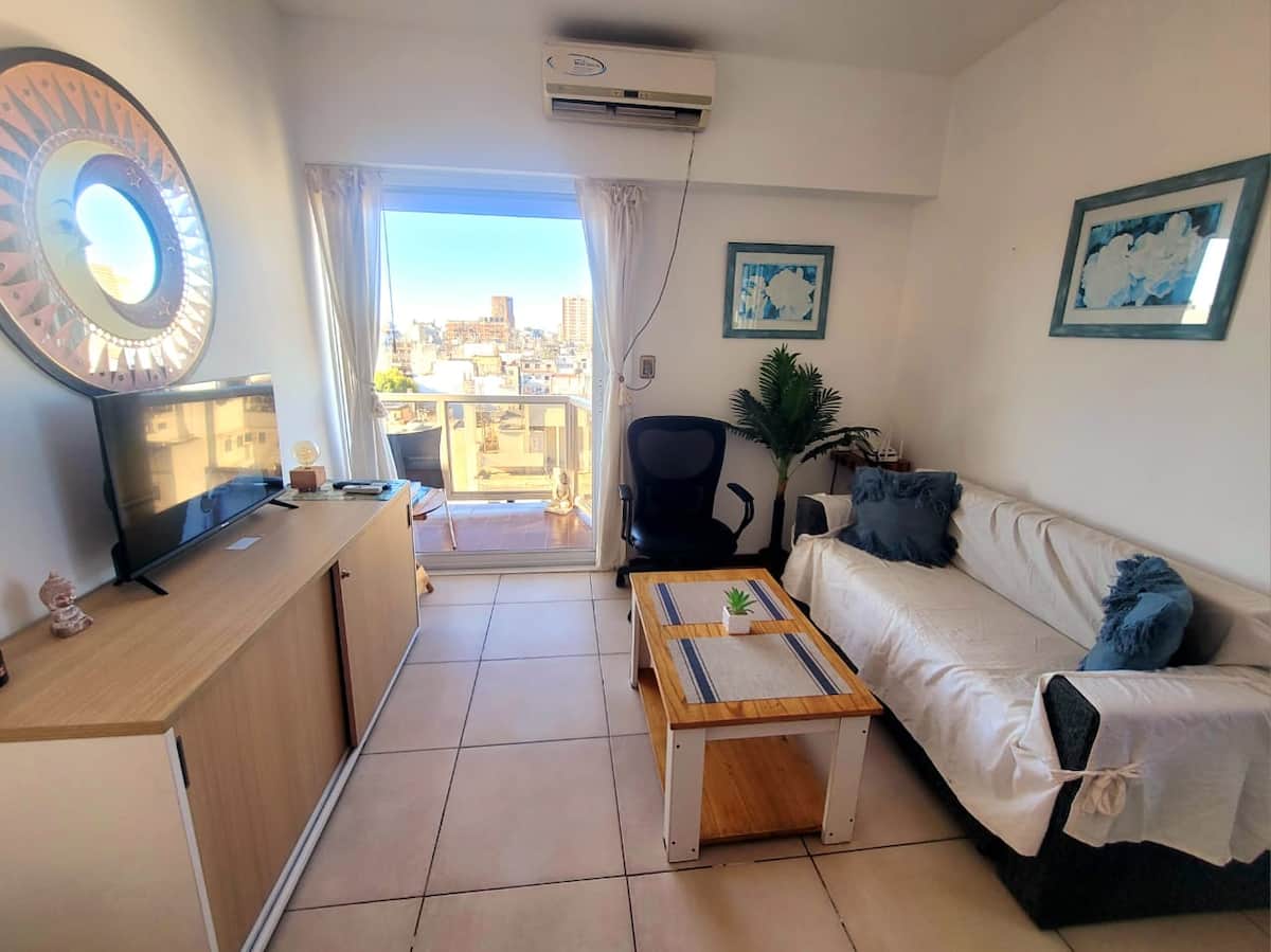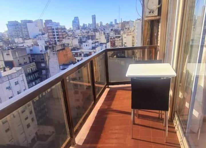 Apartamento em Recoleta com 1 quarto, sala com TV, Wi-Fi e ar-condicionado. Cozinha integrada, banheiro completo com vaso sanitário, bidê e banheira, e hall com ligação ao quarto com cama queen e armário grande. A varanda acompanha os 2 ambientes, com vista aberta para a cidade. O edifício tem piscina na cobertura e segurança 24 horas no lobby. Há micro-ondas, geladeira, roupa de cama, toalhas e água quente; TV com Fire Stick.