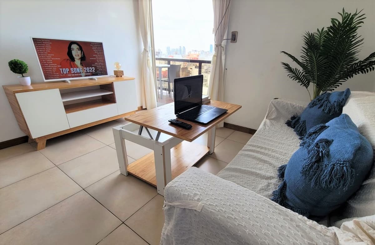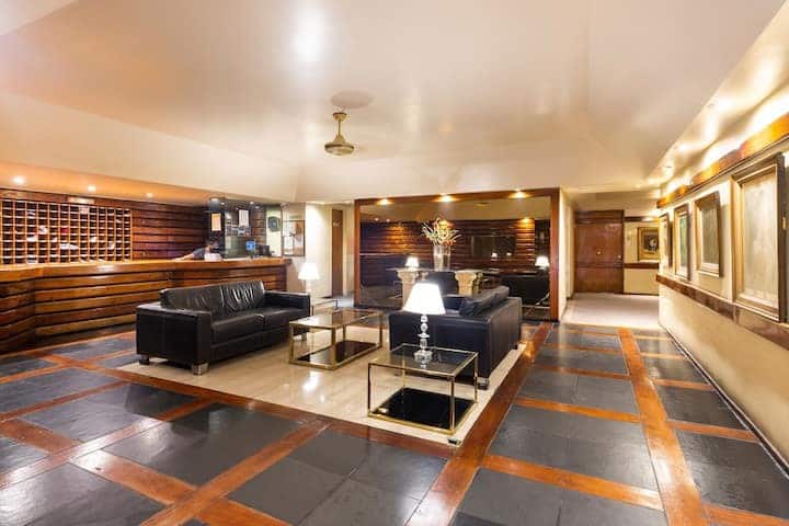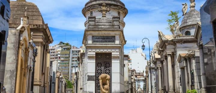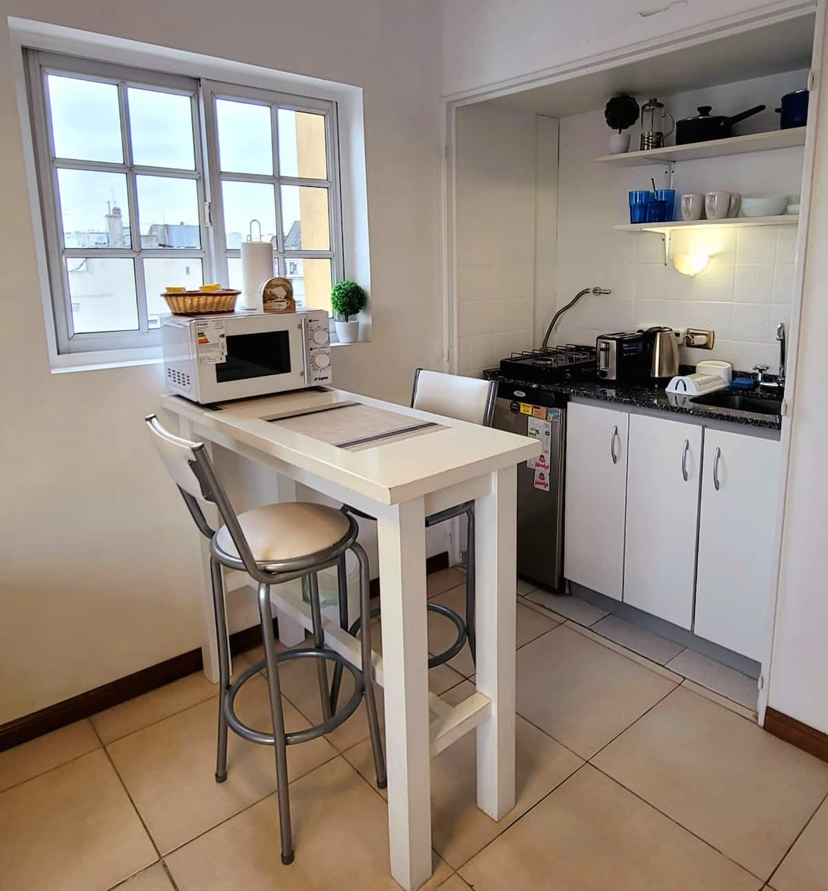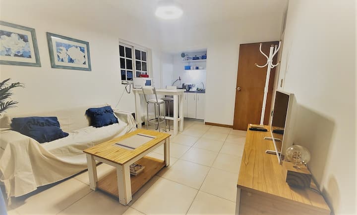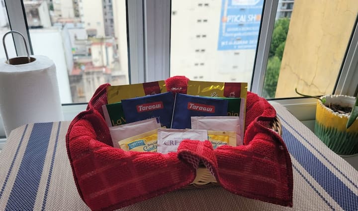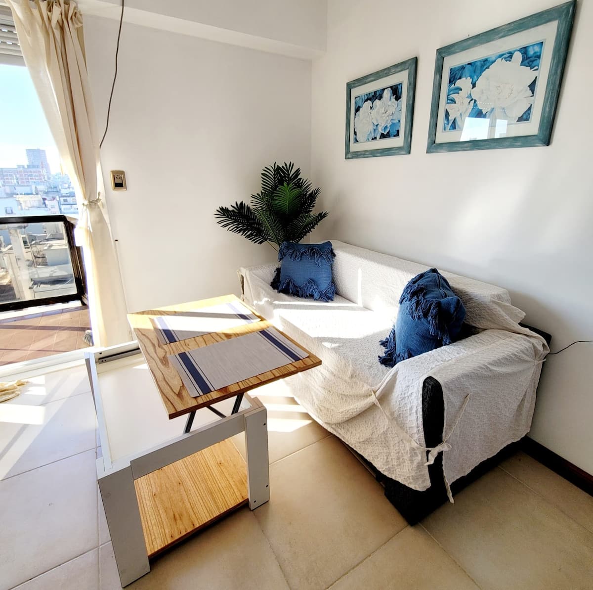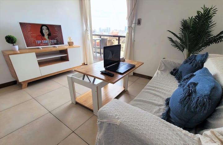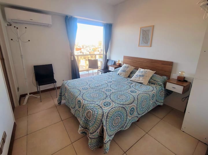 Apartamento em Recoleta com 1 quarto, sala com TV, Wi-Fi e ar-condicionado. Cozinha integrada, banheiro completo com vaso sanitário, bidê e banheira, e hall com ligação ao quarto com cama queen e armário grande. A varanda acompanha os 2 ambientes, com vista aberta para a cidade. O edifício tem piscina na cobertura e segurança 24 horas no lobby. Há micro-ondas, geladeira, roupa de cama, toalhas e água quente; TV com Fire Stick.
