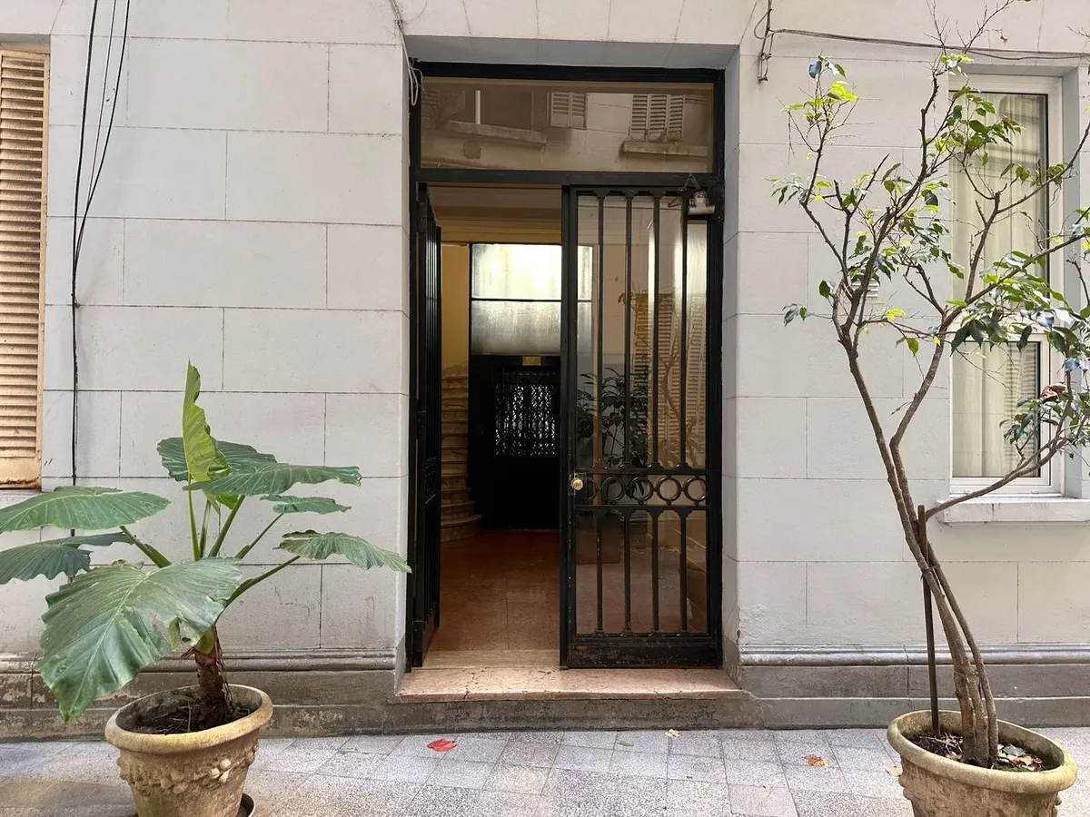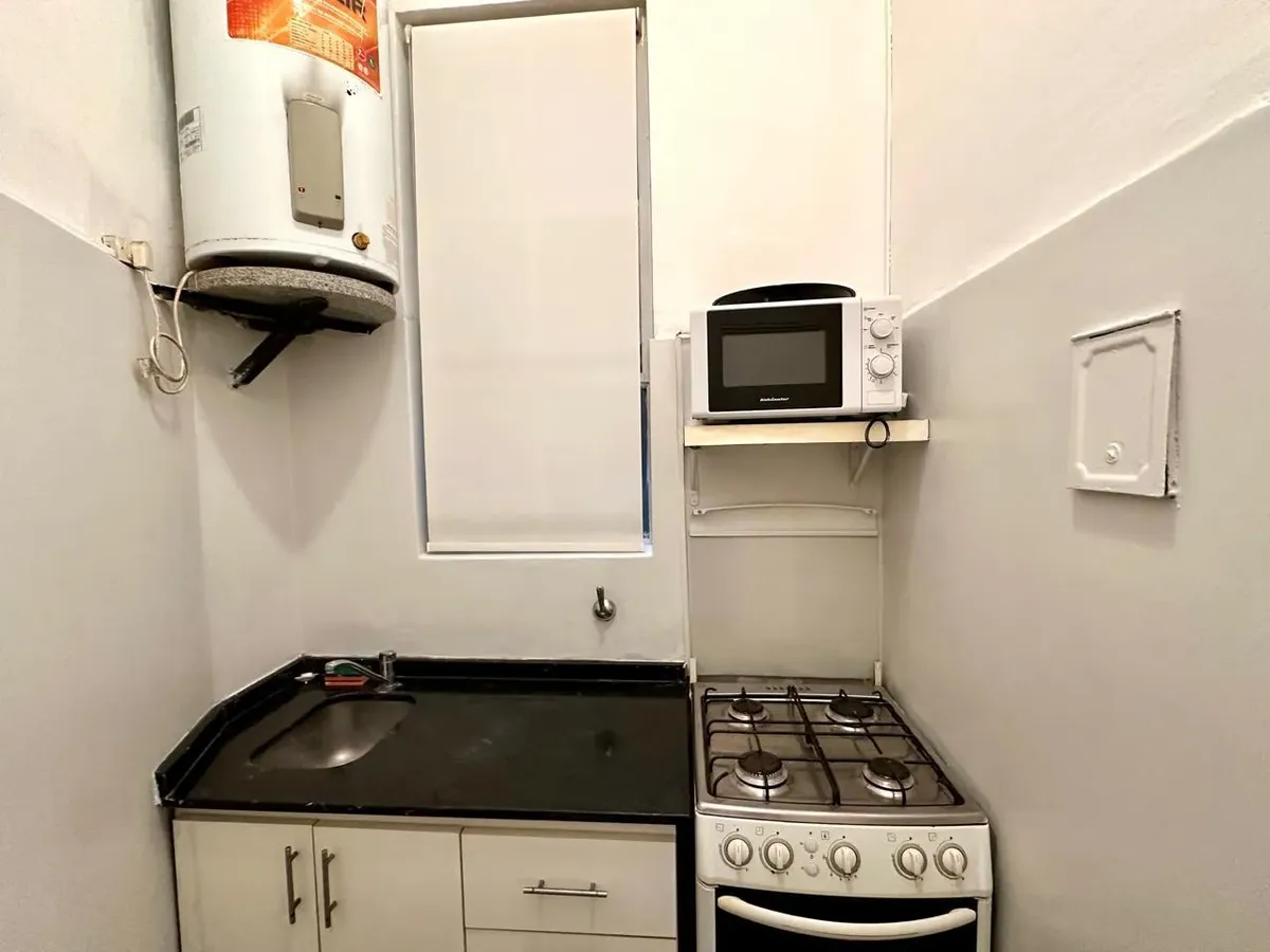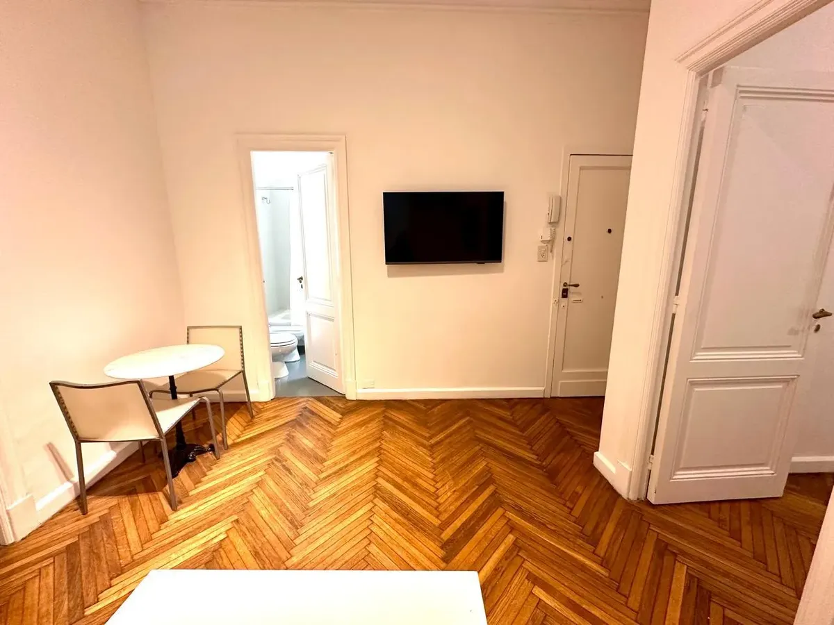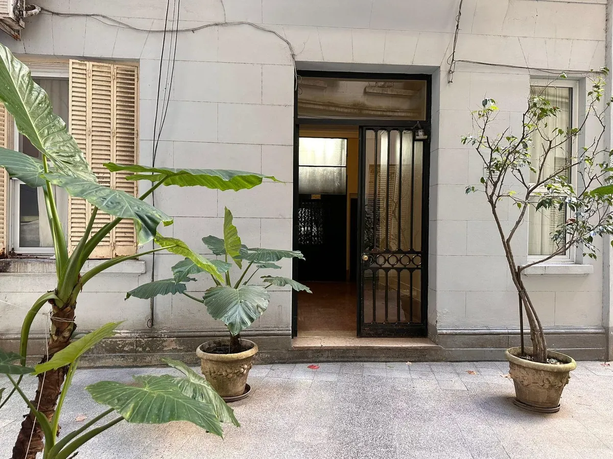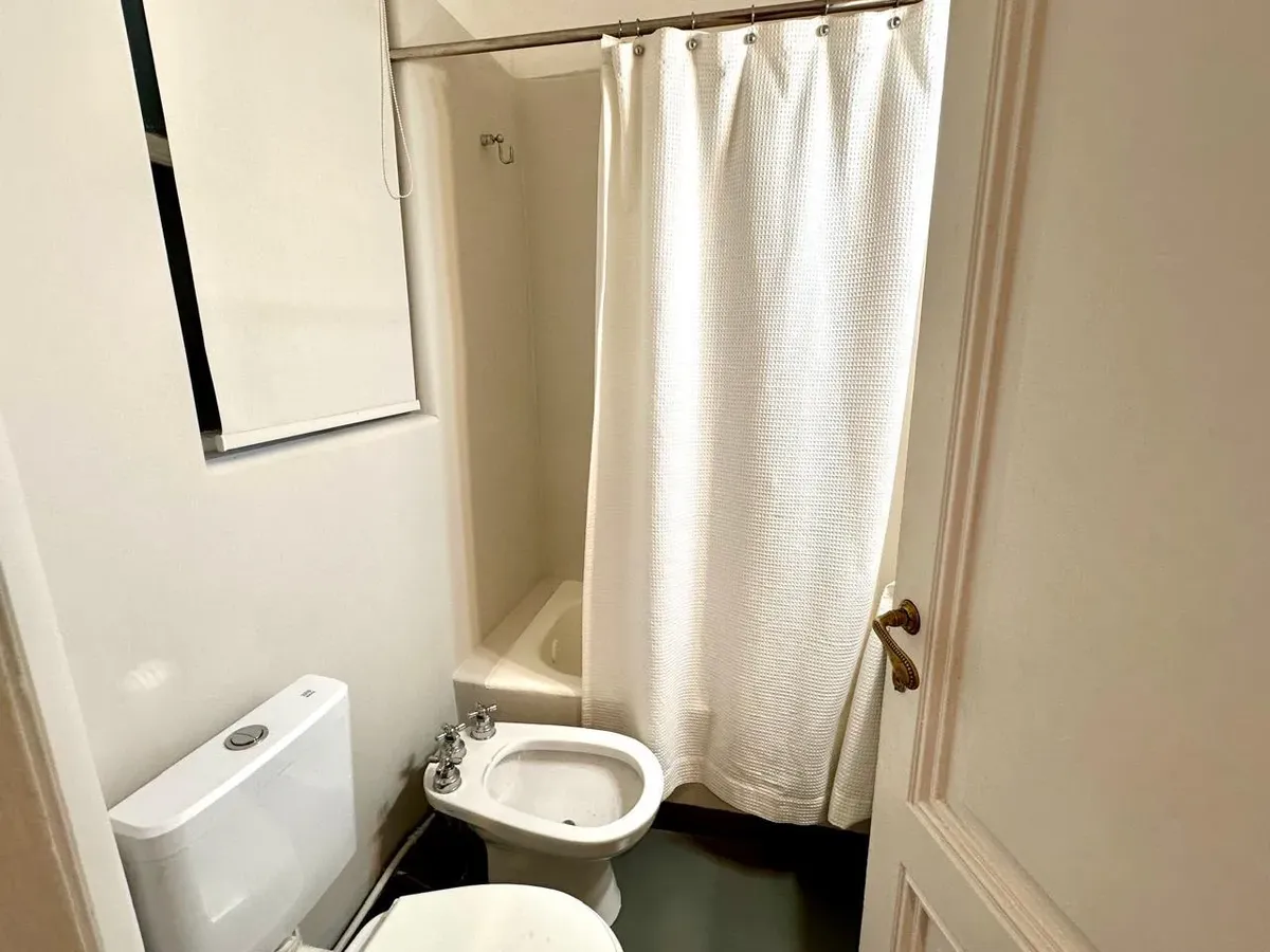 Apartamento de 2 ambientes em Recoleta, em bom estado, semimobiliado. Fica no 1º dormitório com cama de casal e amplo armário, banheiro completo e sala de estar integrada com sala de jantar. A cozinha é semi-equipada com micro-ondas e geladeira; há ar-condicionado (F/C) e cortinas na sala e no dormitório. O prédio tem dois blocos, jardim nos fundos e elevador, com acesso à cobertura e zelador residente. Serviços individuais. Medidas aproximadas, a confirmar na documentação.