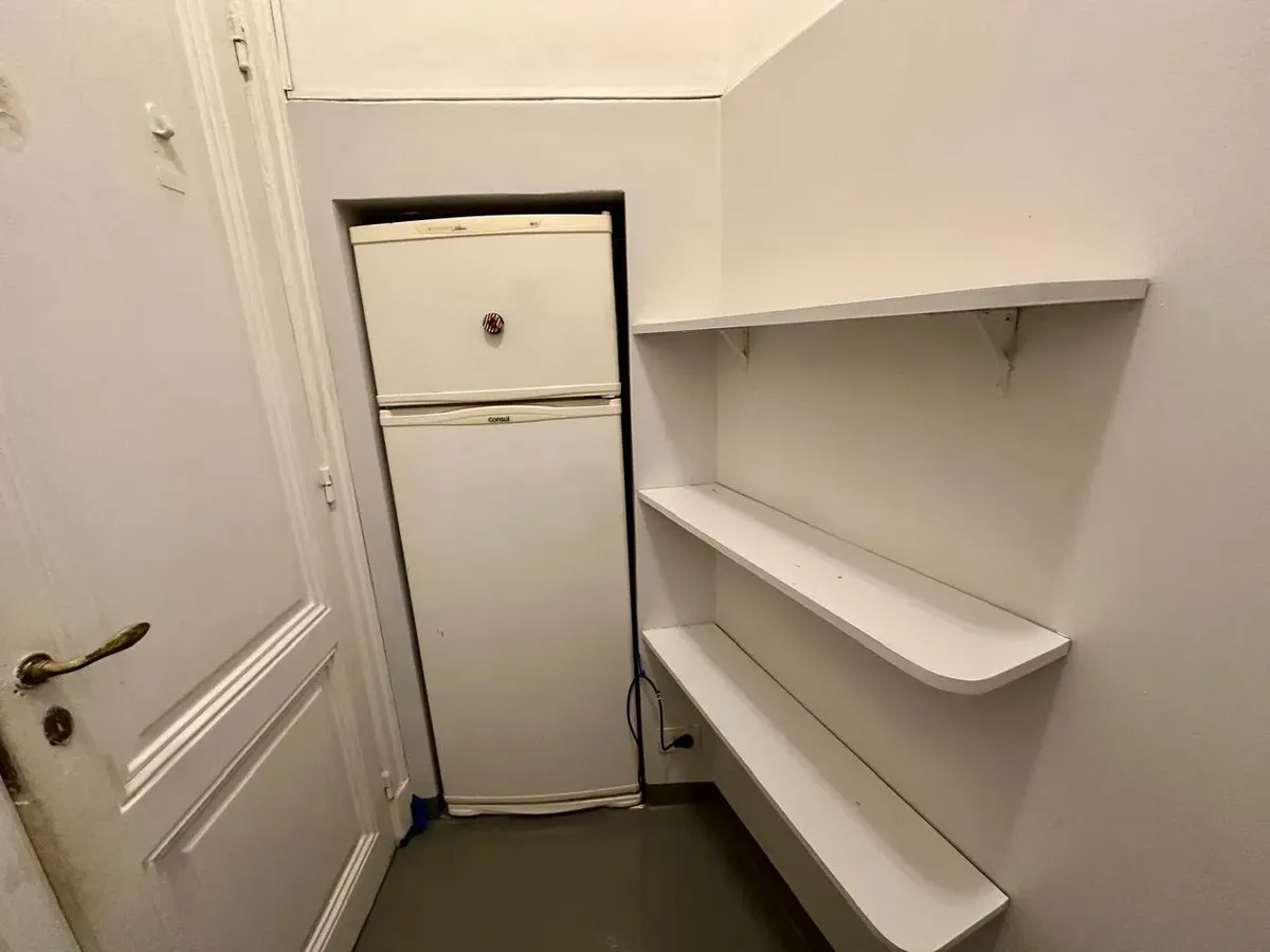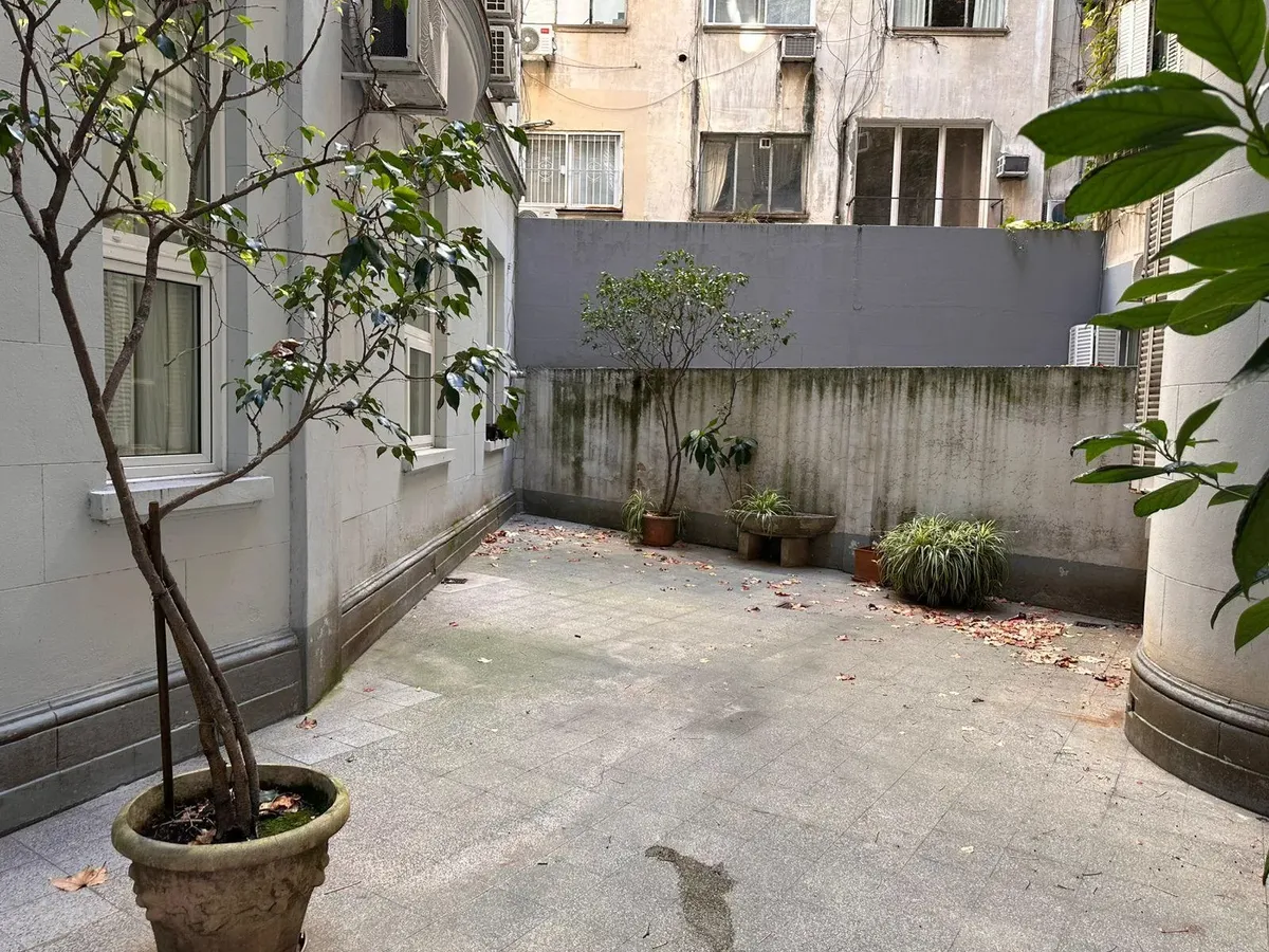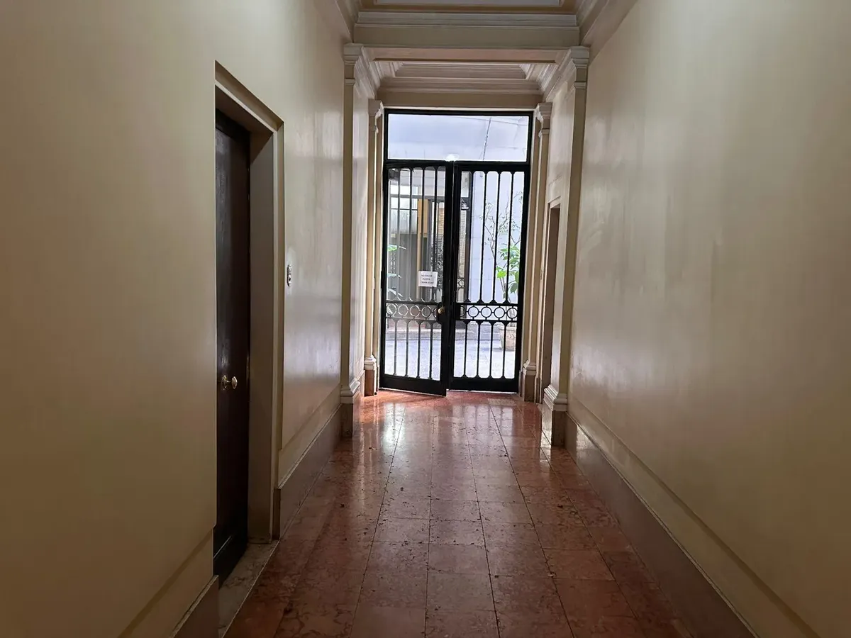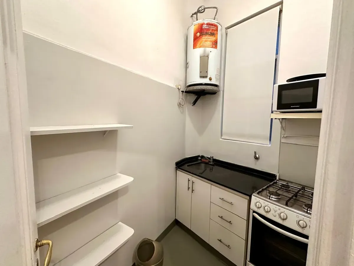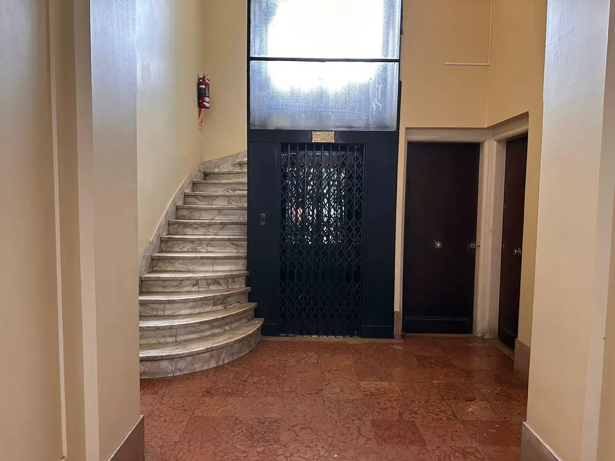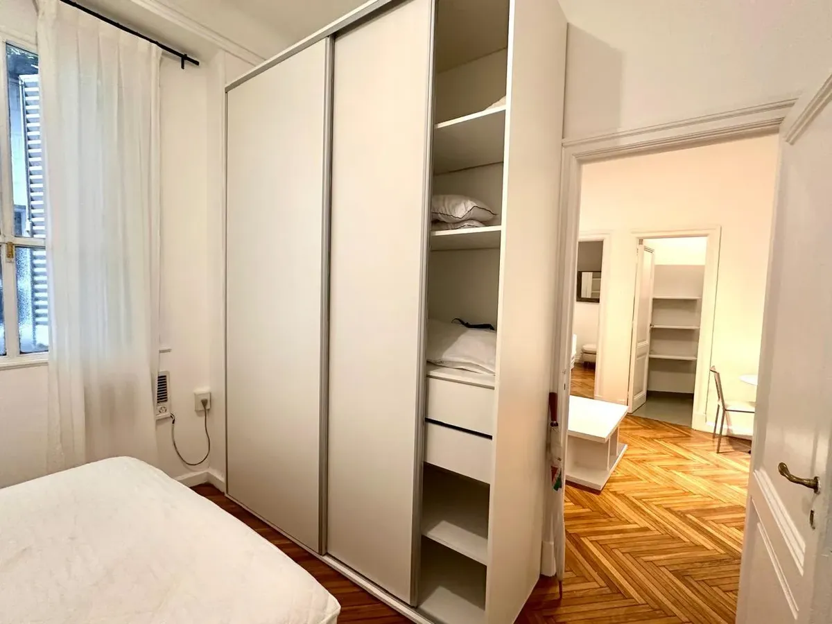 Apartamento de 2 ambientes em Recoleta, em bom estado, semimobiliado. Fica no 1º dormitório com cama de casal e amplo armário, banheiro completo e sala de estar integrada com sala de jantar. A cozinha é semi-equipada com micro-ondas e geladeira; há ar-condicionado (F/C) e cortinas na sala e no dormitório. O prédio tem dois blocos, jardim nos fundos e elevador, com acesso à cobertura e zelador residente. Serviços individuais. Medidas aproximadas, a confirmar na documentação.