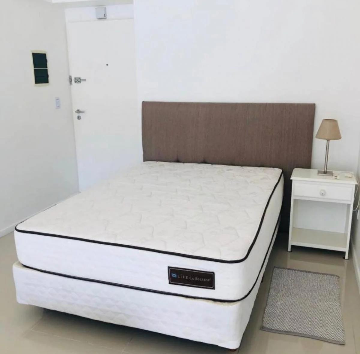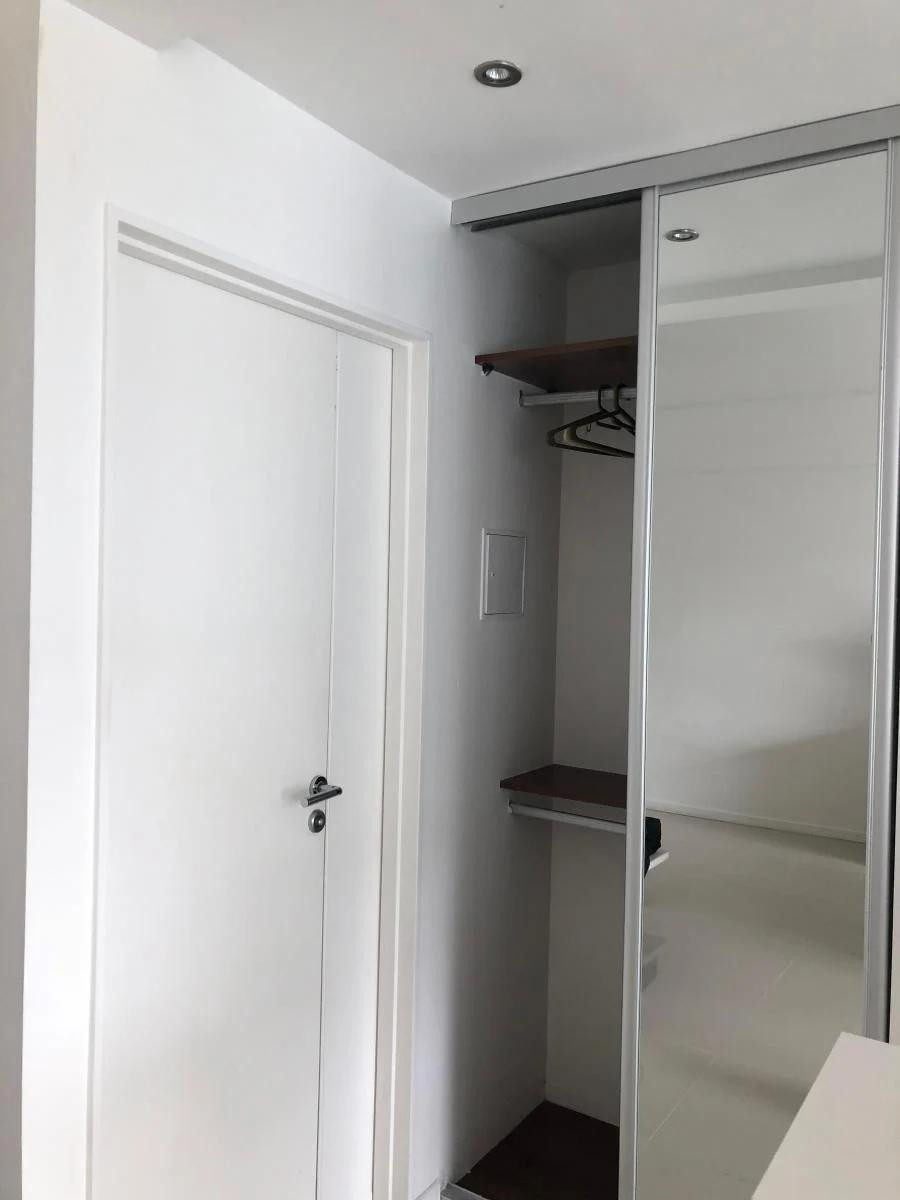 Apartamento tipo kitnet mobiliado e equipado, com 1 banheiro e varanda, em uma torre. A unidade tem cozinha integrada com barra e mobiliário, com geladeira e micro-ondas, além de saída para varanda com vista aberta para os fundos. O prédio oferece segurança 24 horas com acesso por token, com academia, salão de festas, terraços, área de churrasco e lavanderia. Condomínio e serviços são pagos à parte.