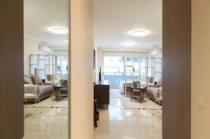 Apartamento mobiliado para aluguel temporário em Recoleta. Disponível a partir de 09/07. Possui ar-condicionado frio-quente, cama de casal king size e sofá-cama para duas pessoas, com cortinas blackout e janelas amplas de frente com vidro isolante térmico e acústico, além de varanda privativa. A cozinha tem fogão elétrico vitrocerâmico, forno, micro-ondas, geladeira com freezer, cafeteira, torradeira e chaleira elétrica; inclui louça para 4 pessoas. O banheiro é completo. O imóvel conta com roup