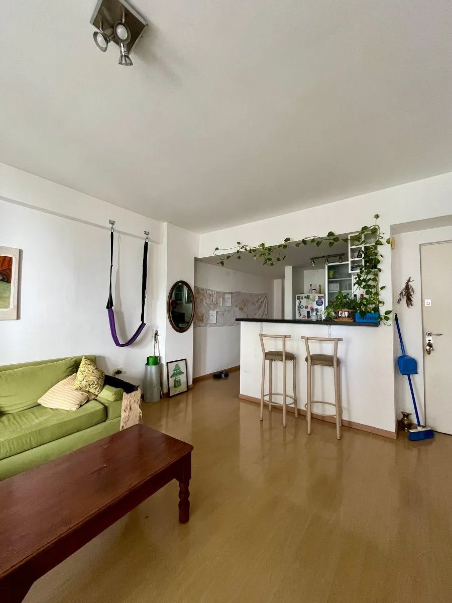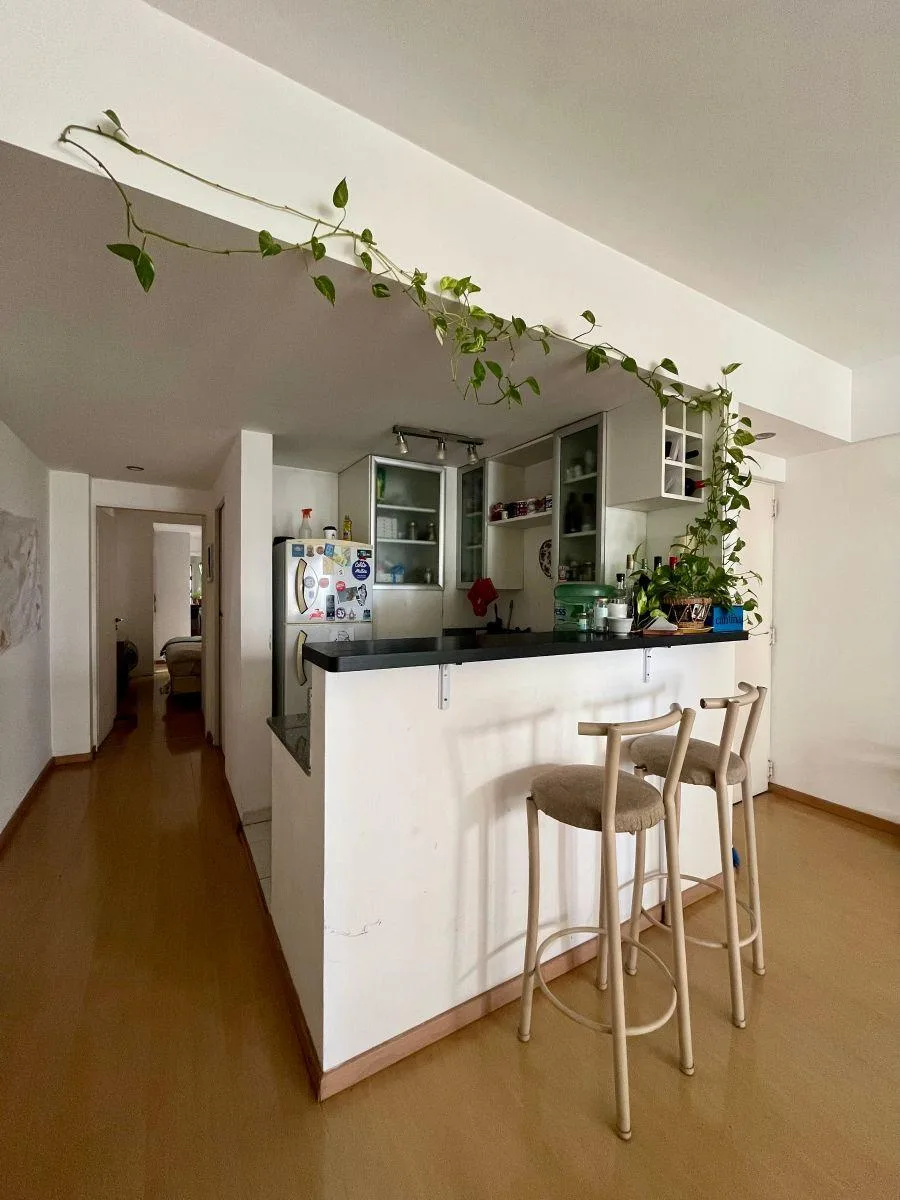 Apartamento de dois ambientes com 1 quarto, com sala de estar e jantar e acesso a uma varanda. Cozinha integrada com barra para refeições. Banheiro completo com cuba em área separada, pisos de madeira e ar-condicionado. O aluguel mensal inclui condomínio, internet de alta velocidade e ABL; a eletricidade não está incluída. Disponível por 6 meses a partir de abril.