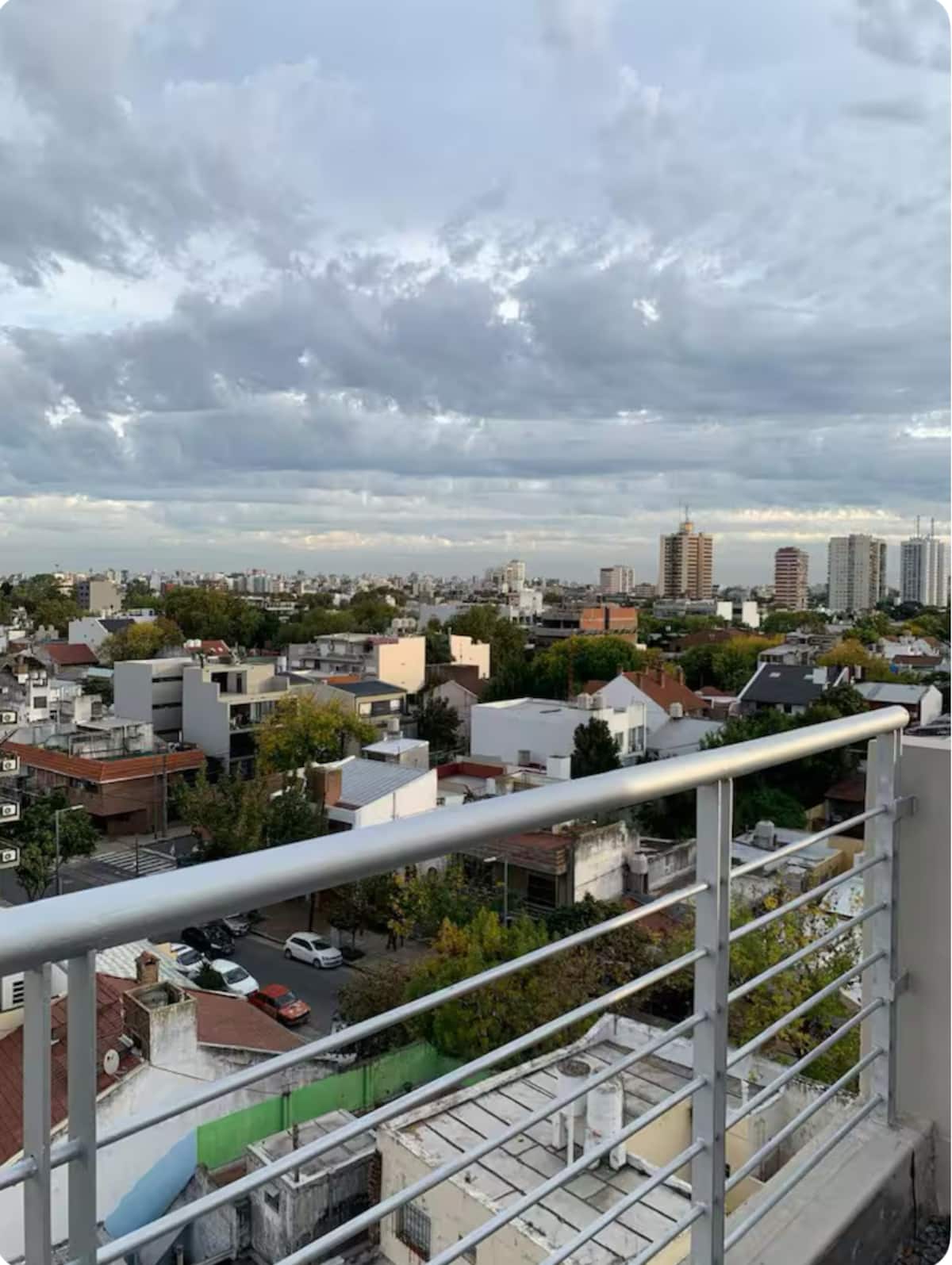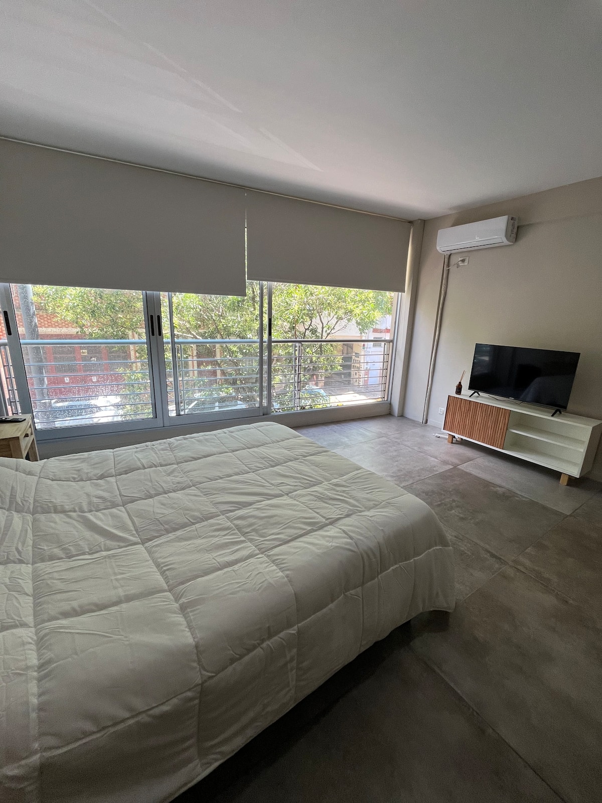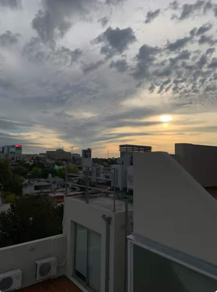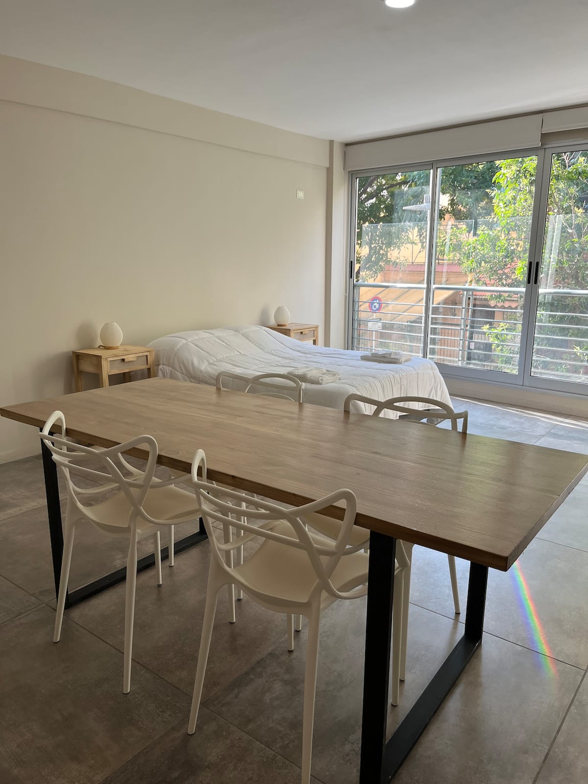 Studio em Saavedra, unidade 1B, com cozinha equipada e varanda privativa. Conta com mesa para 4 pessoas, Smart TV, Wi-Fi de alta velocidade e banheiro com chuveiro com água quente. Cozinha com geladeira, cooktop, micro-ondas, torradeira e cafeteira. No sexto andar há acesso a espaço compartilhado no último piso para trabalho compartilhado ou reuniões; o prédio tem elevador.