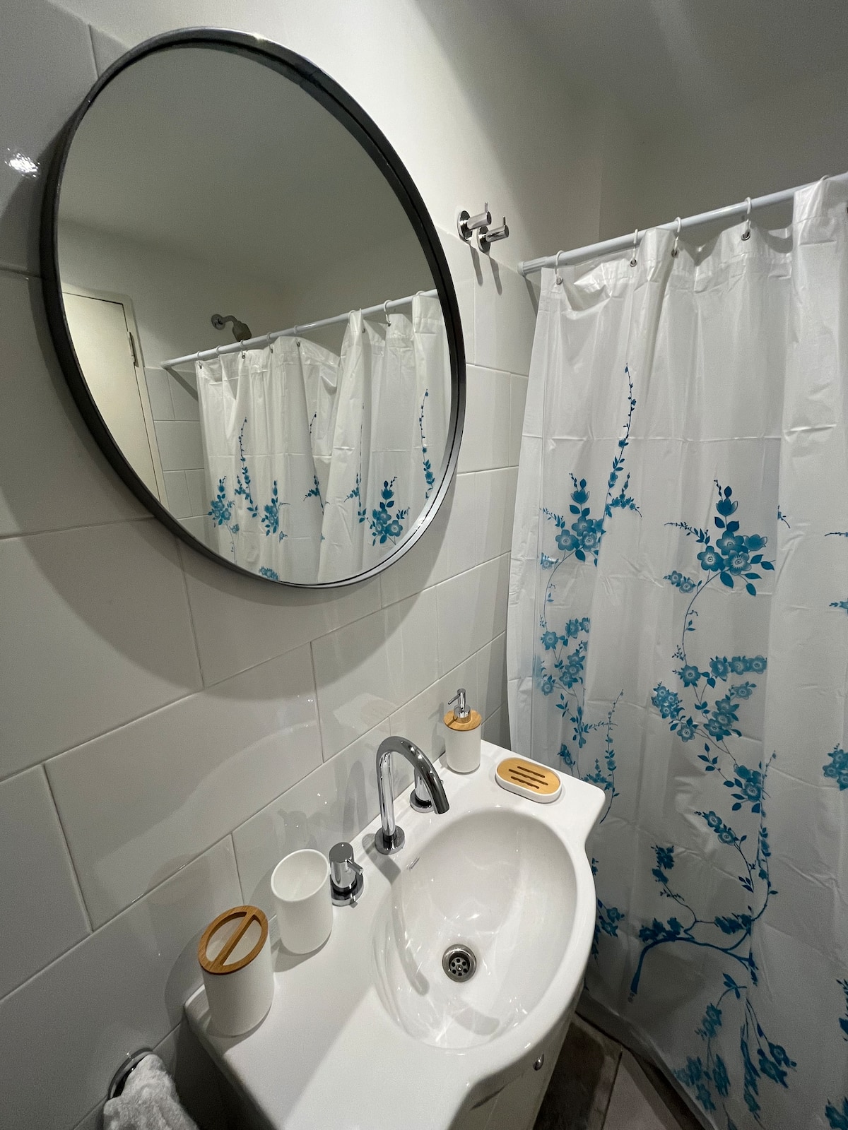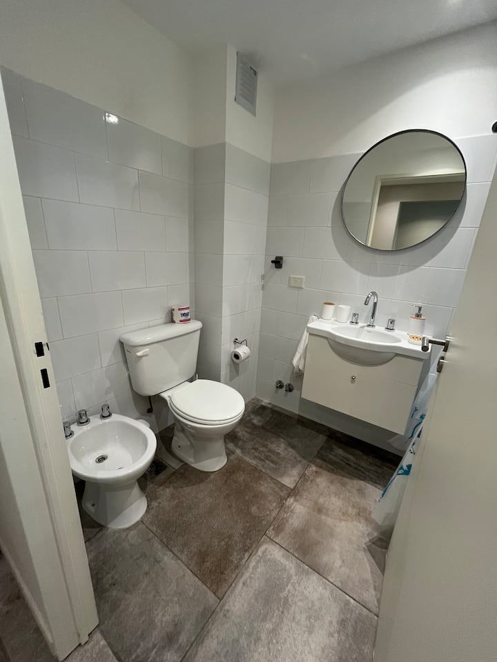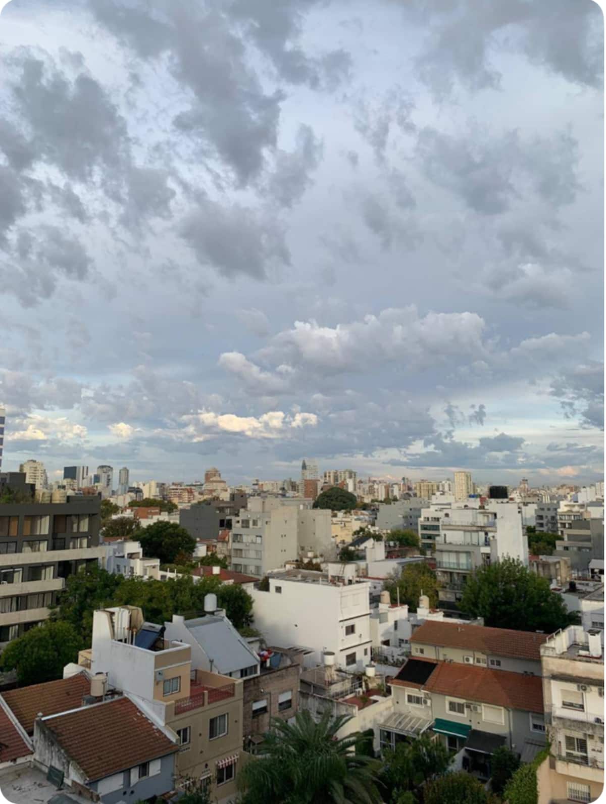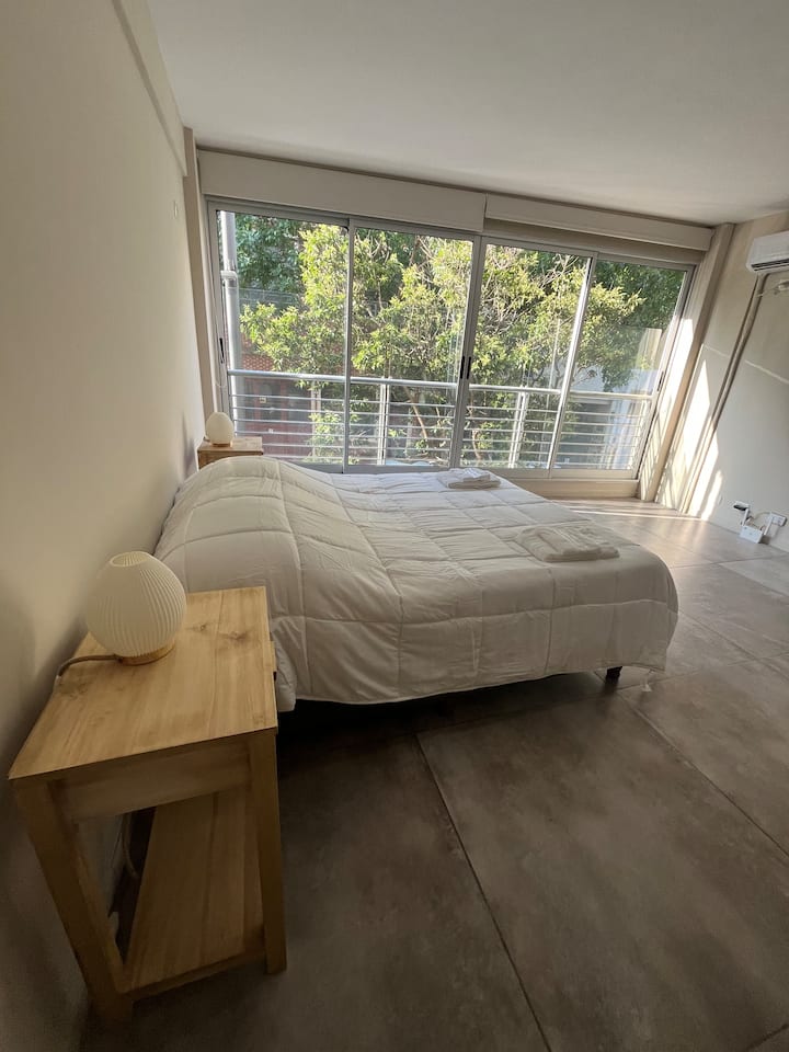 Studio em Saavedra, unidade 1B, com cozinha equipada e varanda privativa. Conta com mesa para 4 pessoas, Smart TV, Wi-Fi de alta velocidade e banheiro com chuveiro com água quente. Cozinha com geladeira, cooktop, micro-ondas, torradeira e cafeteira. No sexto andar há acesso a espaço compartilhado no último piso para trabalho compartilhado ou reuniões; o prédio tem elevador.